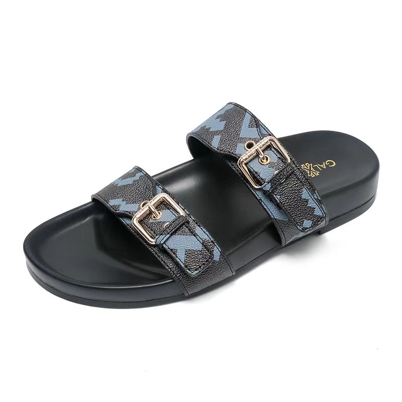 대외 무역 플러스 사이즈 플랫 바닥 새로운 대외 무역 유럽과 미국 여성 아우터웨어 플랫 바닥 금속 버클 더블 버클 레터 비치 샌들