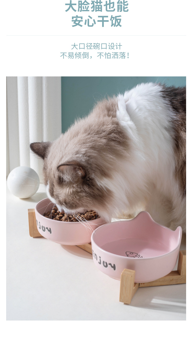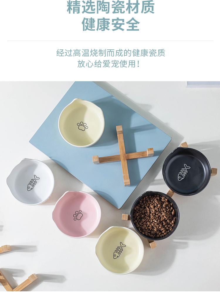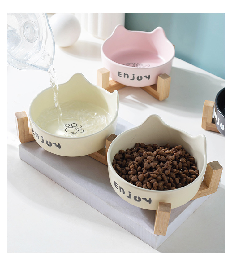• 고양이 귀 흰 고양이 발톱 생선 뼈 이중 그릇 + 이중 칸막이 나무 프레임