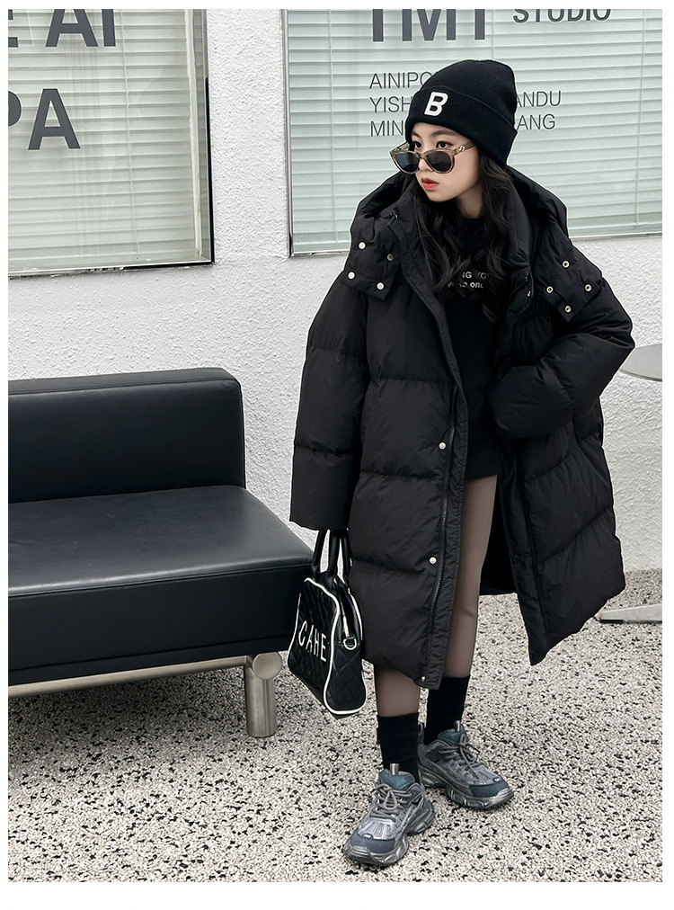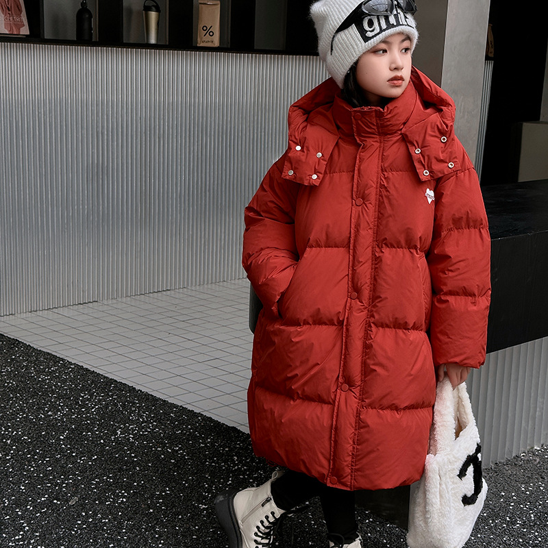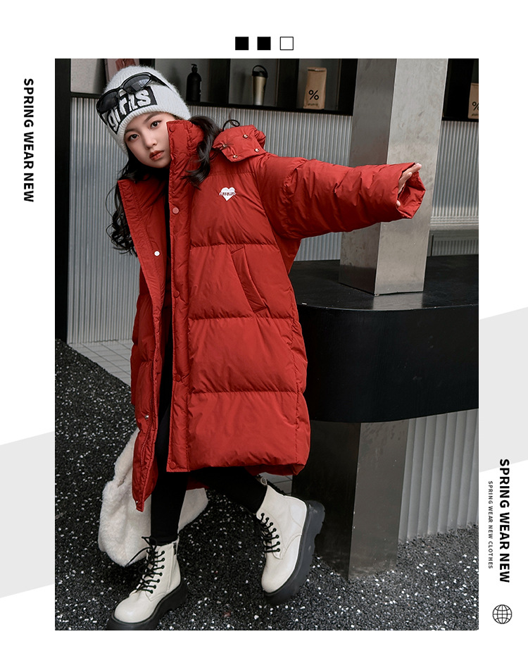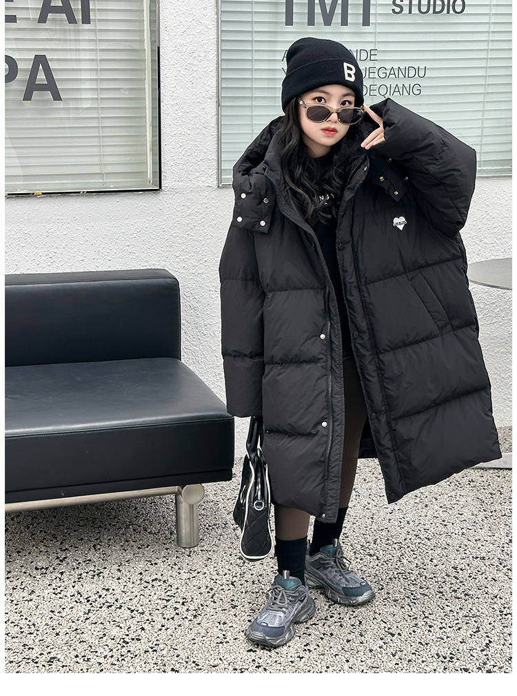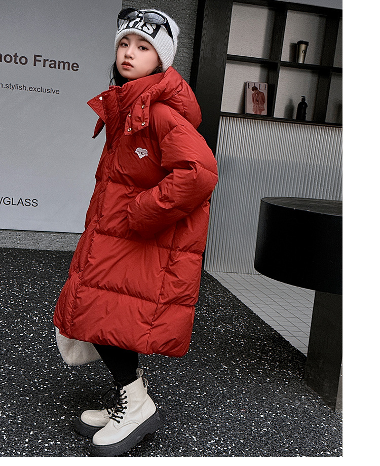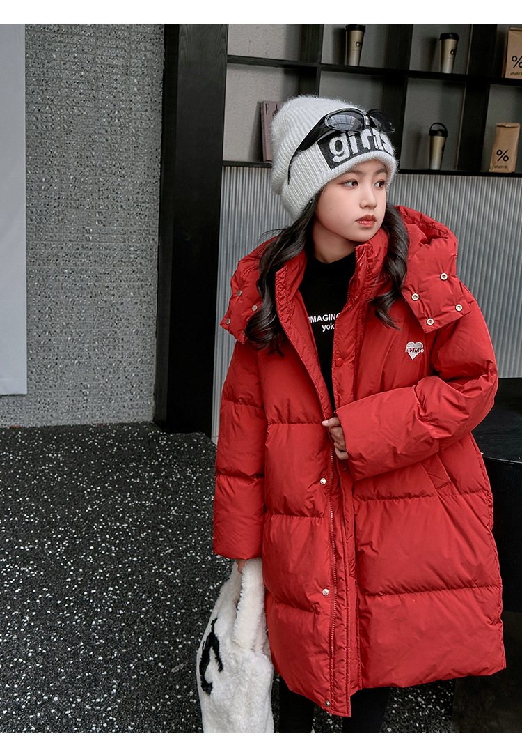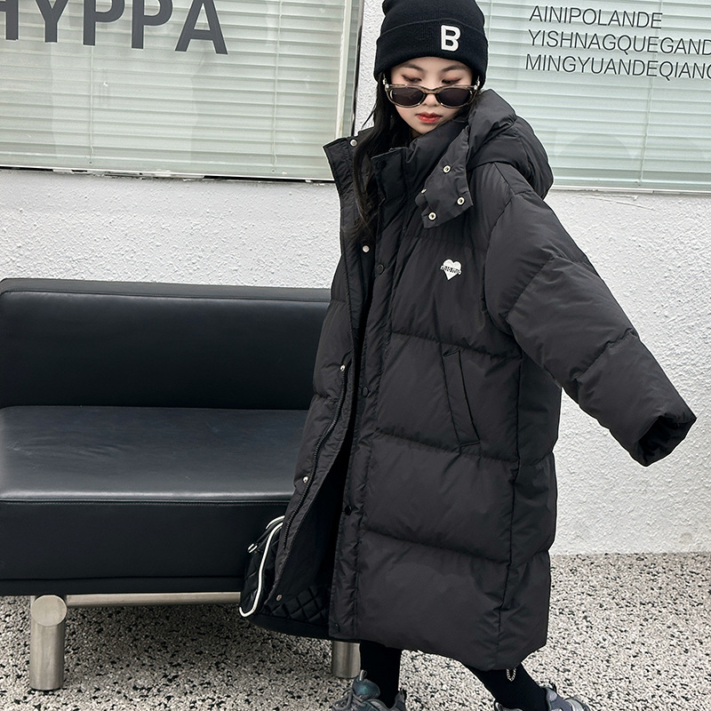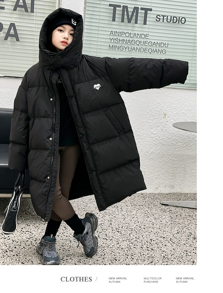소녀 겨울 옷 수 놓은 사랑 긴 부풀어 오른 흰색 오리 다운 재킷 2024 새로운 스타일 소녀의 두꺼운 후드 자켓 트렌디스토어 가기