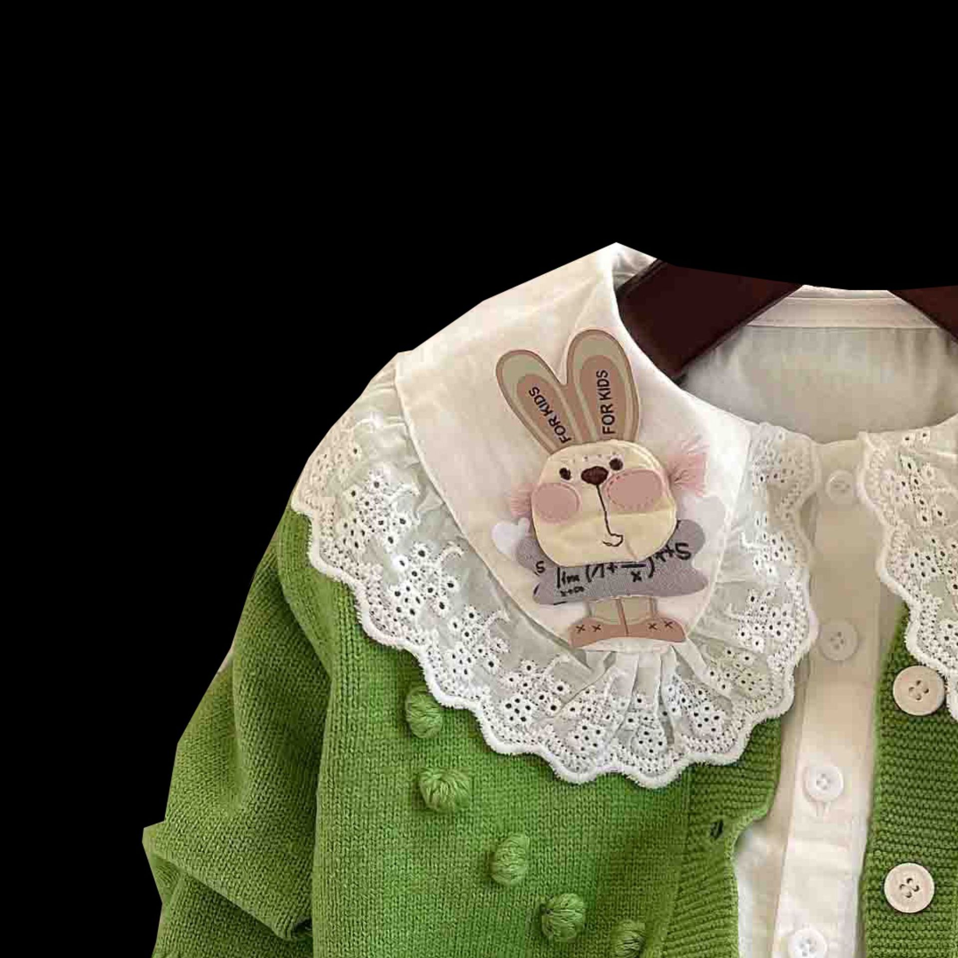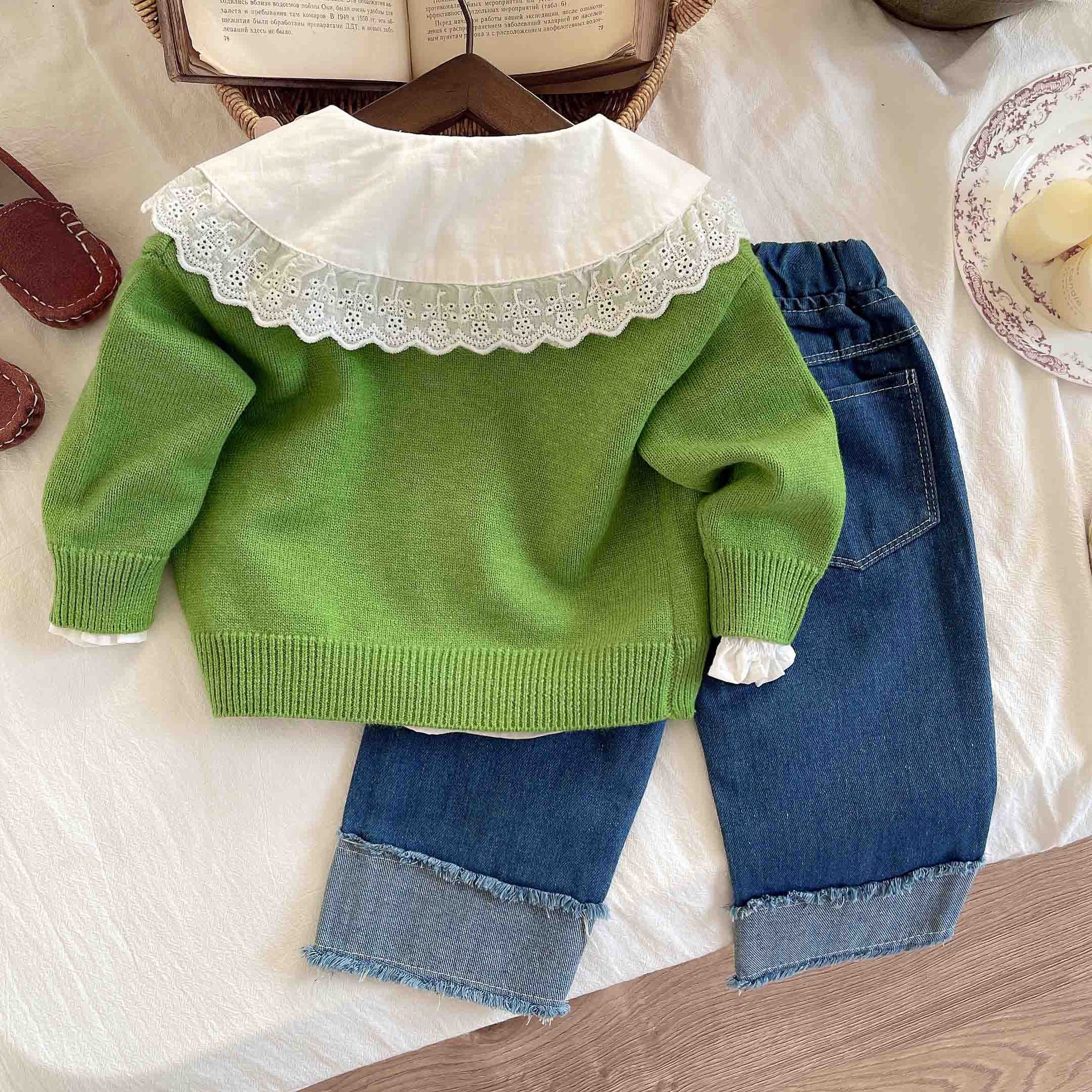 아기의 봄과 가을 스웨터 세트 신선한 녹색 스웨터 토끼 레이스 셔츠 토끼 머리 청바지 3 종 세트