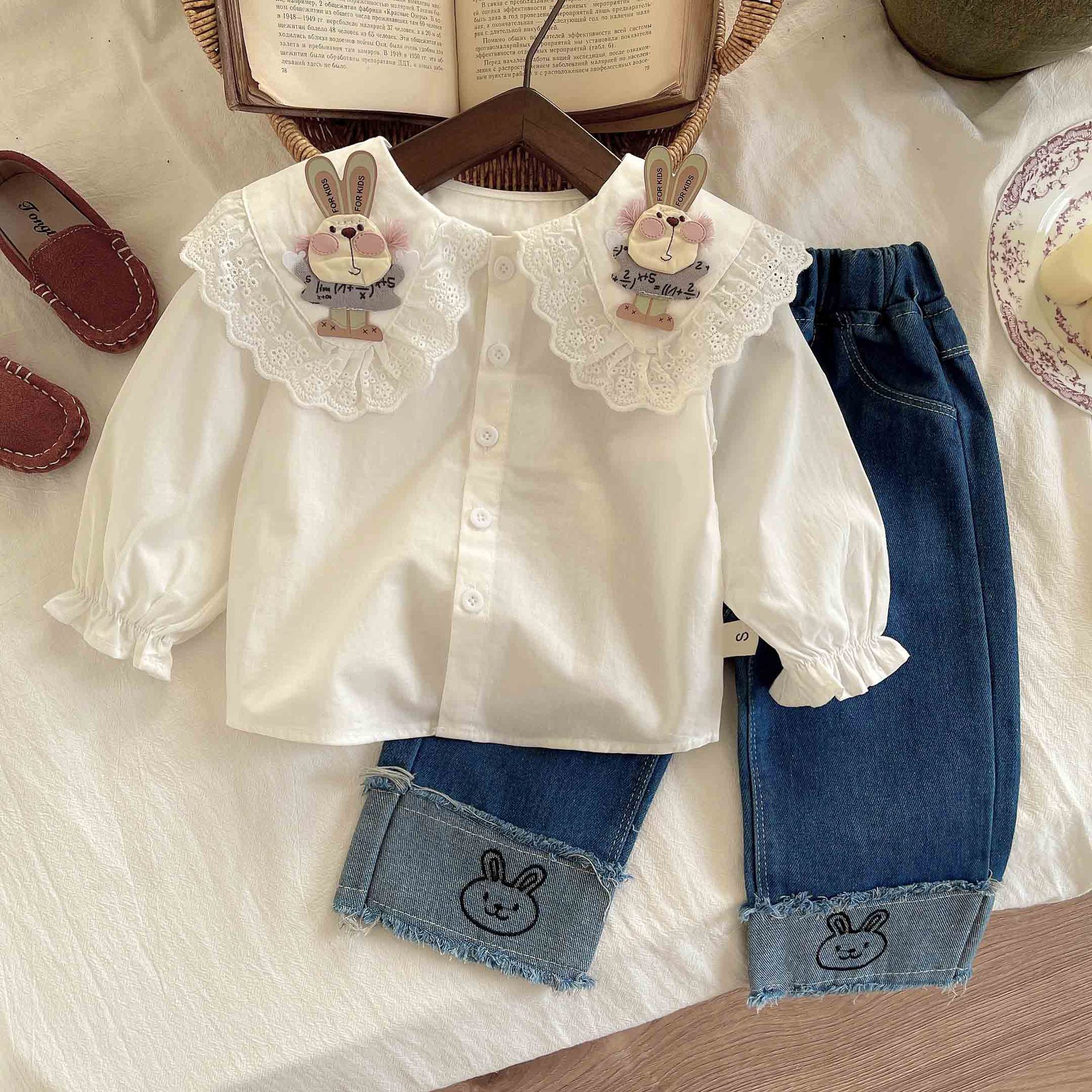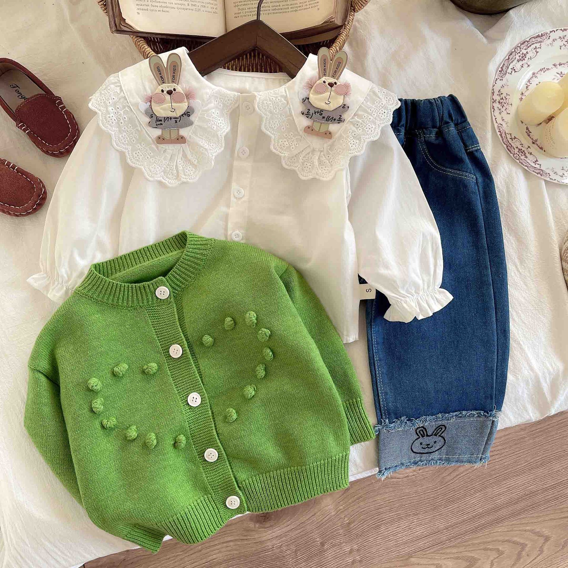 아기의 봄과 가을 스웨터 세트 신선한 녹색 스웨터 토끼 레이스 셔츠 토끼 머리 청바지 3 종 세트스토어 가기