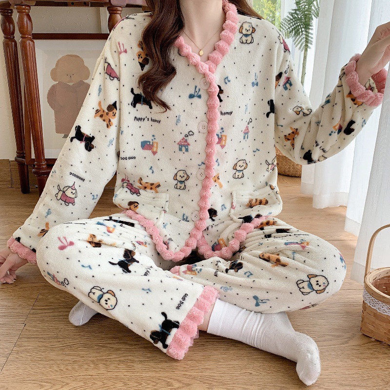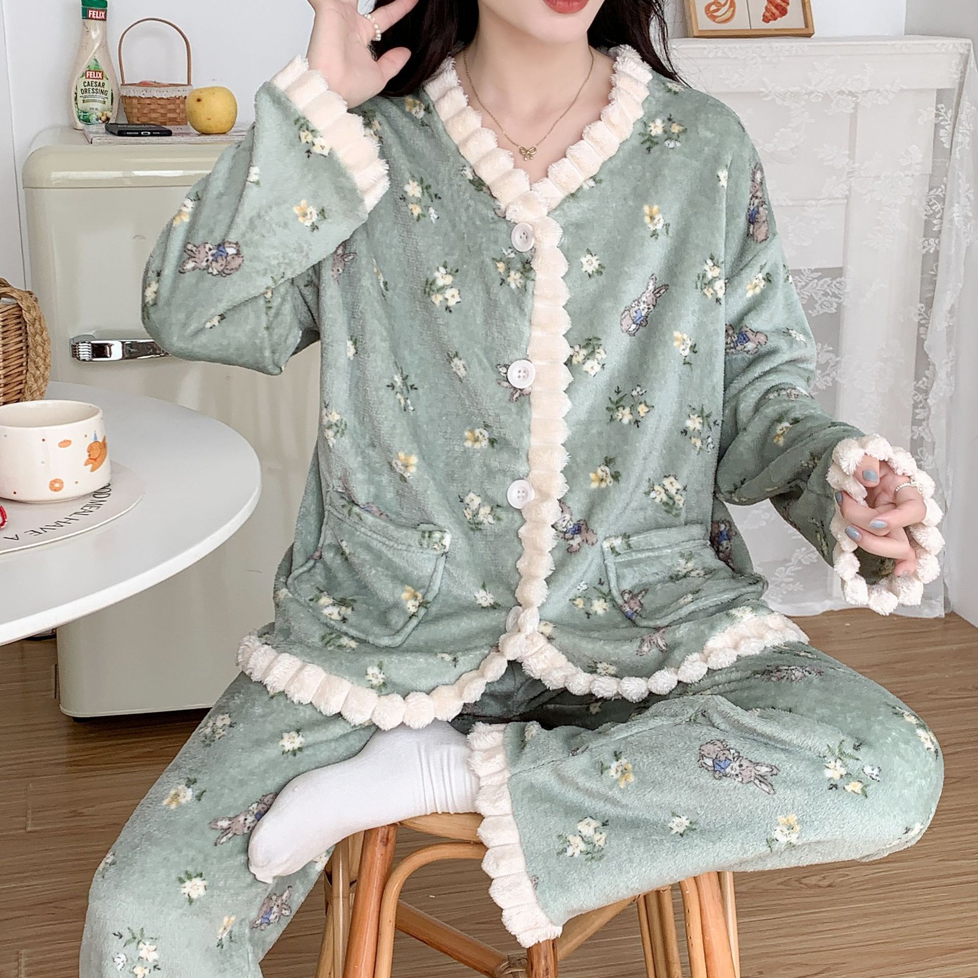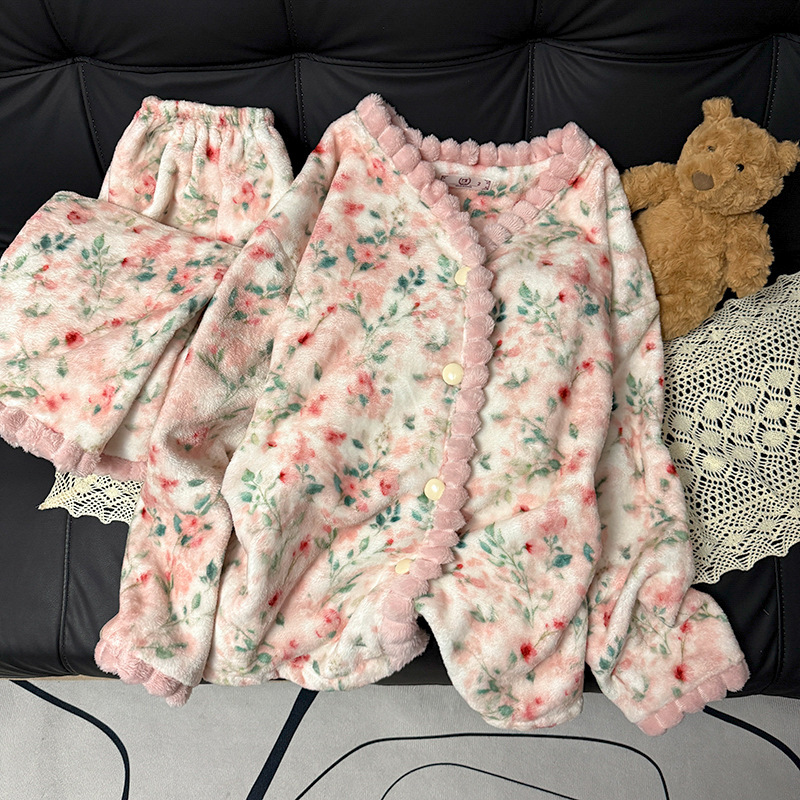 플란넬 파자마 여성의 겨울 기모 두꺼운 산호 양털 2024 새로운 가을과 겨울 집 옷 카디건스토어 가기