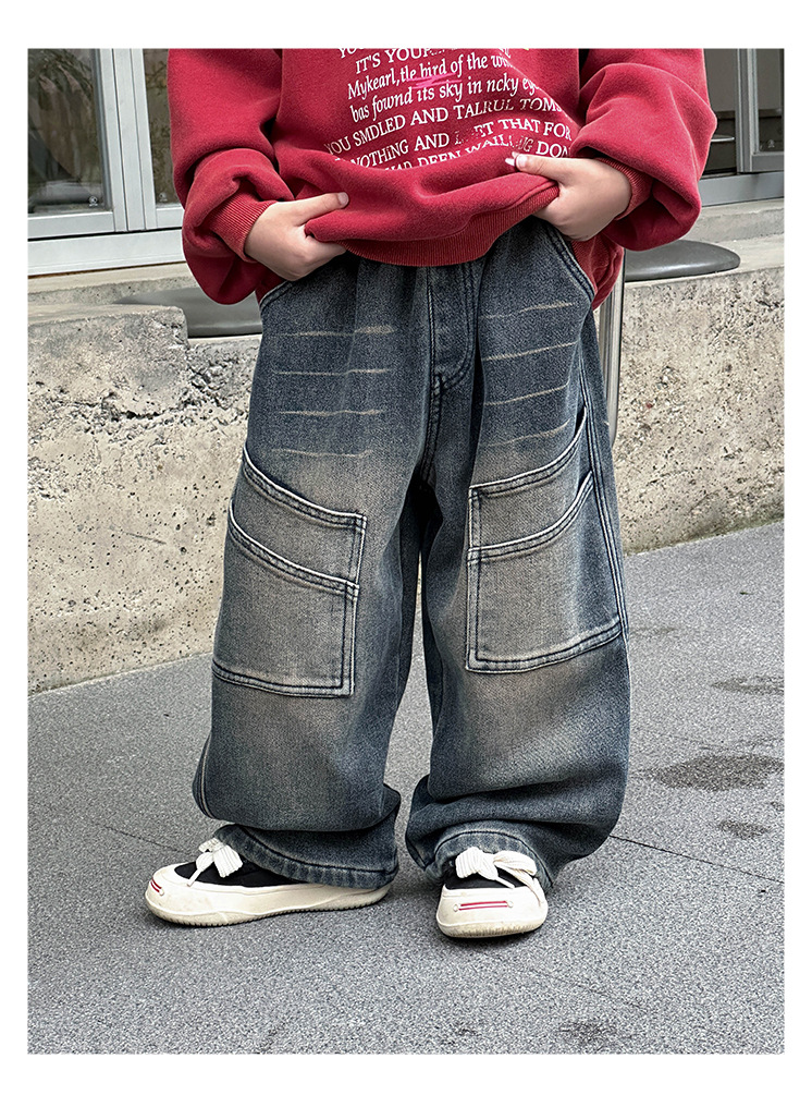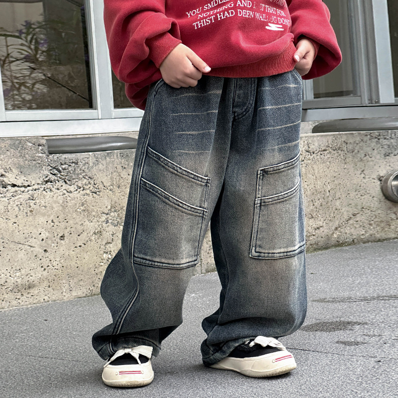 소년 한국 청바지 2024 겨울 새로운 어린이 패션 기모 넓은 다리 바지 어린이 가을 겨울 유행 바지스토어 가기