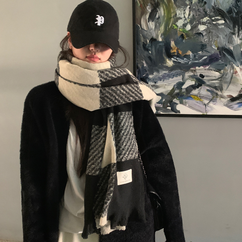 새로운 스카프 여자 가을 겨울 2024 새로운 한국식 올매치 학생 흑백 격자 목도리 두꺼운 따뜻한 스카프