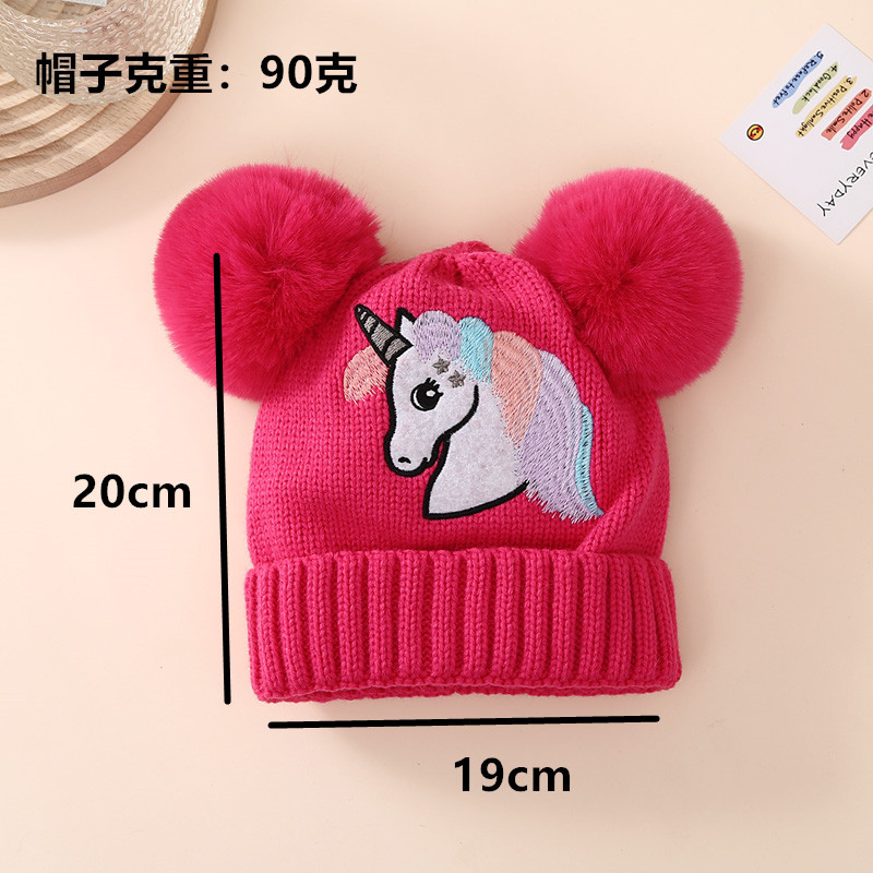 아마존 유럽과 미국 어린이 니트 모자 2023 겨울 새 소녀 자수 유니콘 더블 볼 울 모자 따뜻한