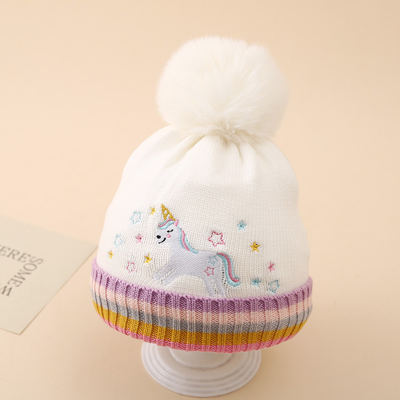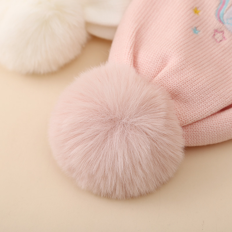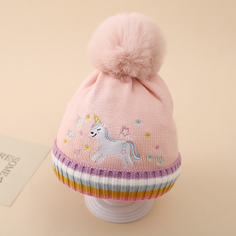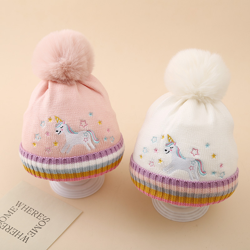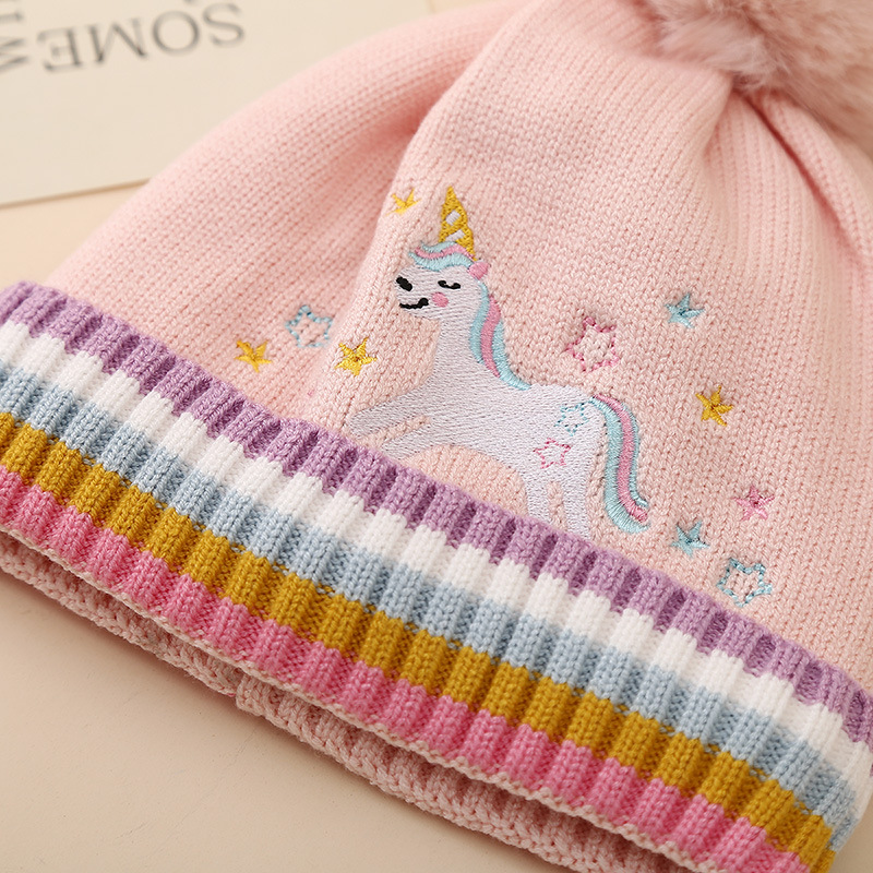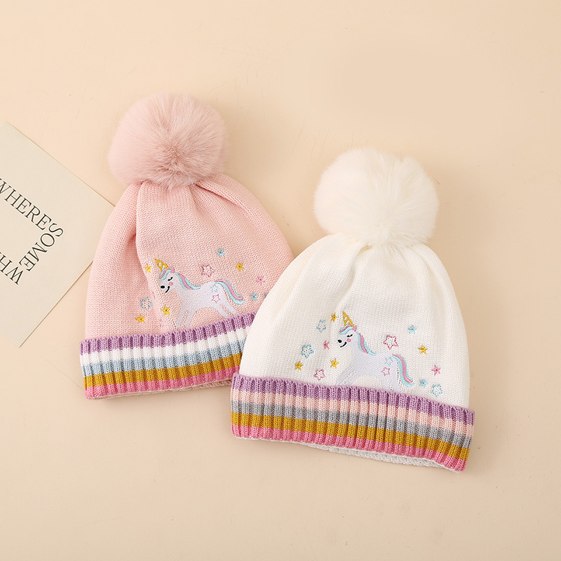 국경 2024 소녀 만화 유니콘 니트 모자 겨울 따뜻한 플러스 푹신한 공 울 모자 어린이 풀오버 모자