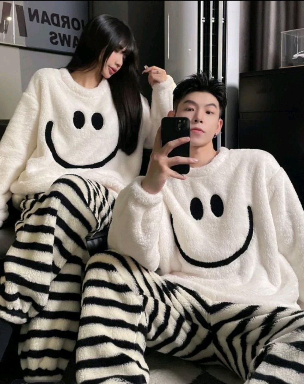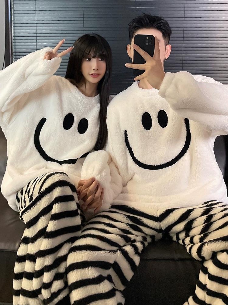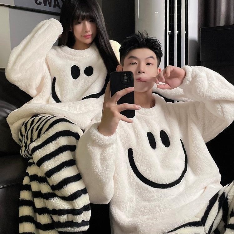 2025 가을 겨울 산호색 벨벳 커플 잠옷, 두꺼운 커플용 웃는 얼굴 홈웨어 세트, 따뜻하고 외출 가능스토어 가기