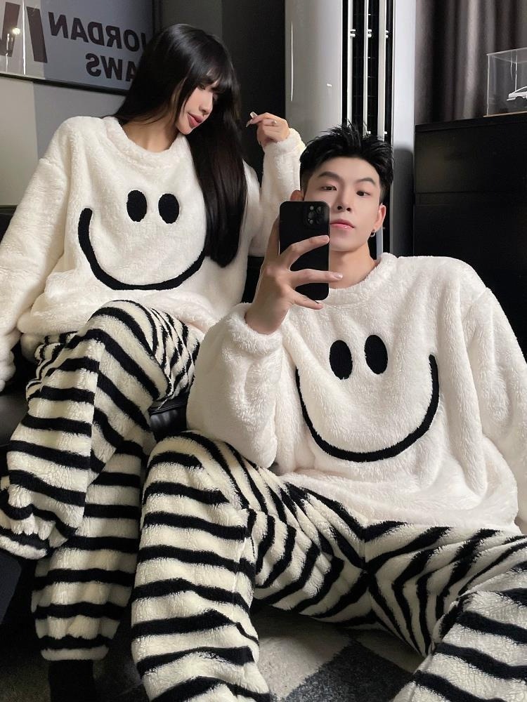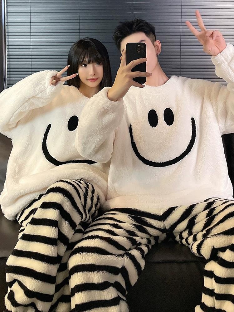 2025 가을 겨울 산호색 벨벳 커플 잠옷, 두꺼운 커플용 웃는 얼굴 홈웨어 세트, 따뜻하고 외출 가능