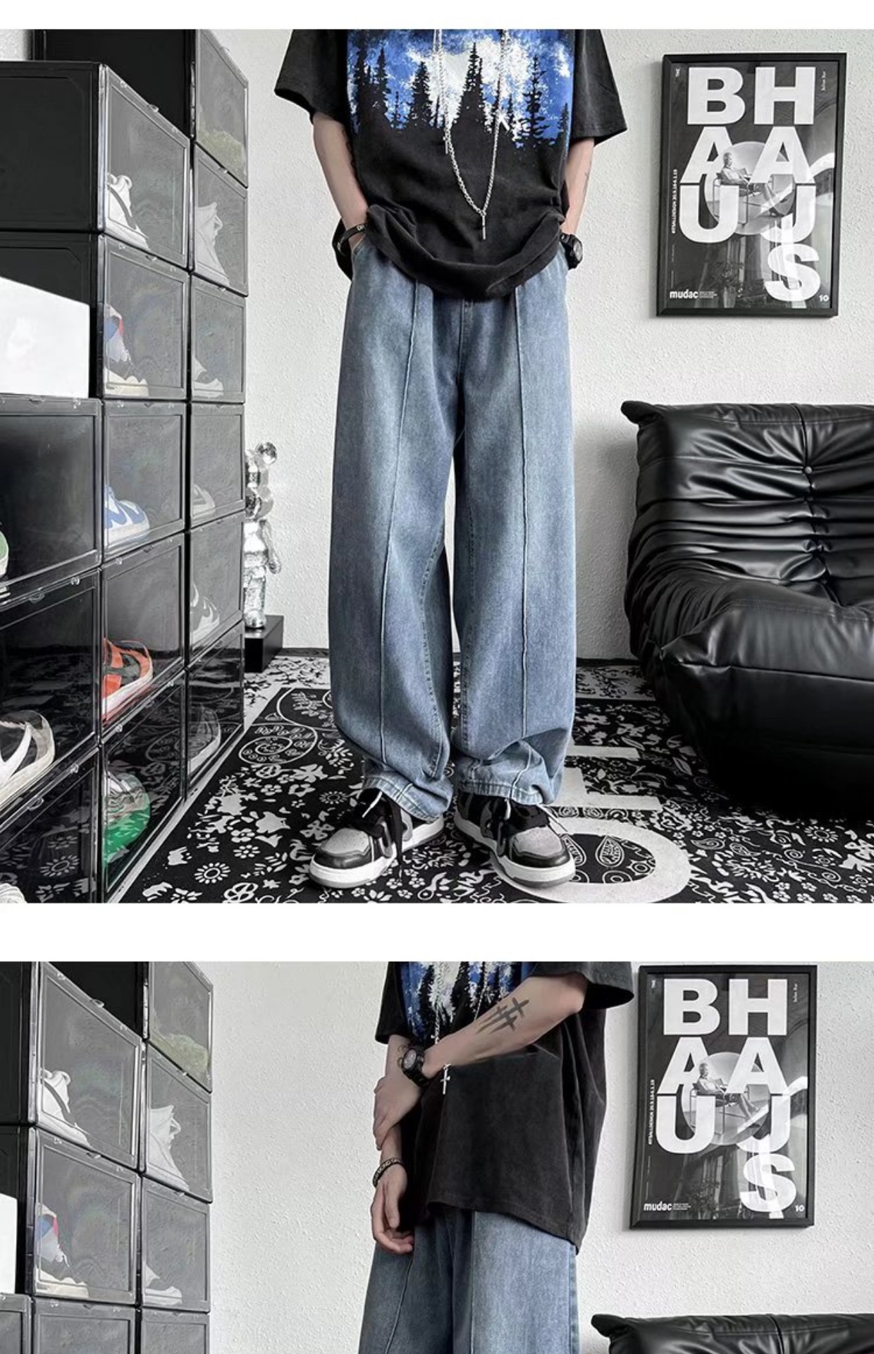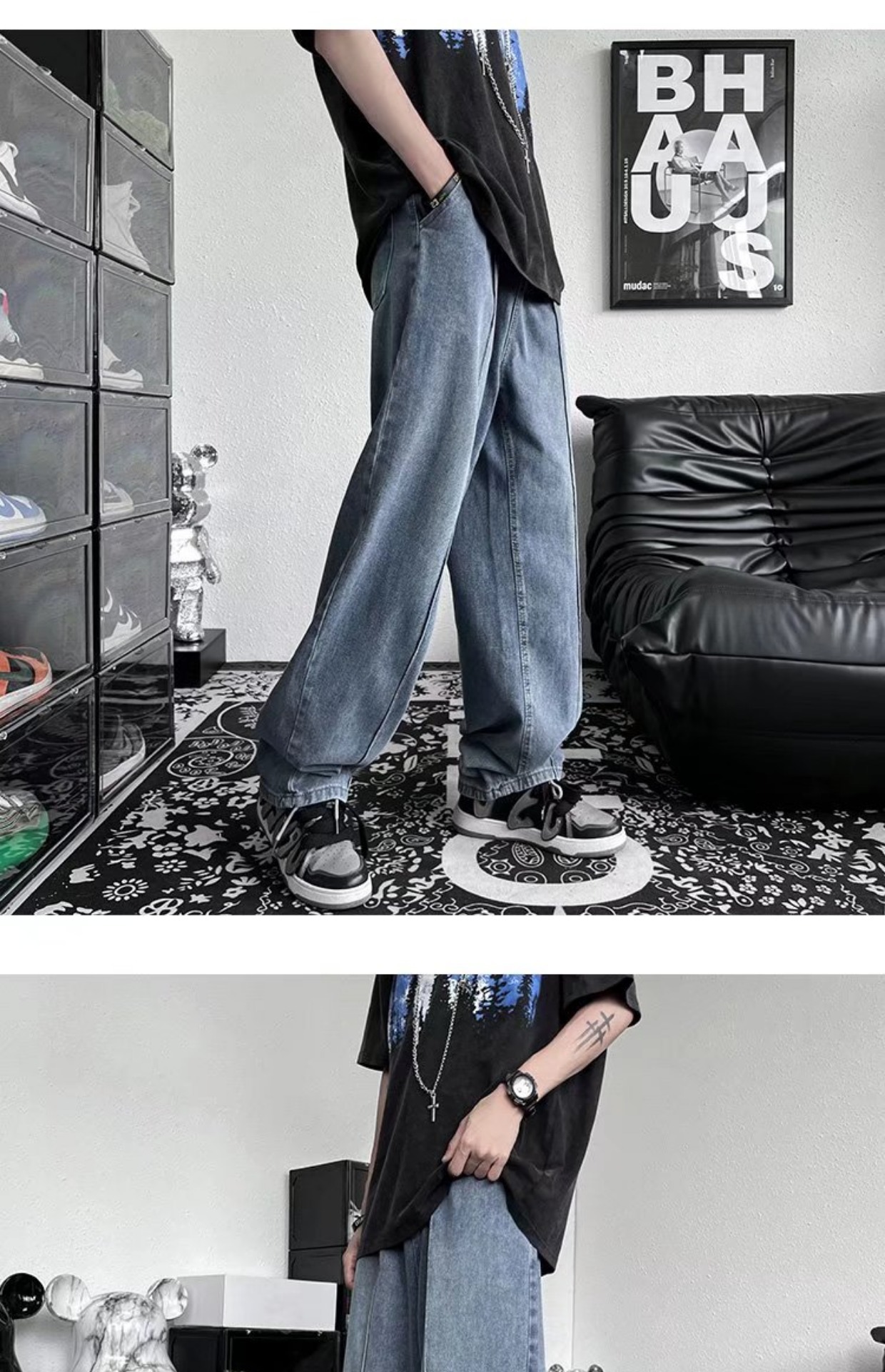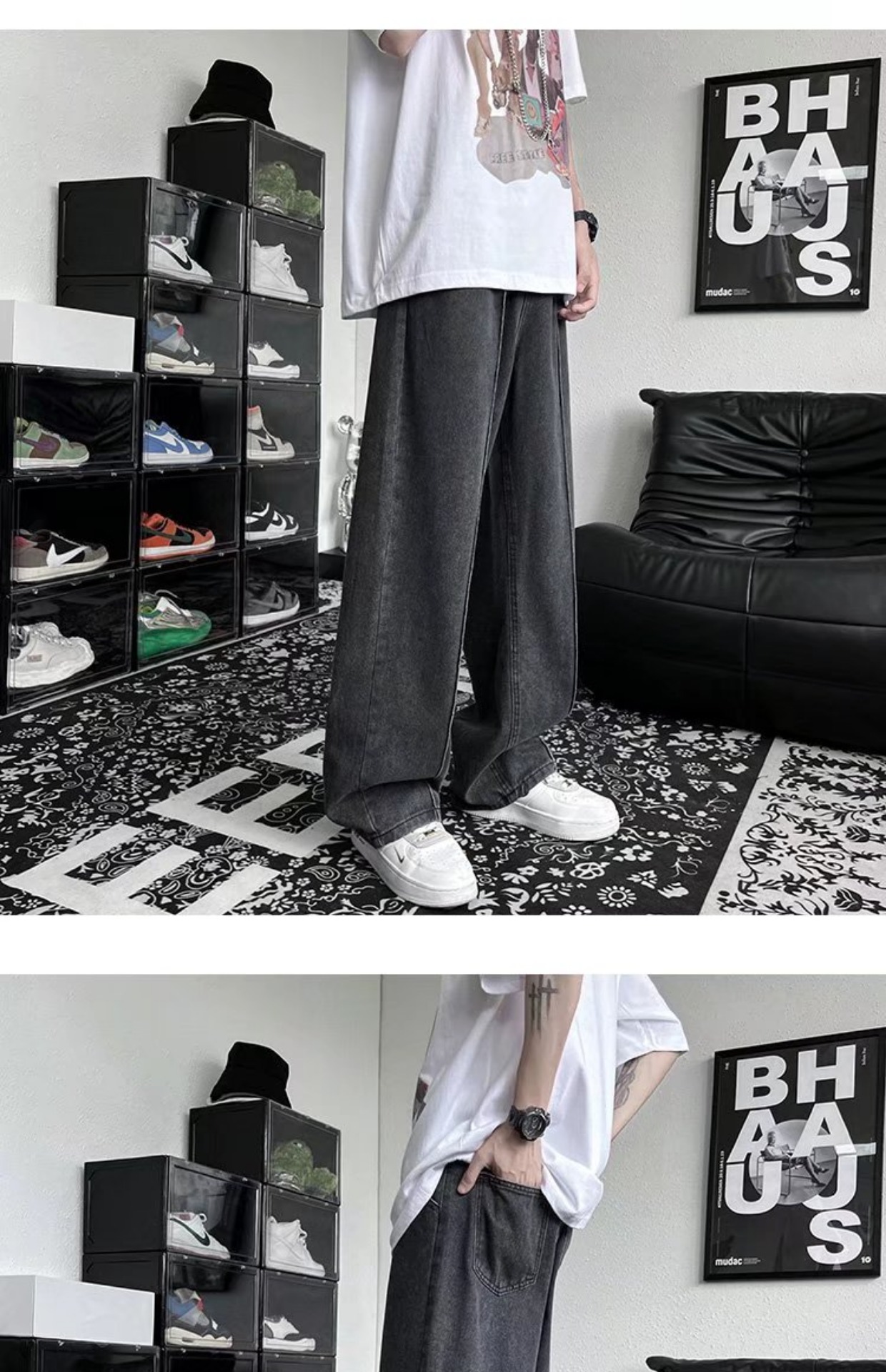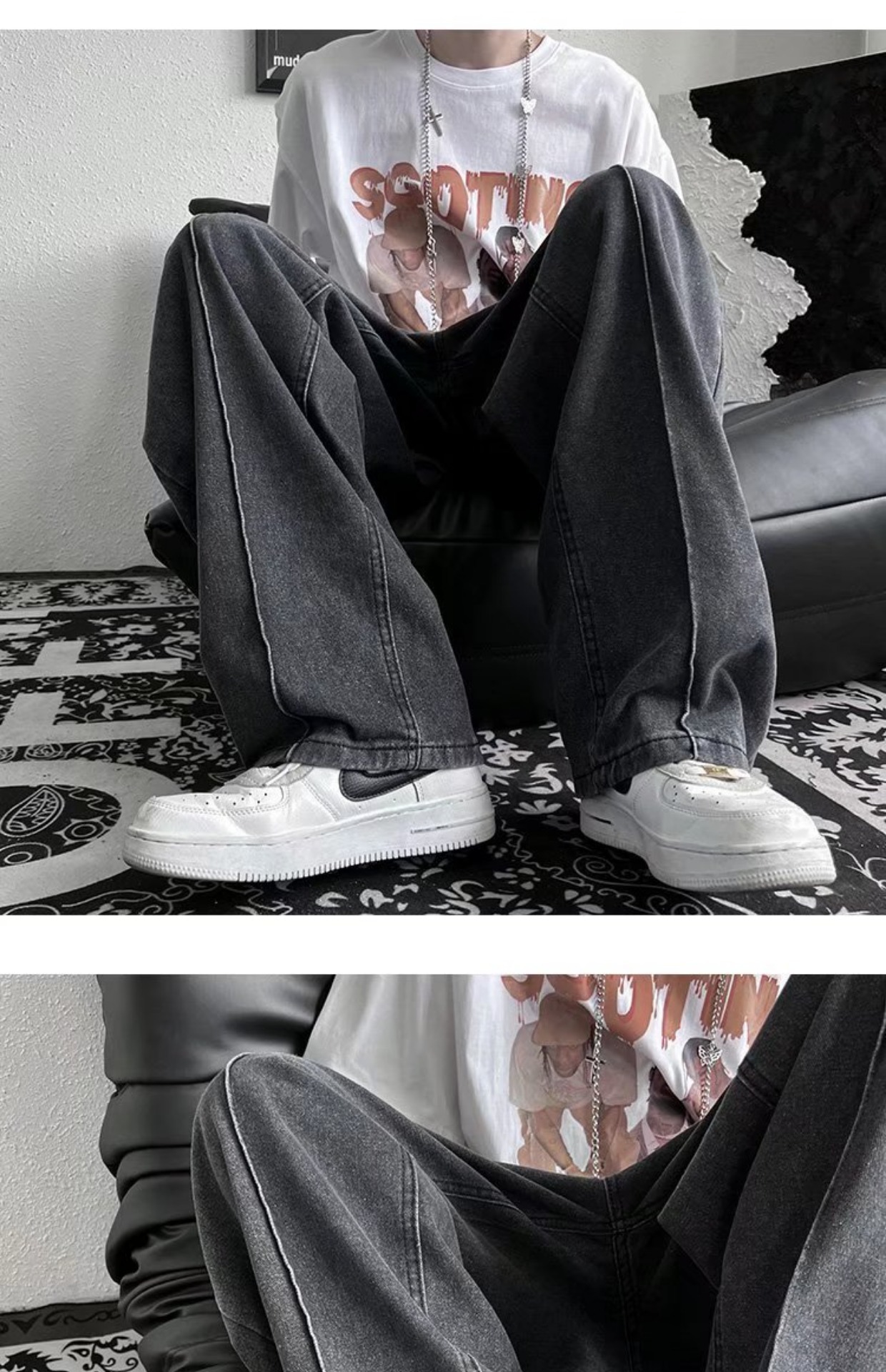 남성 청바지 홍콩 스타일 세련된 느슨한 일본 스타일 레트로 패션 브랜드 하이 스트리트 패션 스트레이트 딥 와이드 레그 팬츠스토어 가기