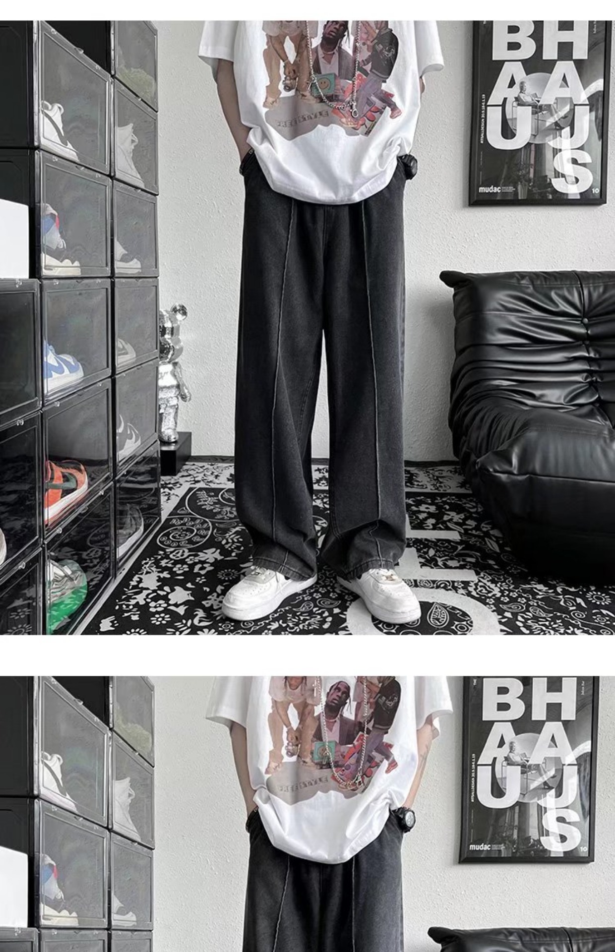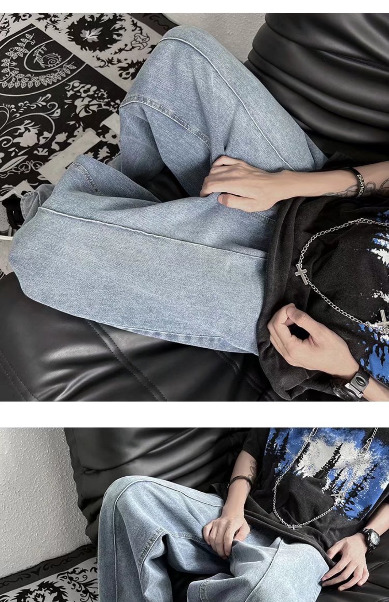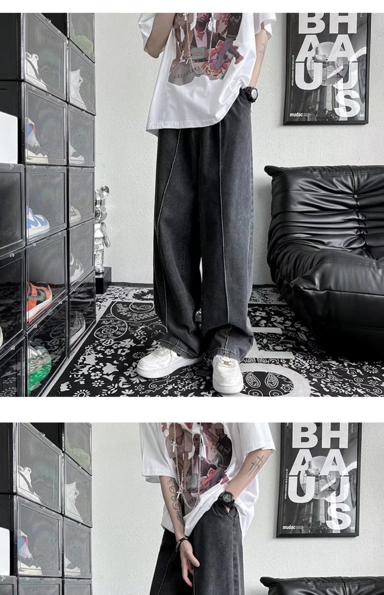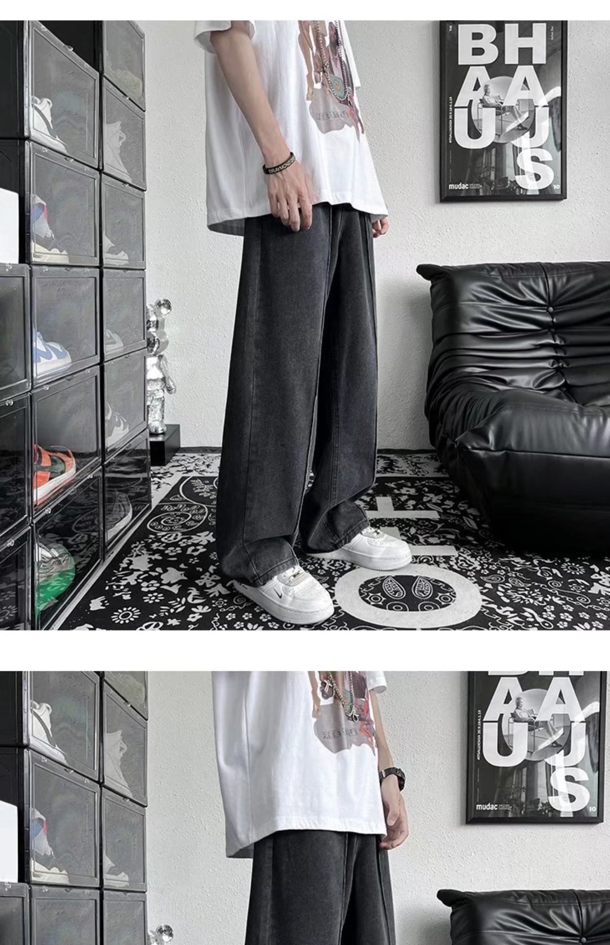 남성 청바지 홍콩 스타일 세련된 느슨한 일본 스타일 레트로 패션 브랜드 하이 스트리트 패션 스트레이트 딥 와이드 레그 팬츠스토어 가기