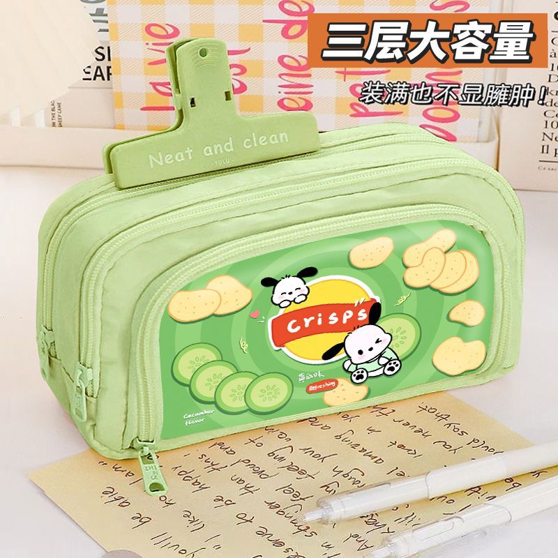 • 오이맛 감자칩 - 그린 - 3단 대용량 필통 SDR + 스프링 펜던트 1개