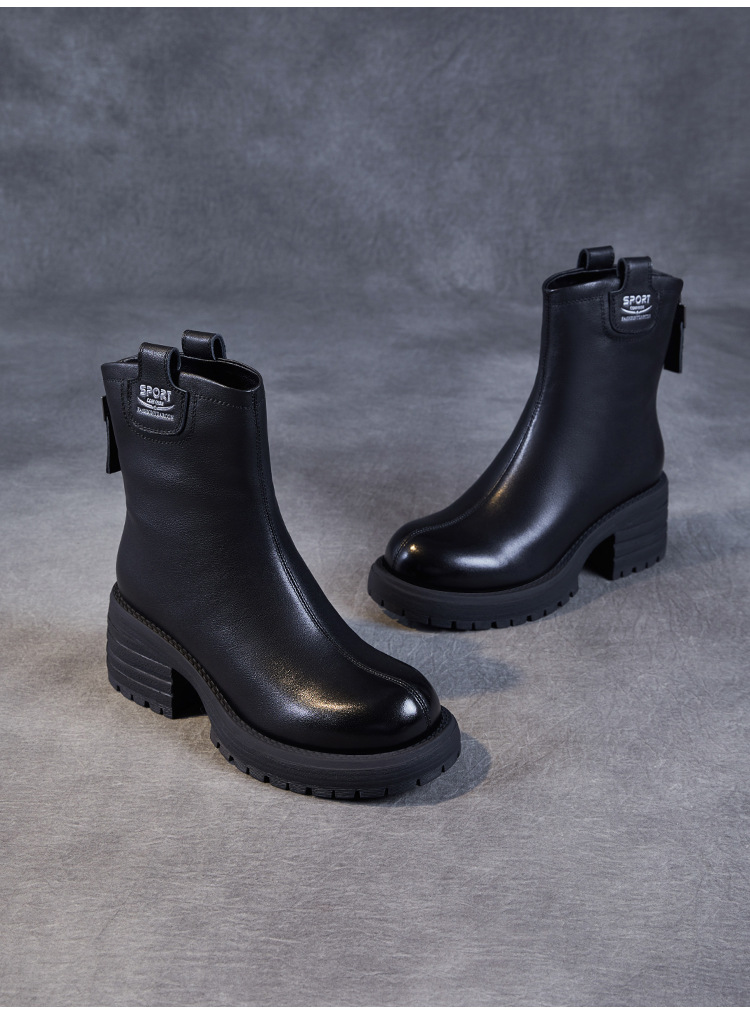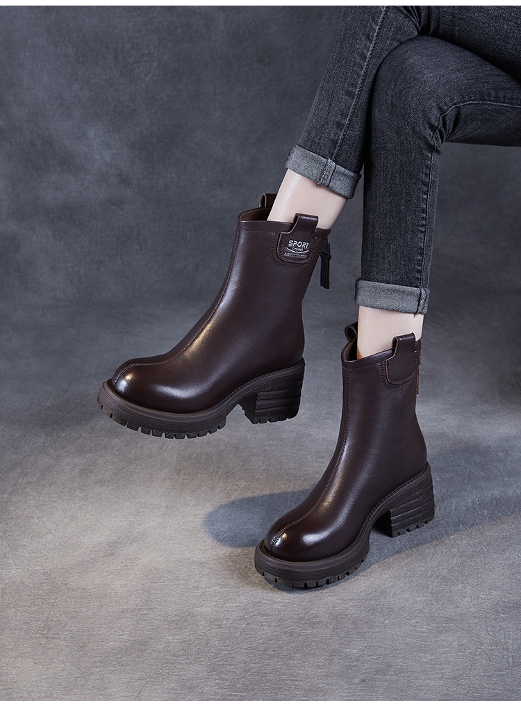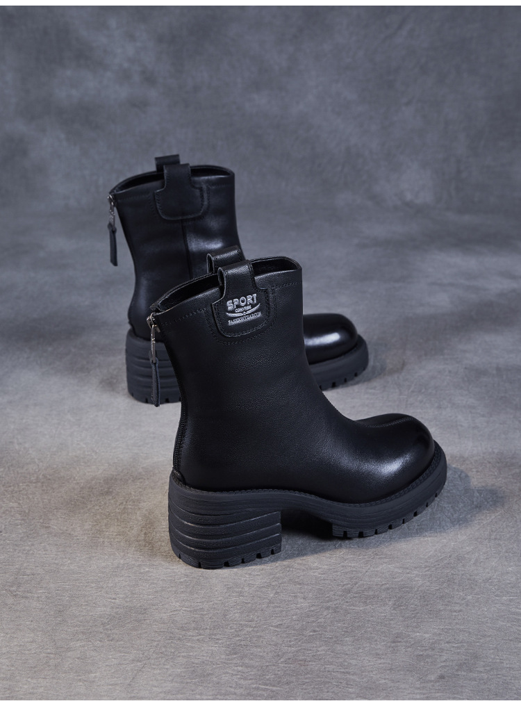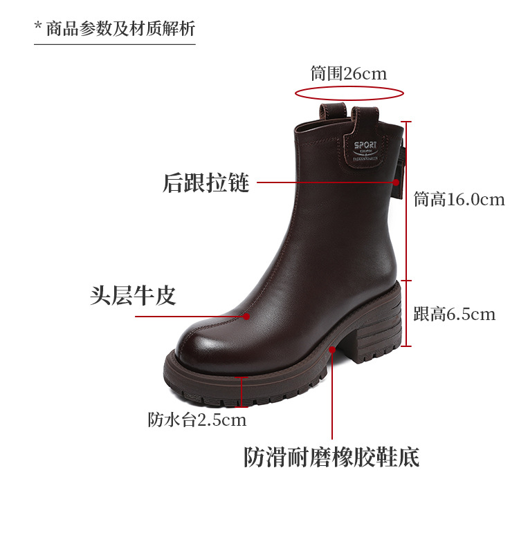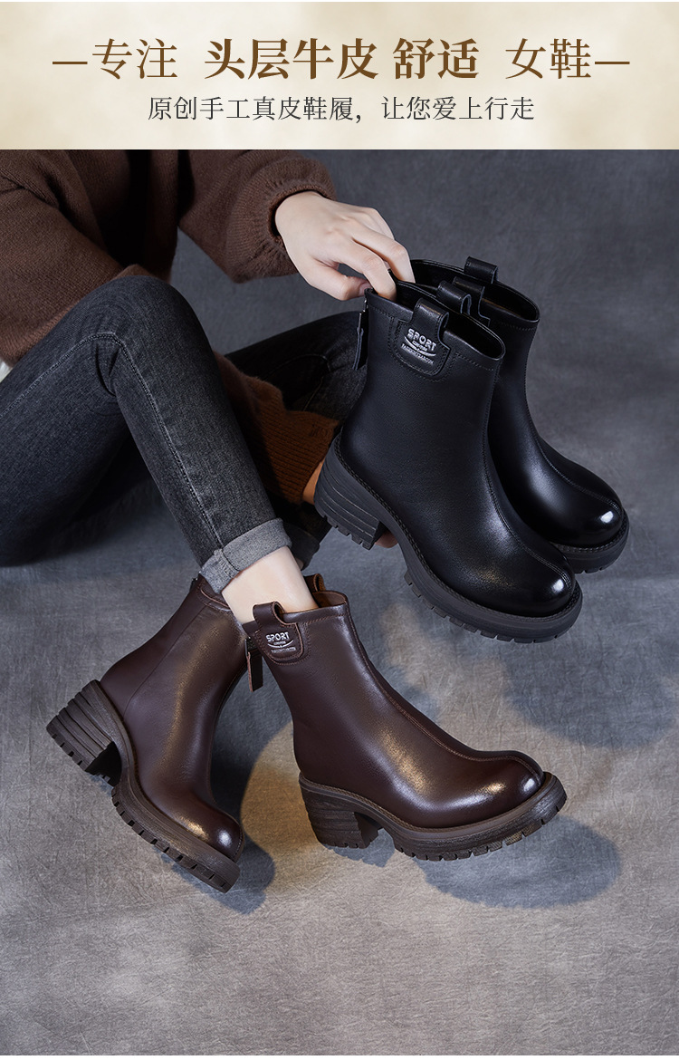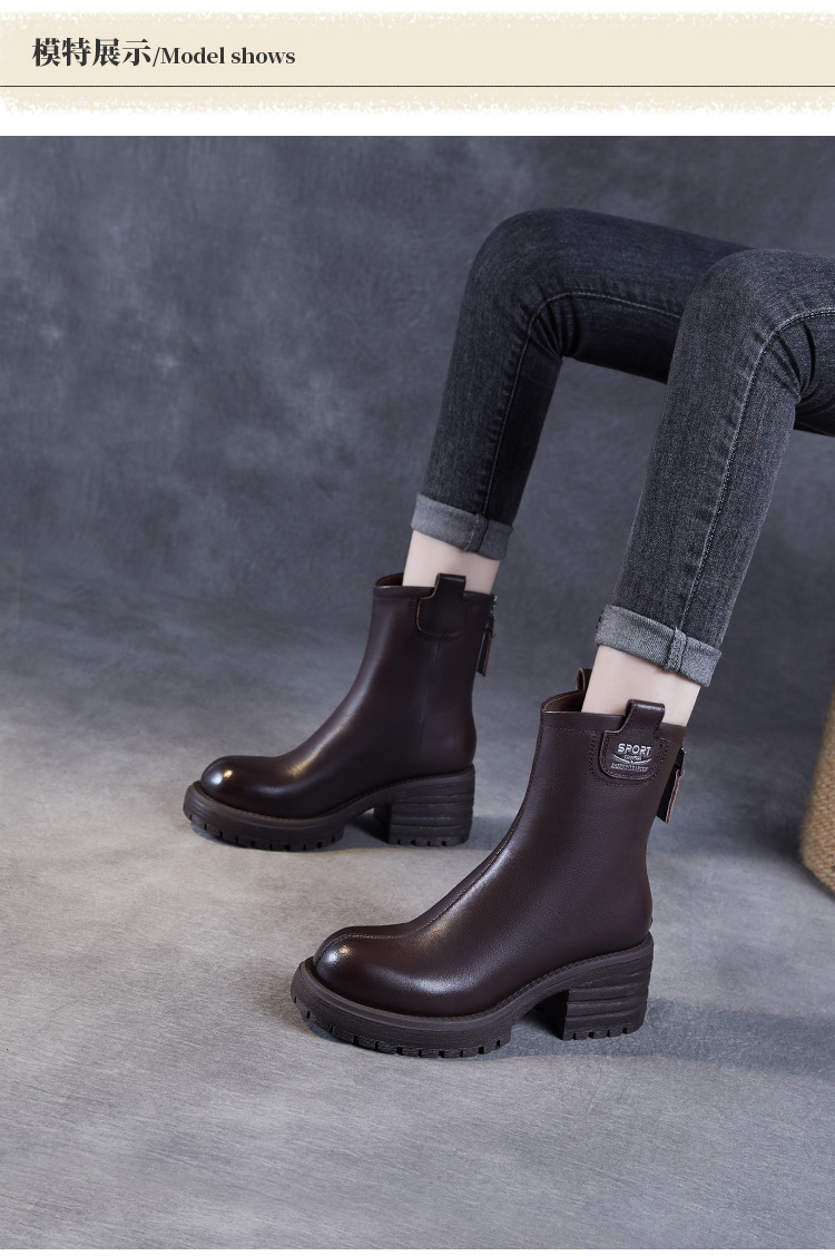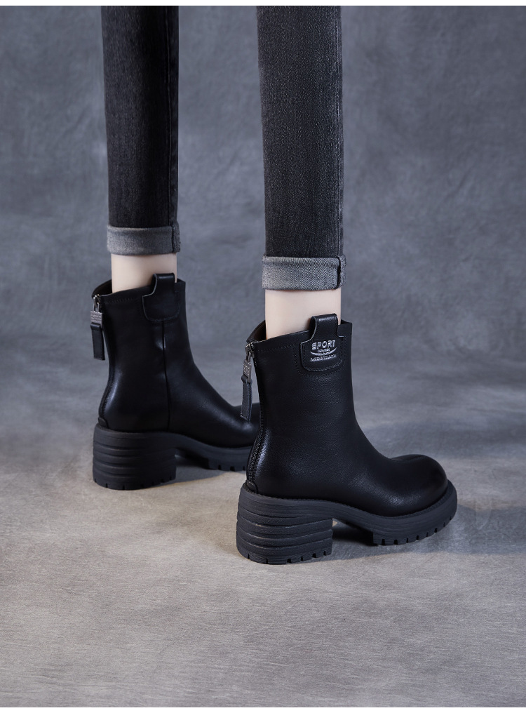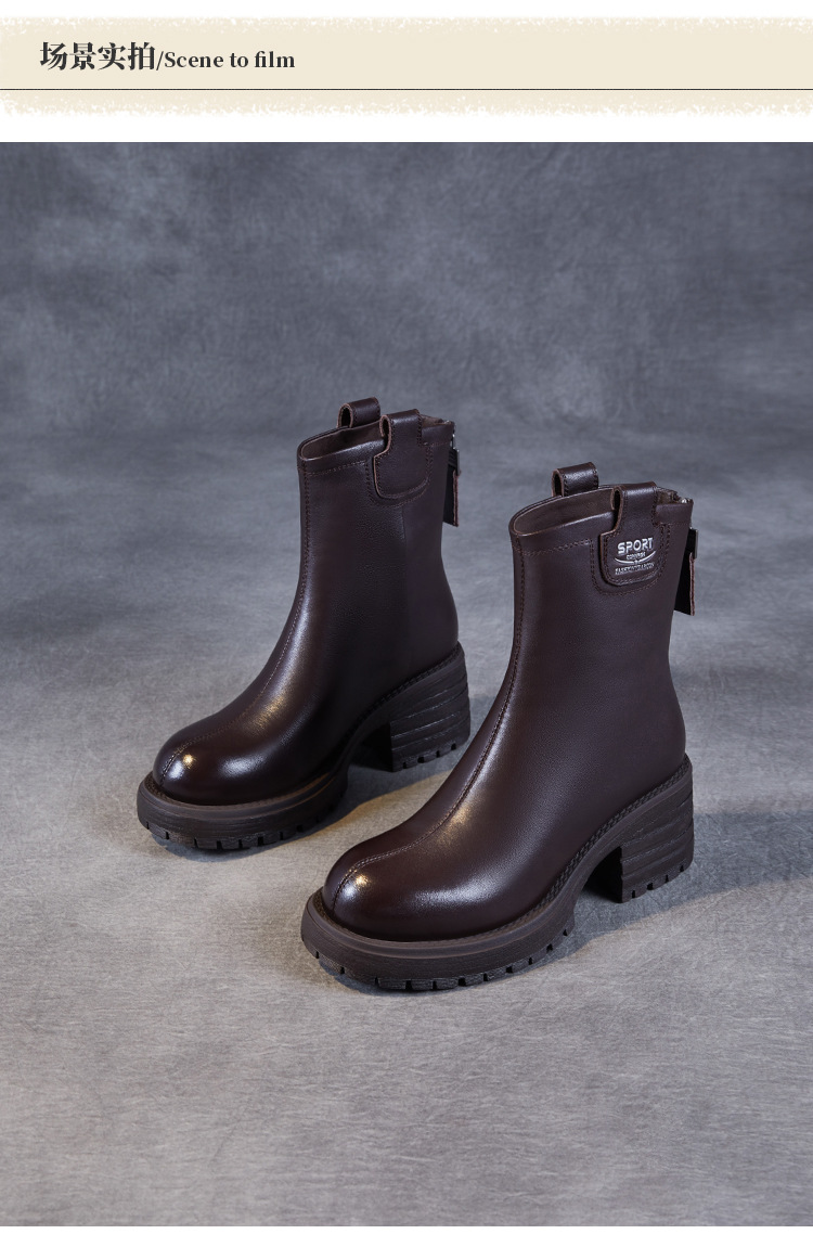 정품 가죽 두꺼운 하이힐 패션 부츠 여성의 2024 가을 및 겨울 새로운 라운드 발가락 후방 지퍼 짧은 부츠 두꺼운 바닥 영국 스타일 부츠스토어 가기