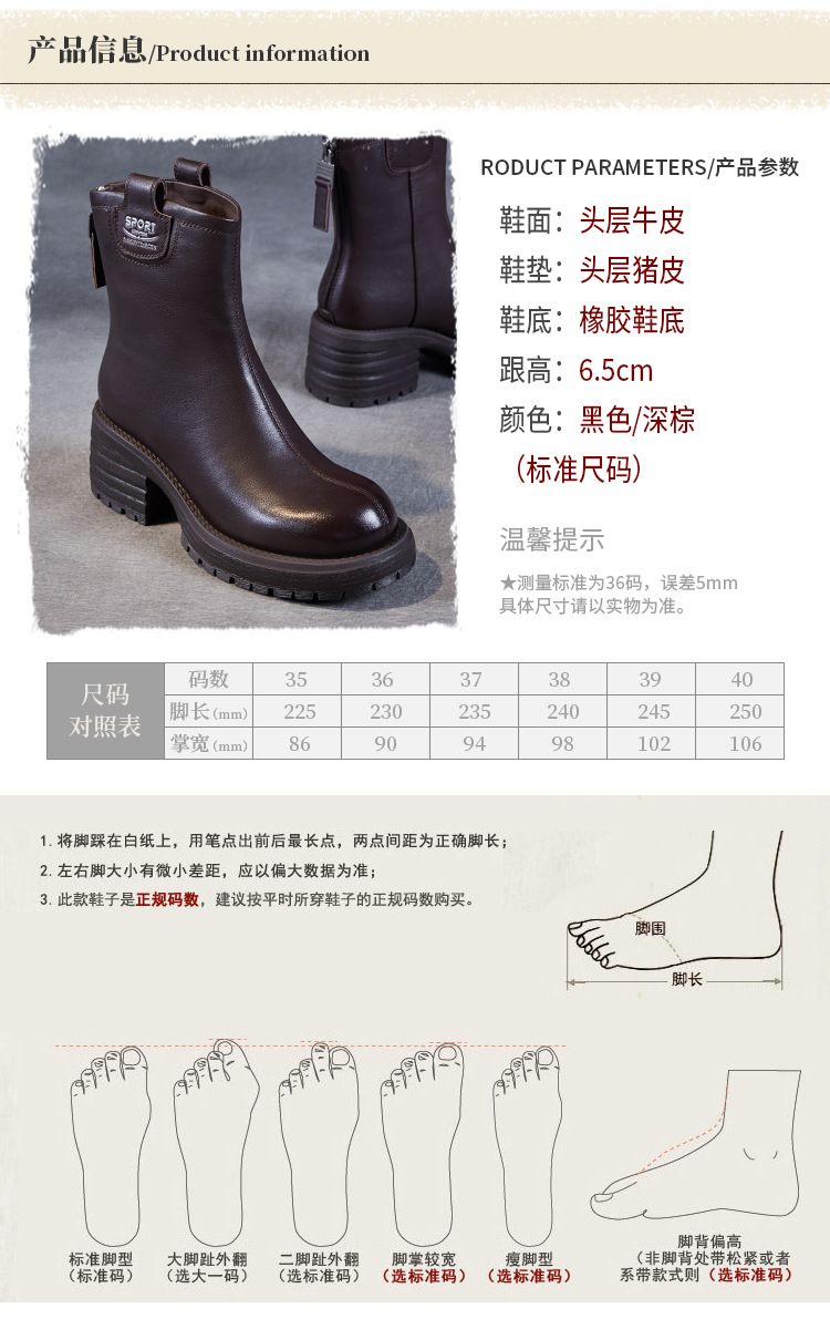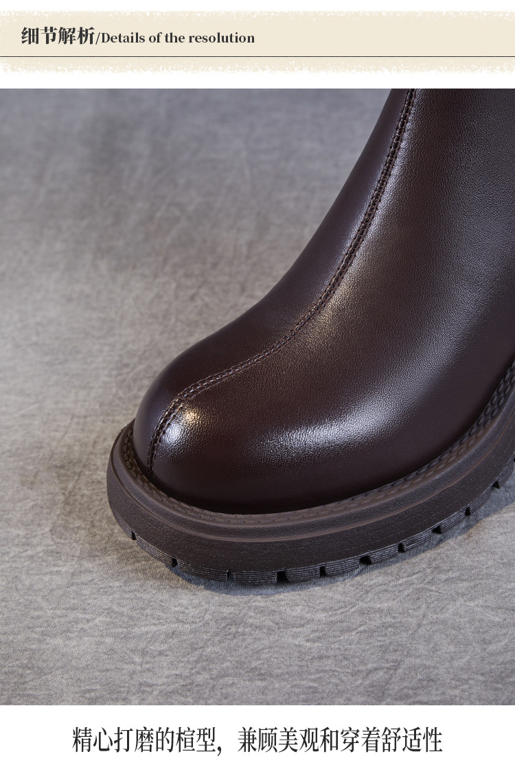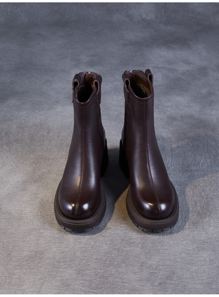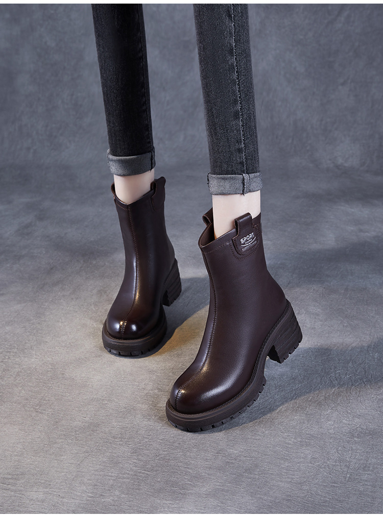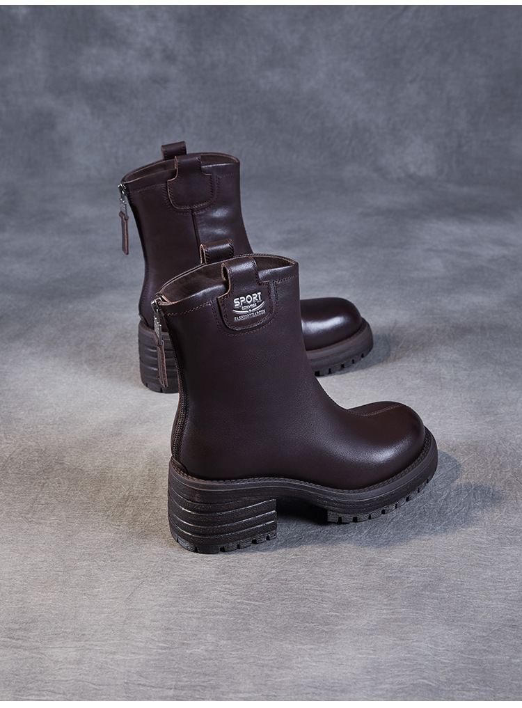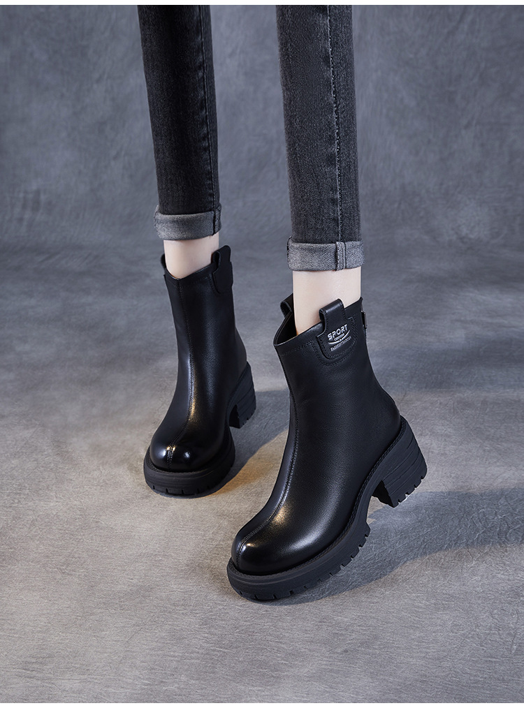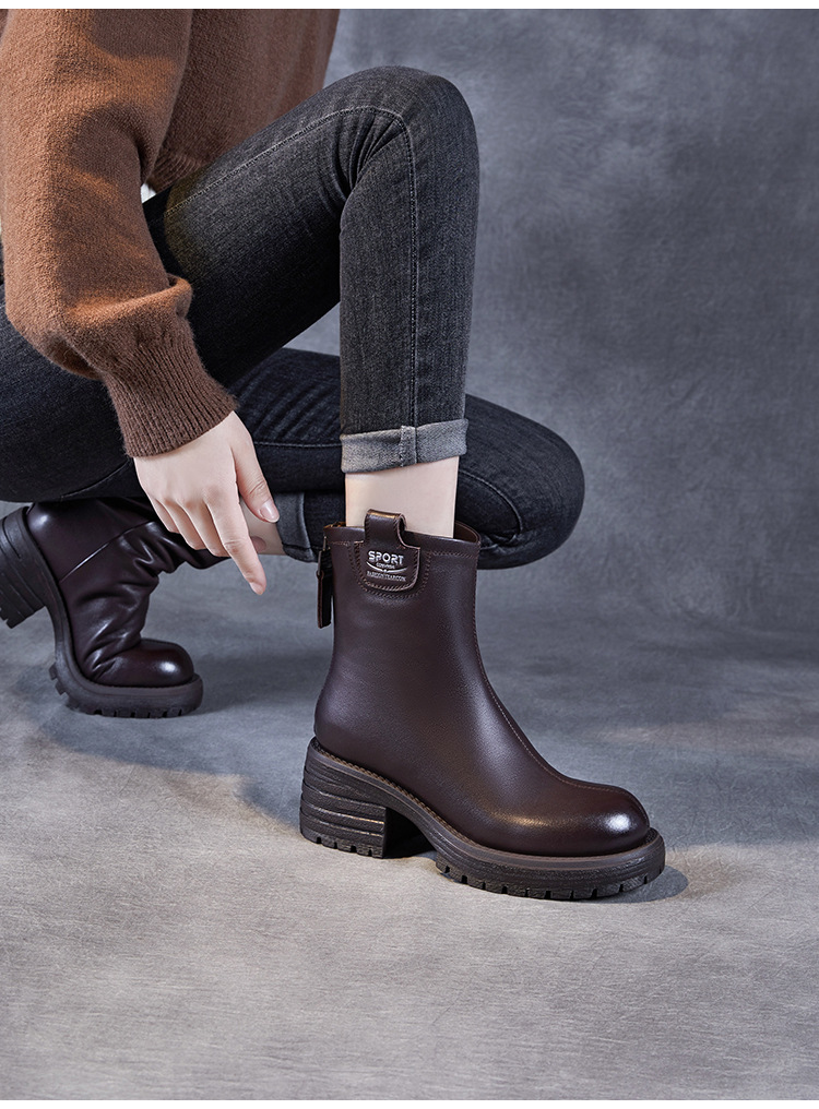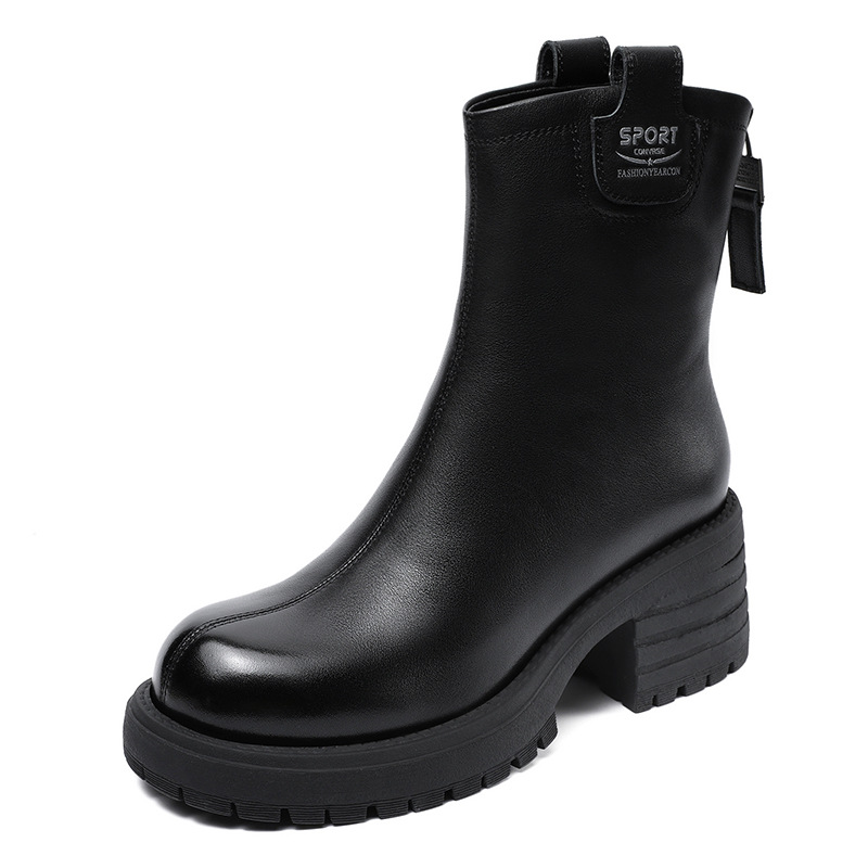 정품 가죽 두꺼운 하이힐 패션 부츠 여성의 2024 가을 및 겨울 새로운 라운드 발가락 후방 지퍼 짧은 부츠 두꺼운 바닥 영국 스타일 부츠스토어 가기