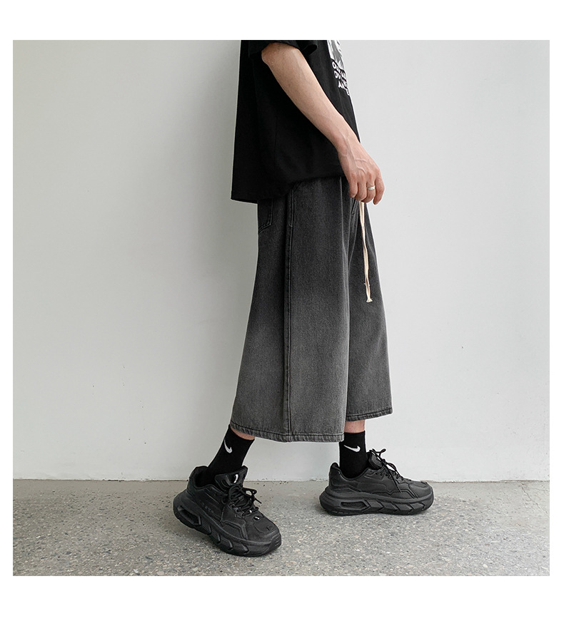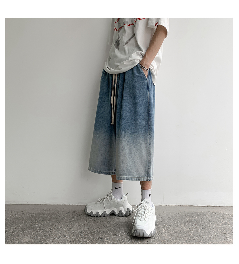 그라디언트 데님 자른 바지 남성 트렌디 하이 스트리트 홍콩 스타일 와이드 레그 팬츠 스트레이트 튜브 루즈 크롭 팬츠스토어 가기