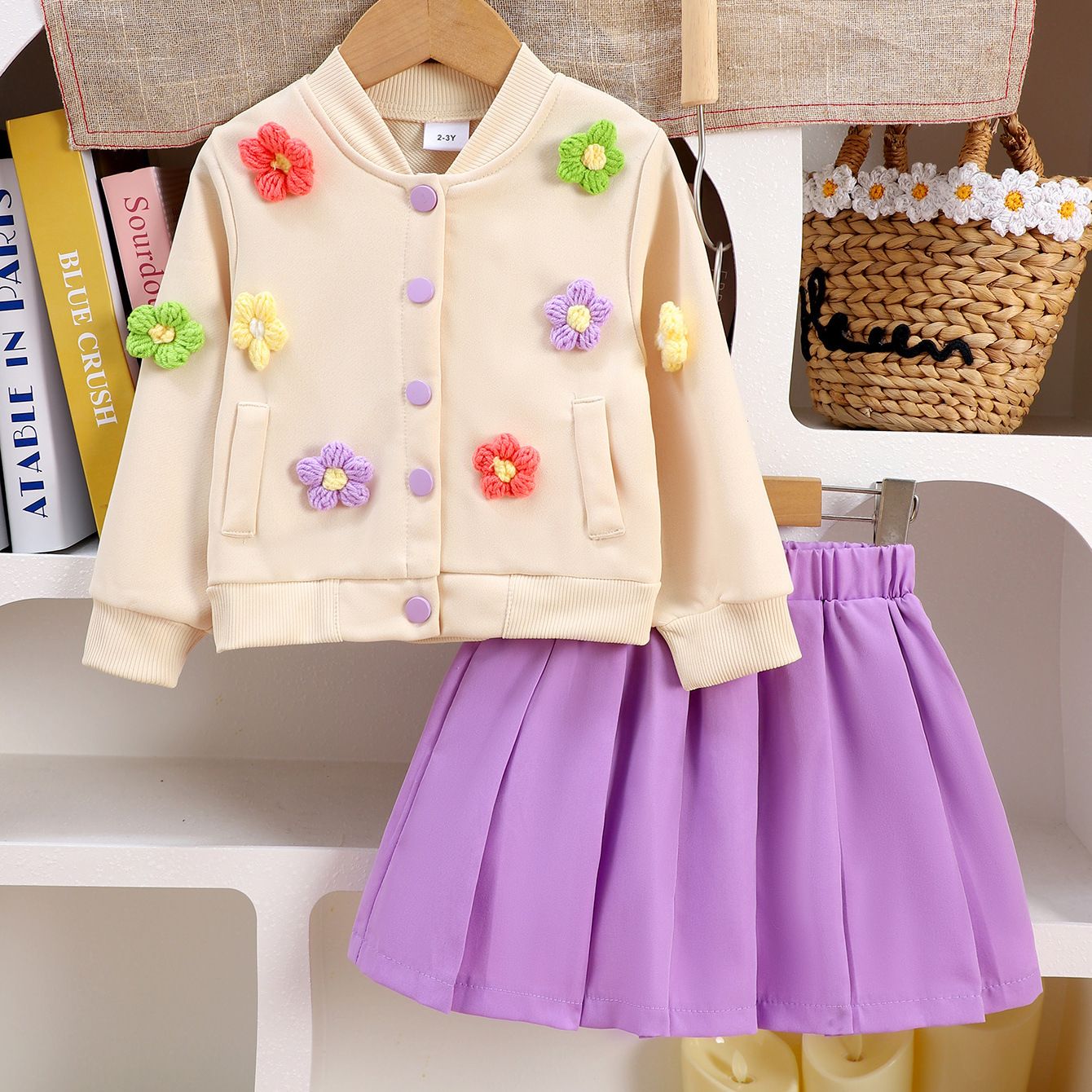 아마존 국경 간 가을과 겨울 새로운 유럽과 미국의 아동복 귀여운 입체 꽃 장식 코트 보라색 주름 치마 세트