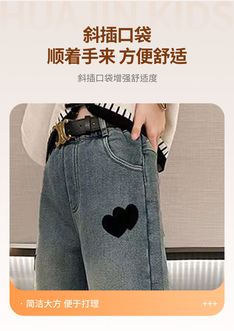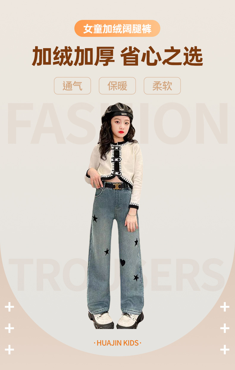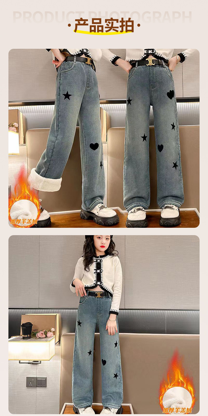 새로운 스타일 서양식 느슨한 어린이 두꺼운 기모 데님 넓은 다리 바지 소녀 기모 바지 넓은 다리 바지