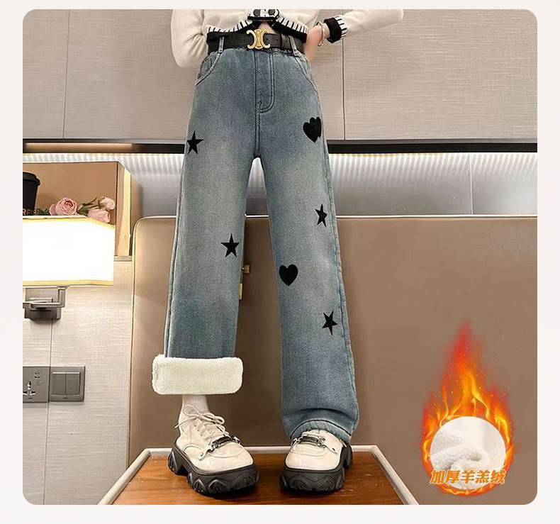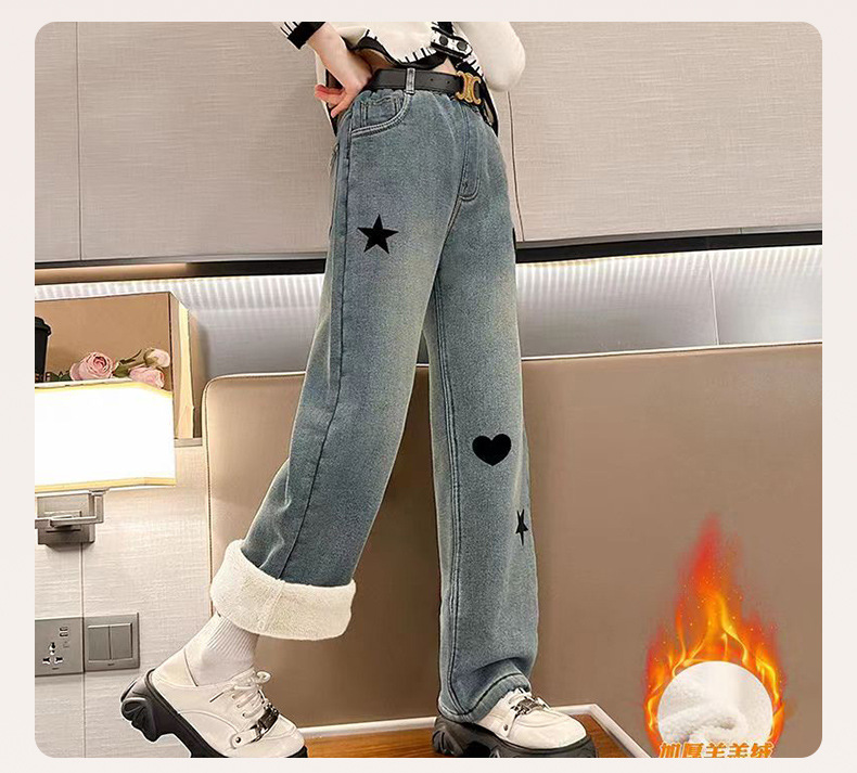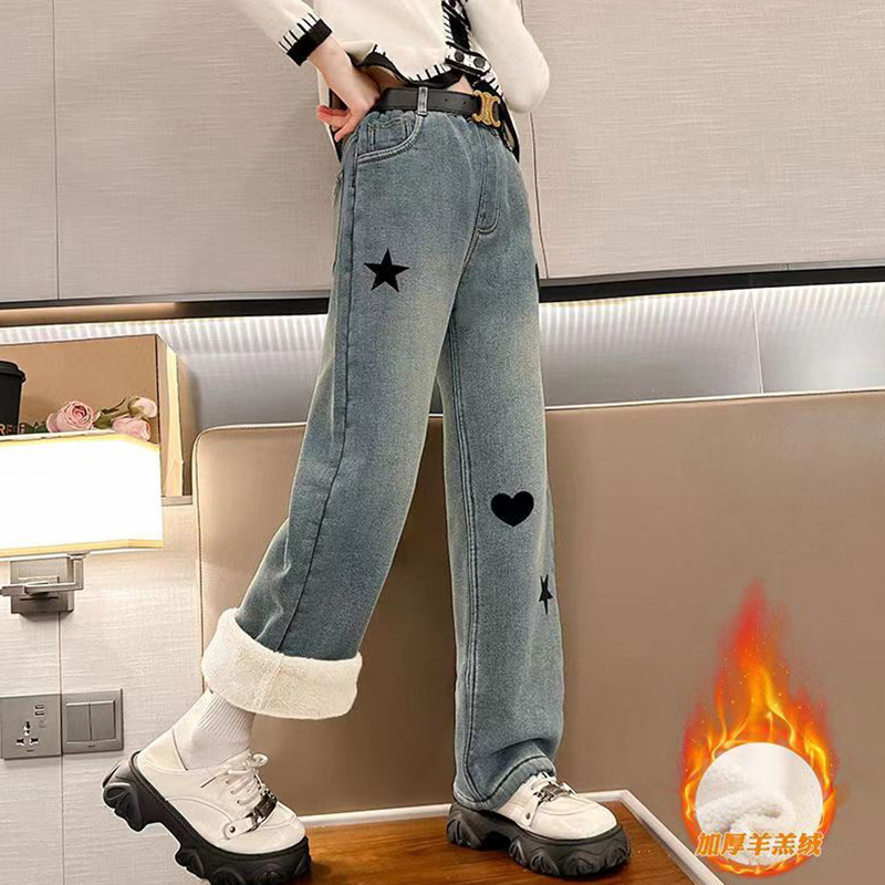 새로운 스타일 서양식 느슨한 어린이 두꺼운 기모 데님 넓은 다리 바지 소녀 기모 바지 넓은 다리 바지스토어 가기