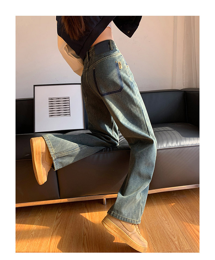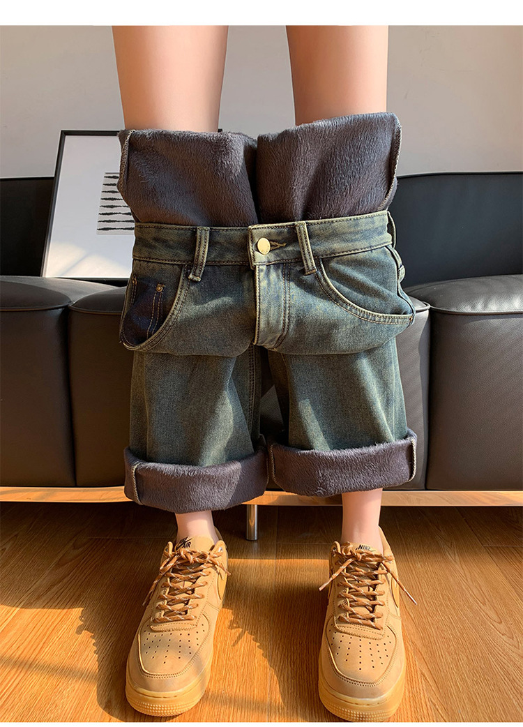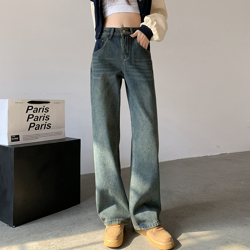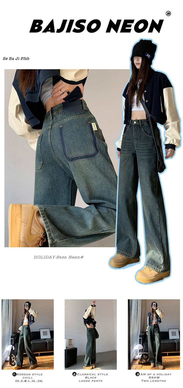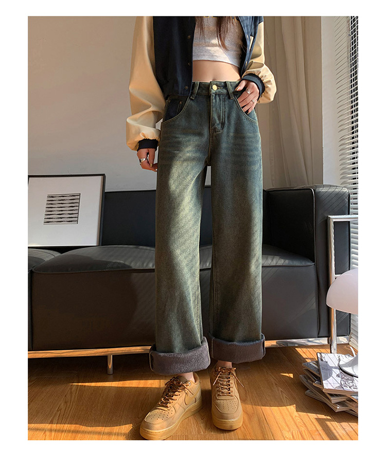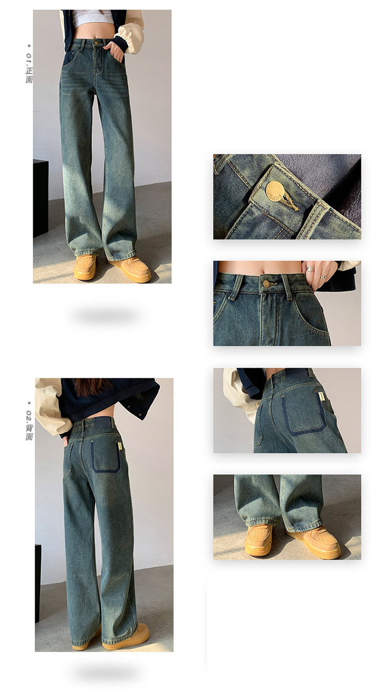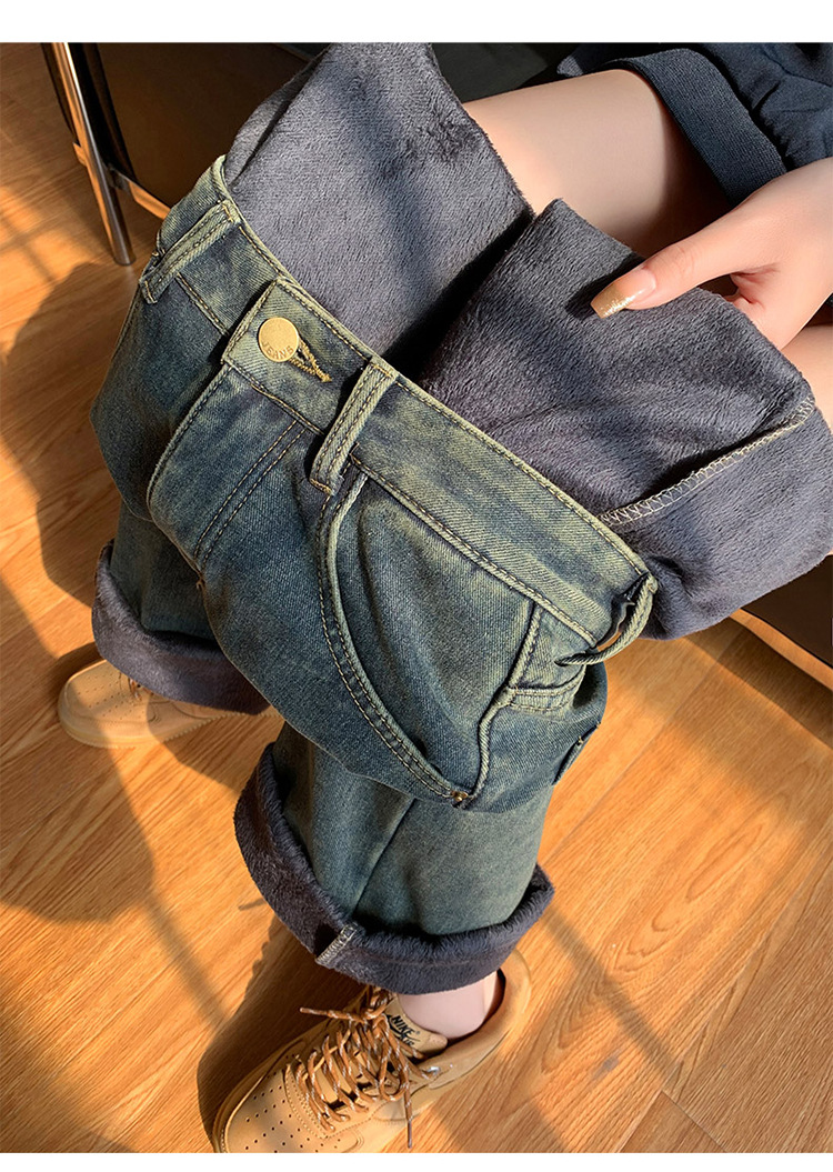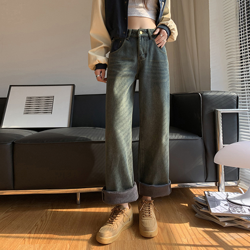 시멘트 회색 기모 청바지 여성의 가을과 겨울 2024 새로운 느슨한 높은 허리 직선 좁은 넓은 다리 바지스토어 가기