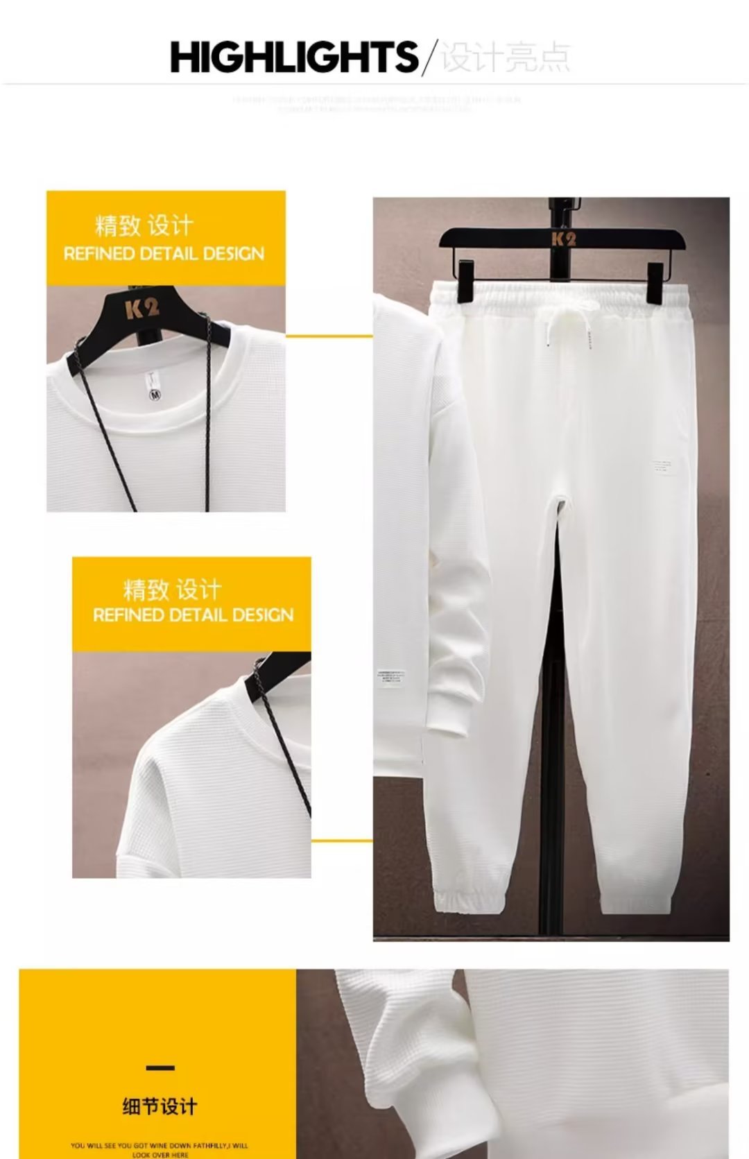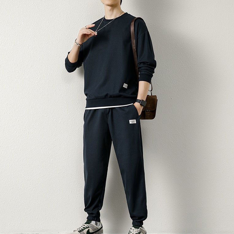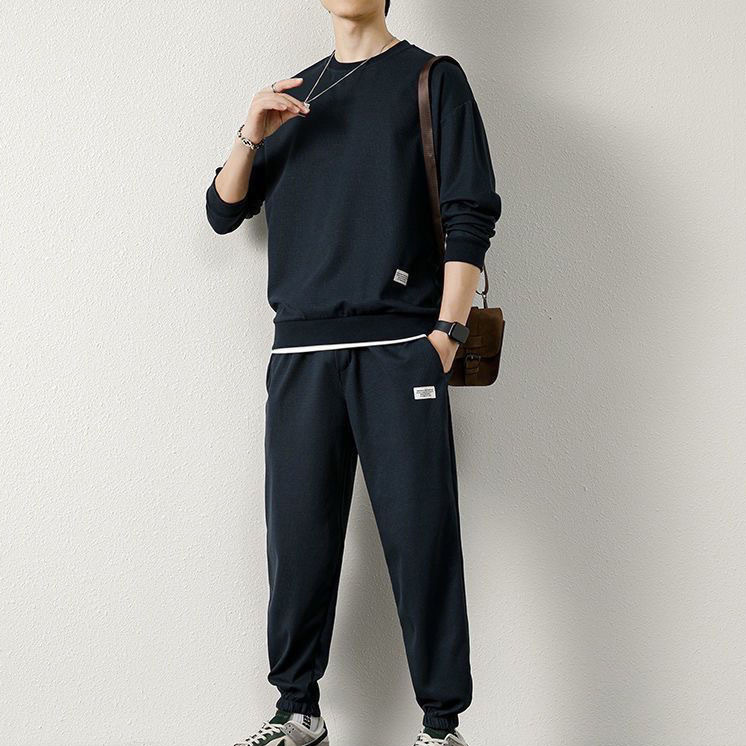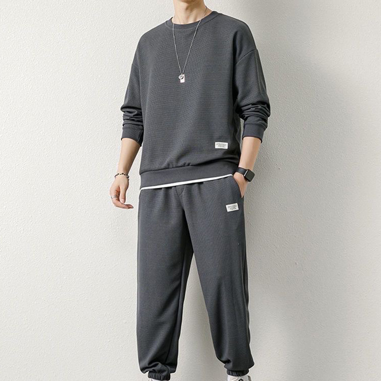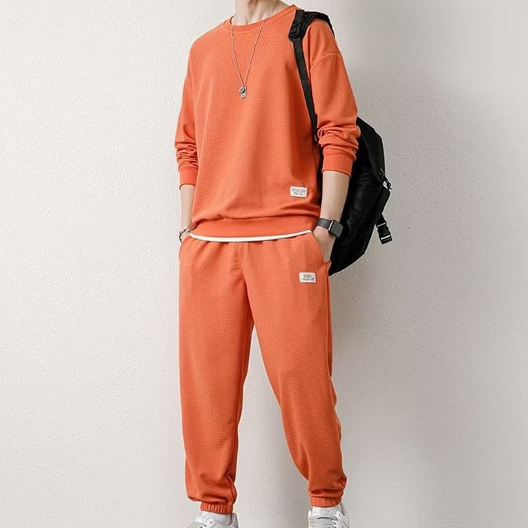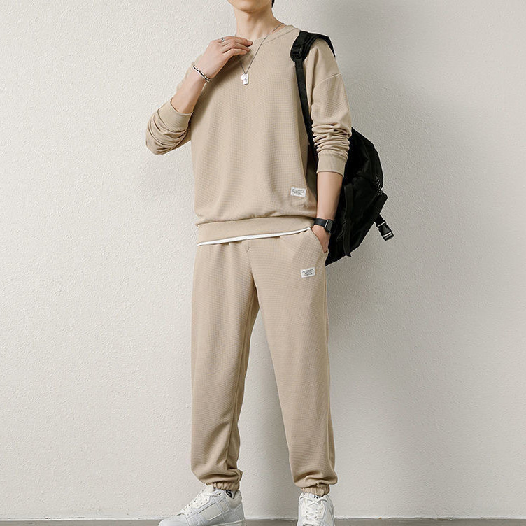 와플 긴팔 세트 남성용 셔츠 캐주얼 세트 옷 봄 가을 겨울 유행 단색 느슨한 가짜 투피스 티셔츠스토어 가기