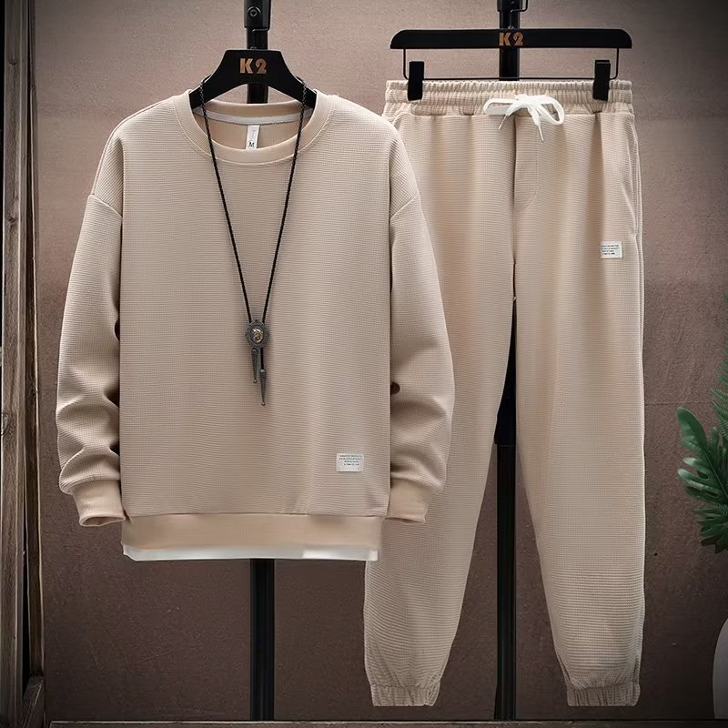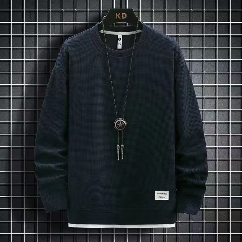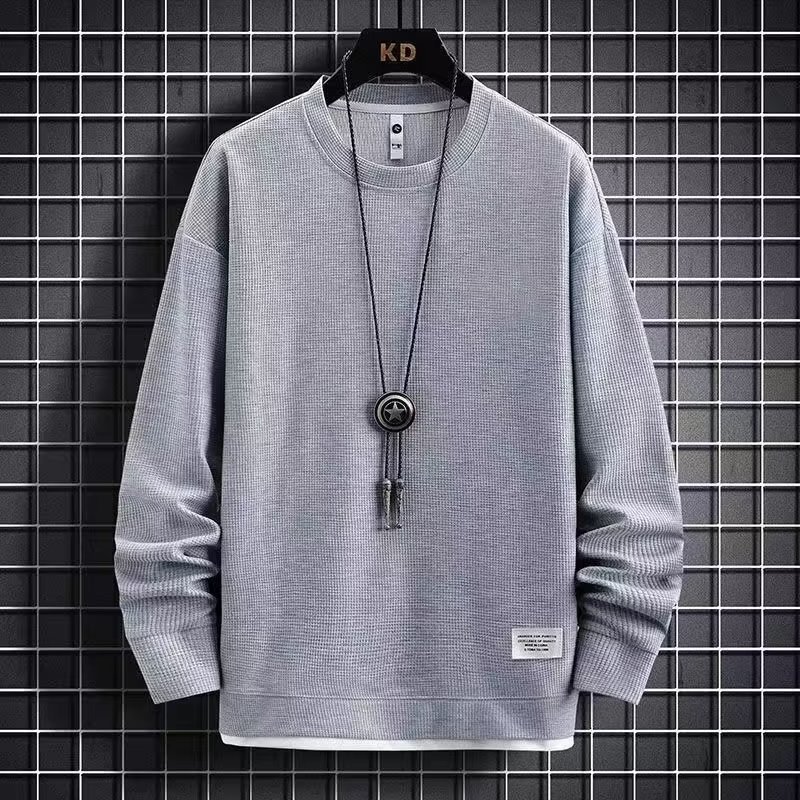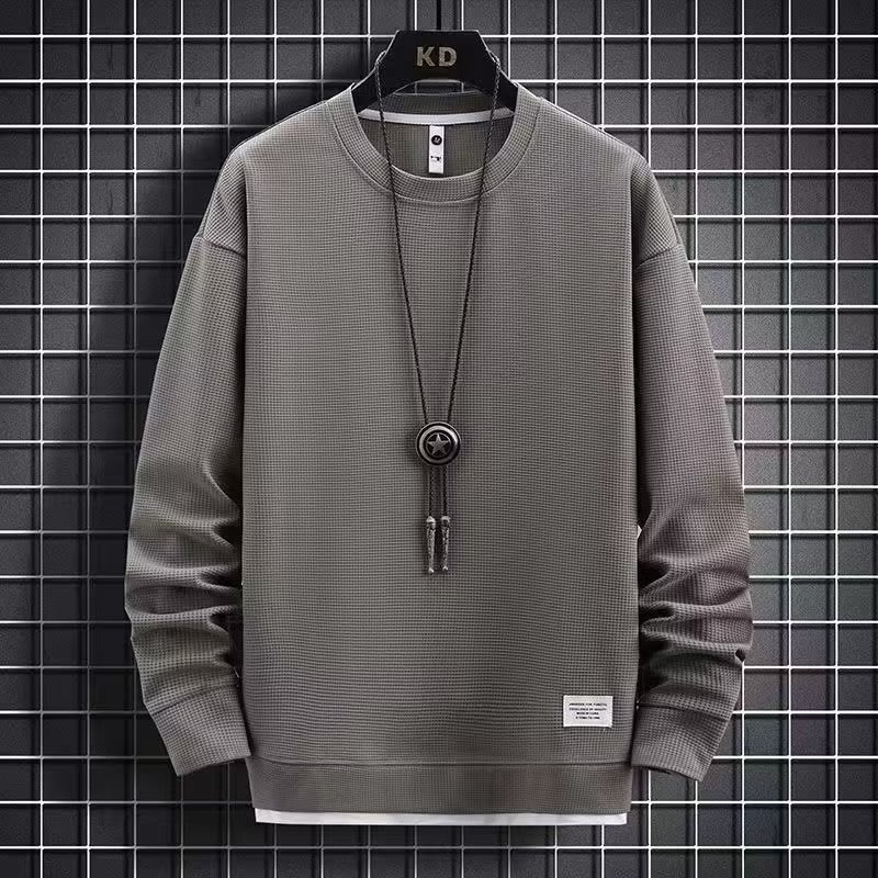 와플 긴팔 세트 남성용 셔츠 캐주얼 세트 옷 봄 가을 겨울 유행 단색 느슨한 가짜 투피스 티셔츠