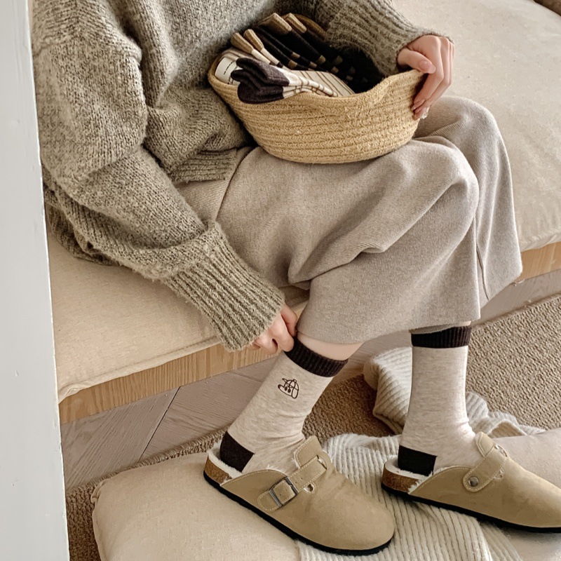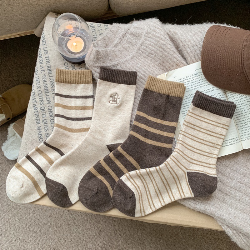 안티 필링 캐시미어-다크 브라운 줄무늬 만화 두꺼운 따뜻한 여성의 중간 길이 양말 자수 귀여운 필링 스타킹스토어 가기
