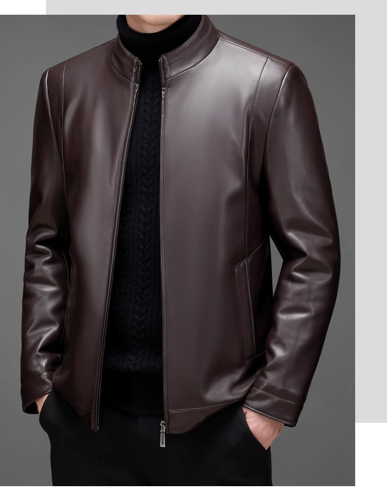 • 카멜 컬러 스탠드 칼라 가죽 재킷 - 기모 안감