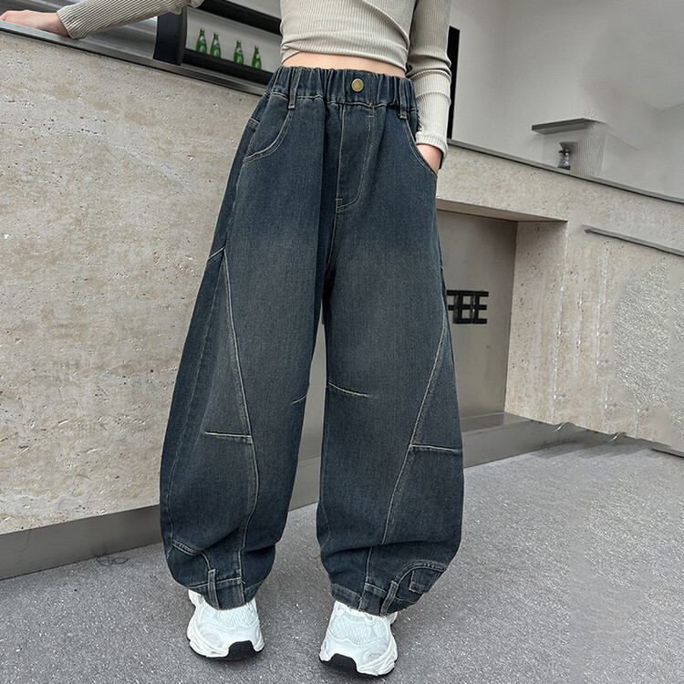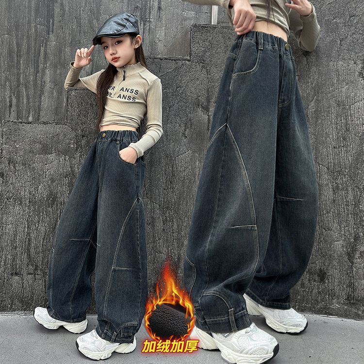 소녀 가을과 겨울 바지 2024 어린이 느슨한 기모 청바지 넓은 다리 만도 바지 조수의 새로운 한국어 버전