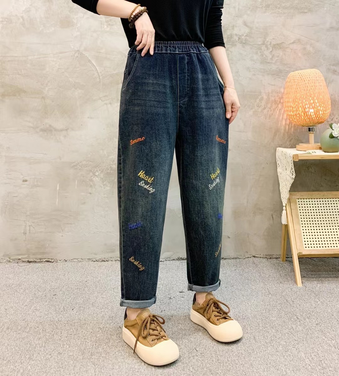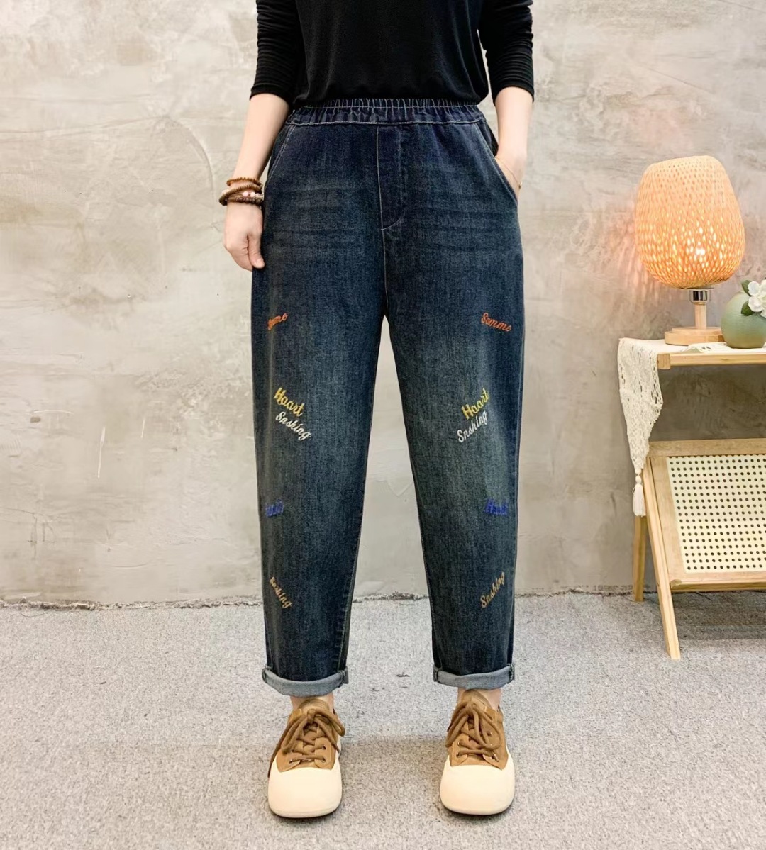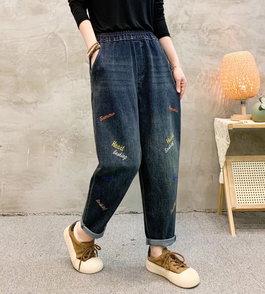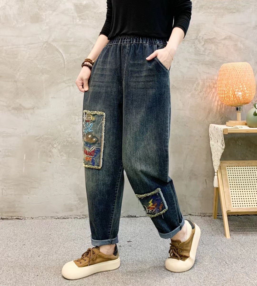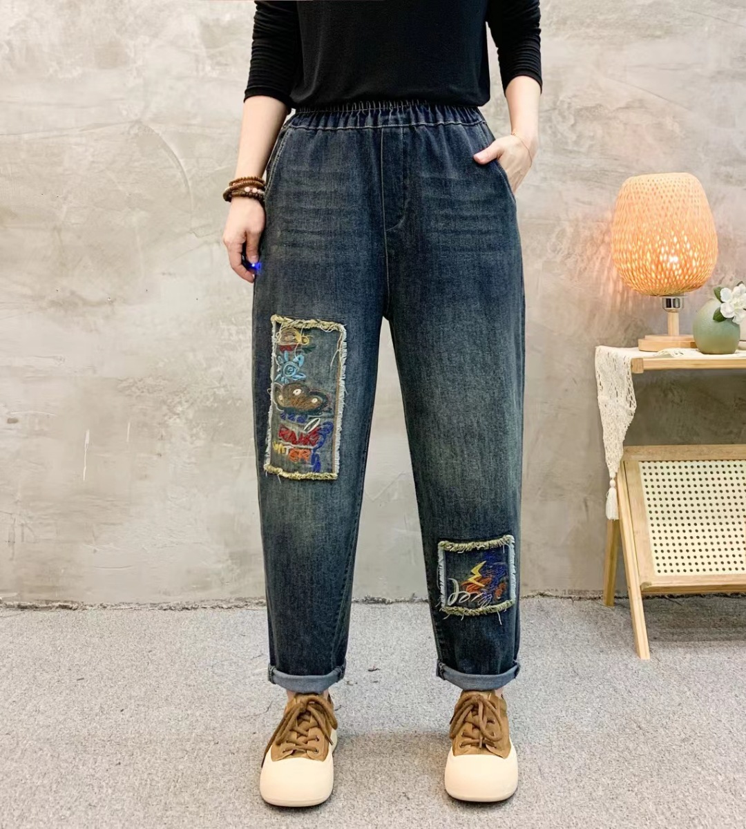 높은 탄성 Harlan 청바지 새로운 자수 Gouhua Applique Braced 느슨한 높은 허리 탄성 바지 여성 도매스토어 가기