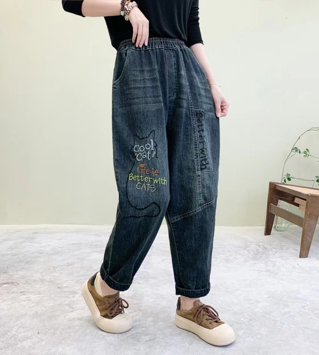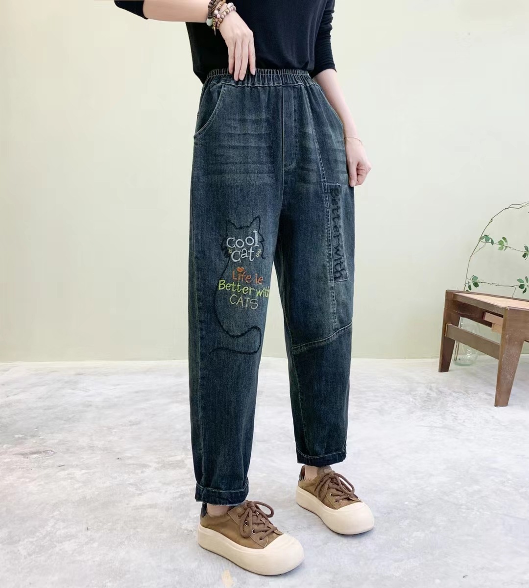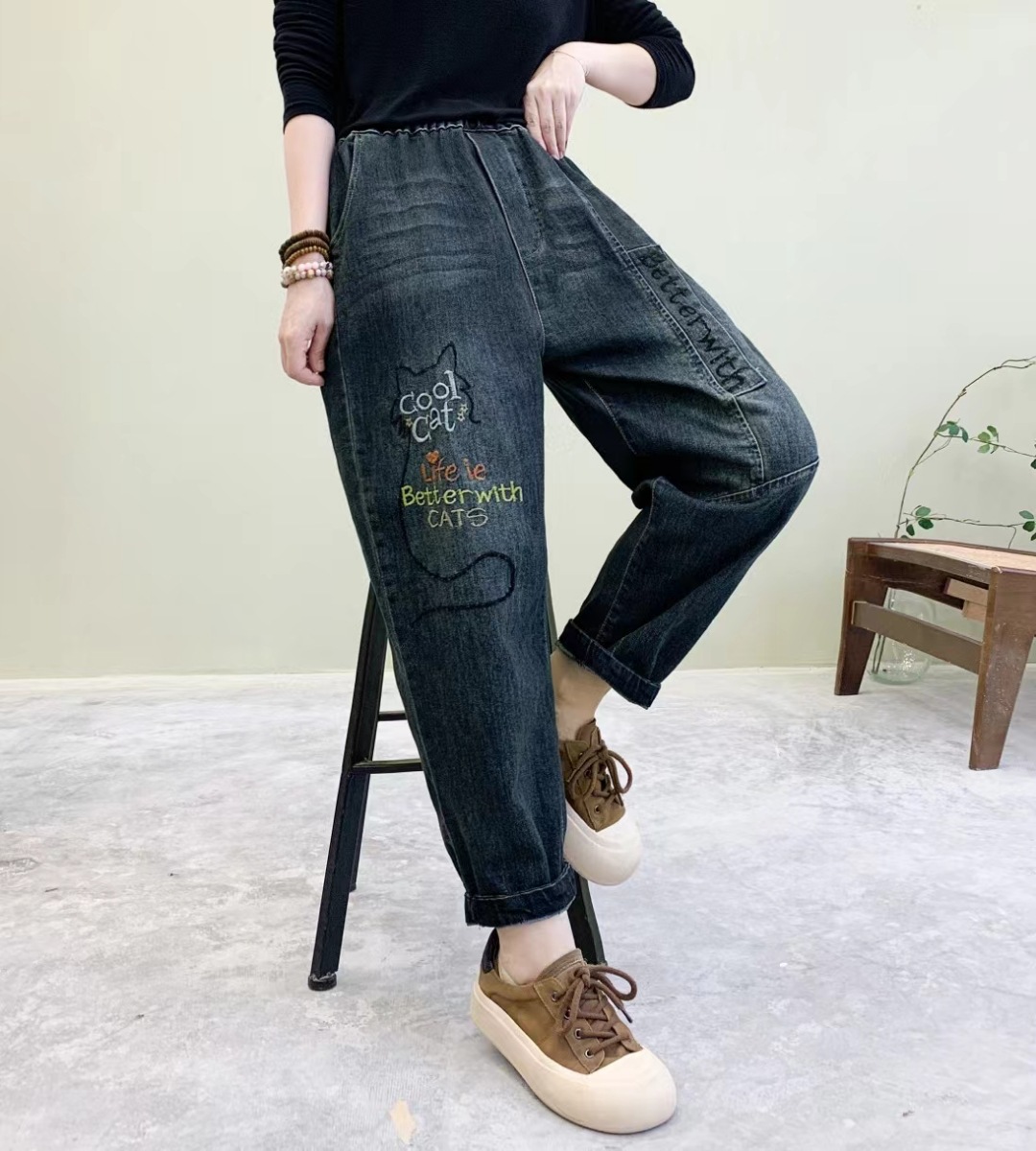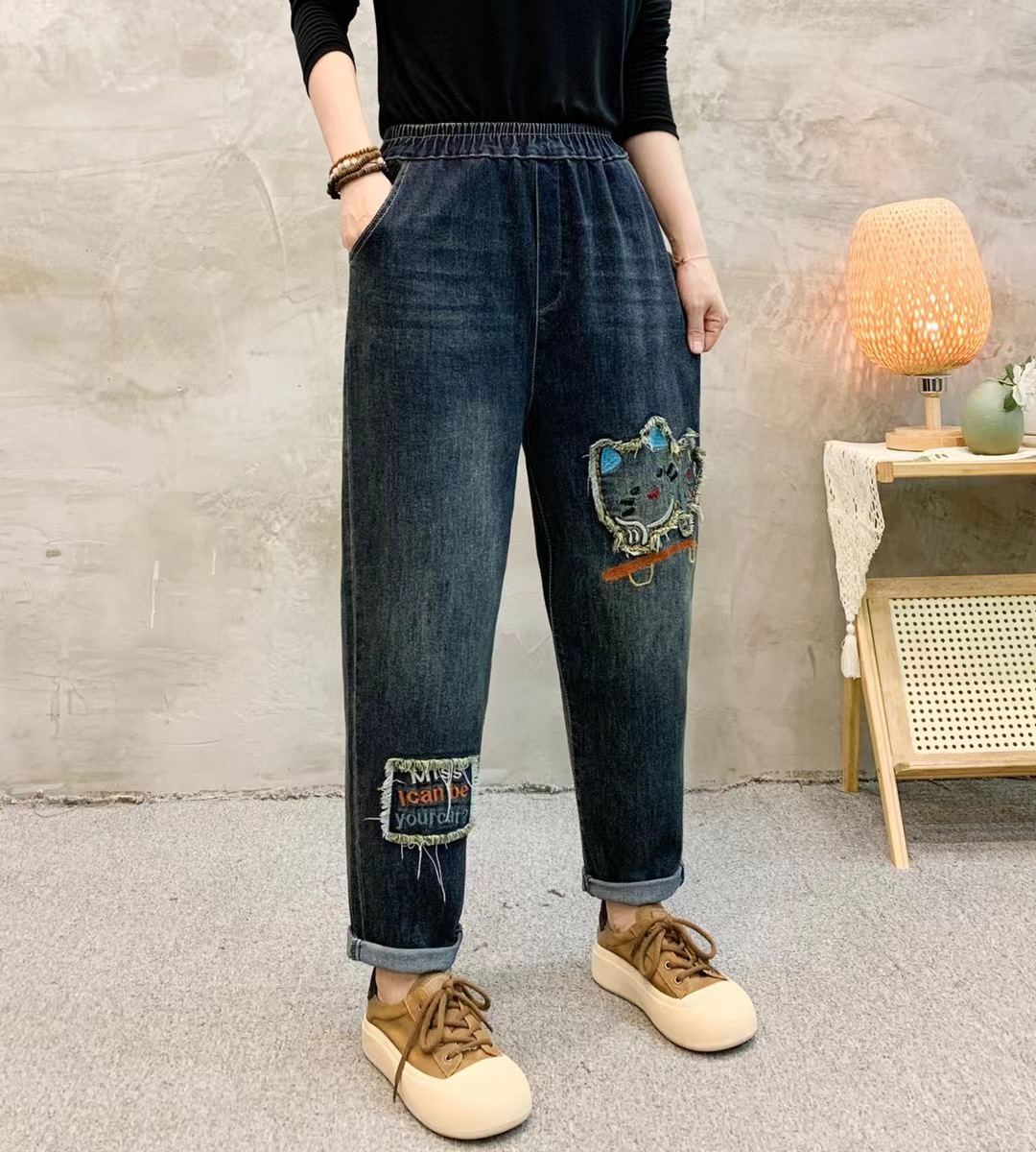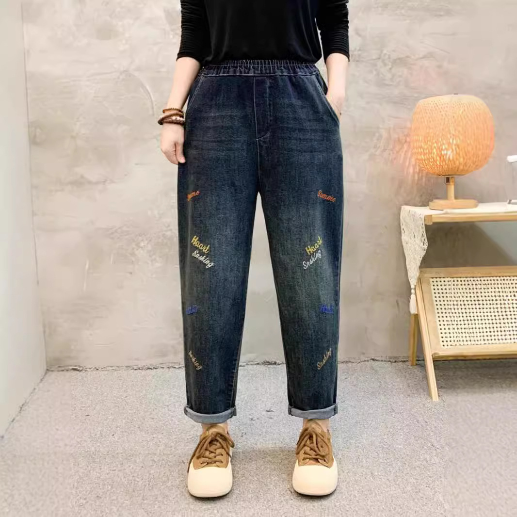 높은 탄성 Harlan 청바지 새로운 자수 Gouhua Applique Braced 느슨한 높은 허리 탄성 바지 여성 도매스토어 가기