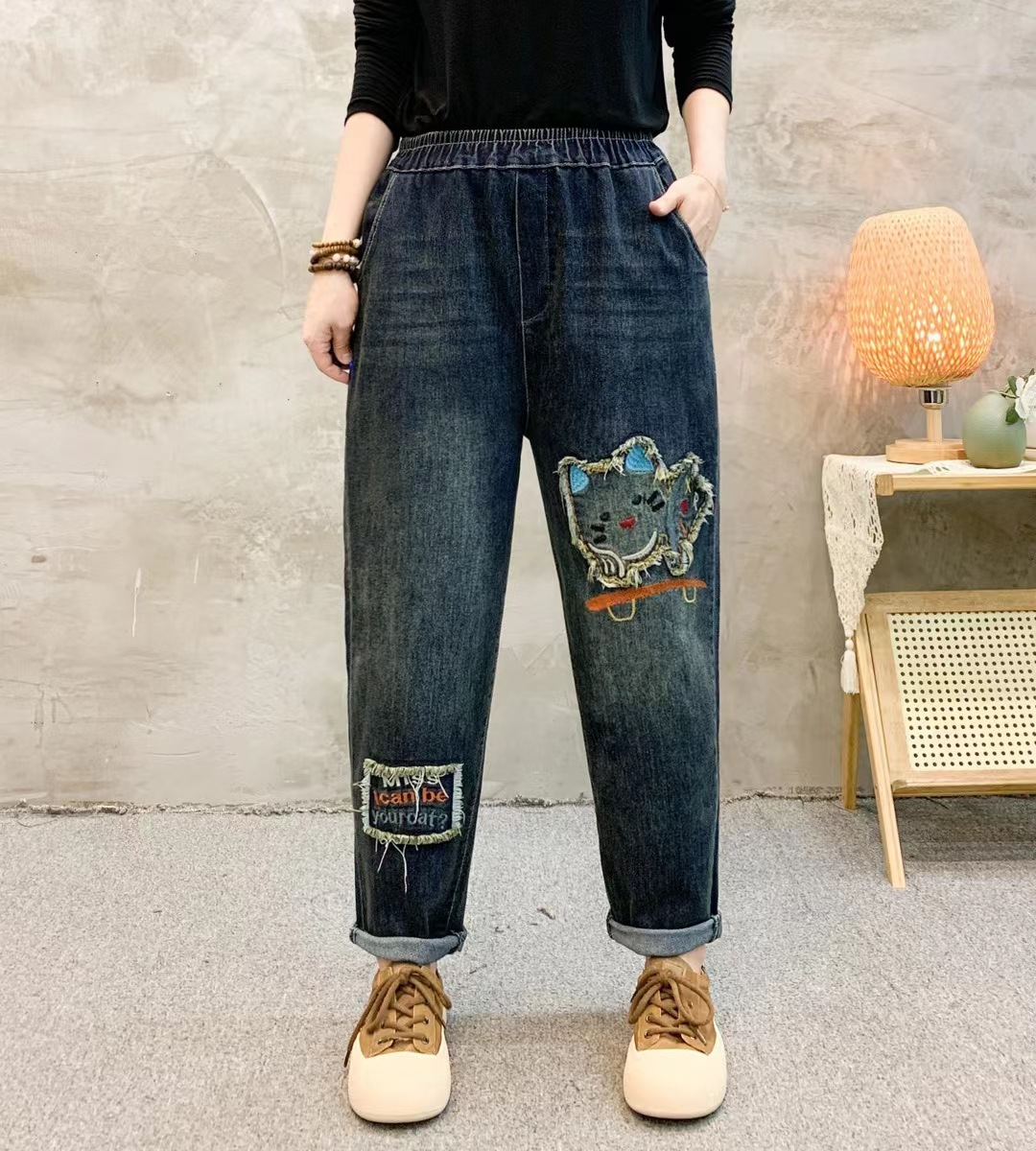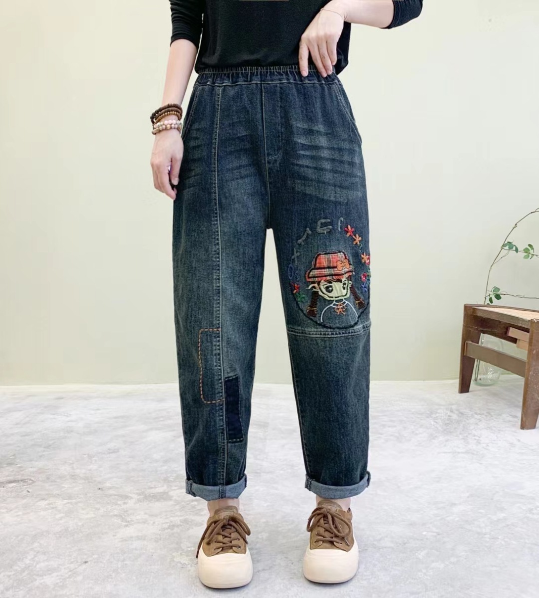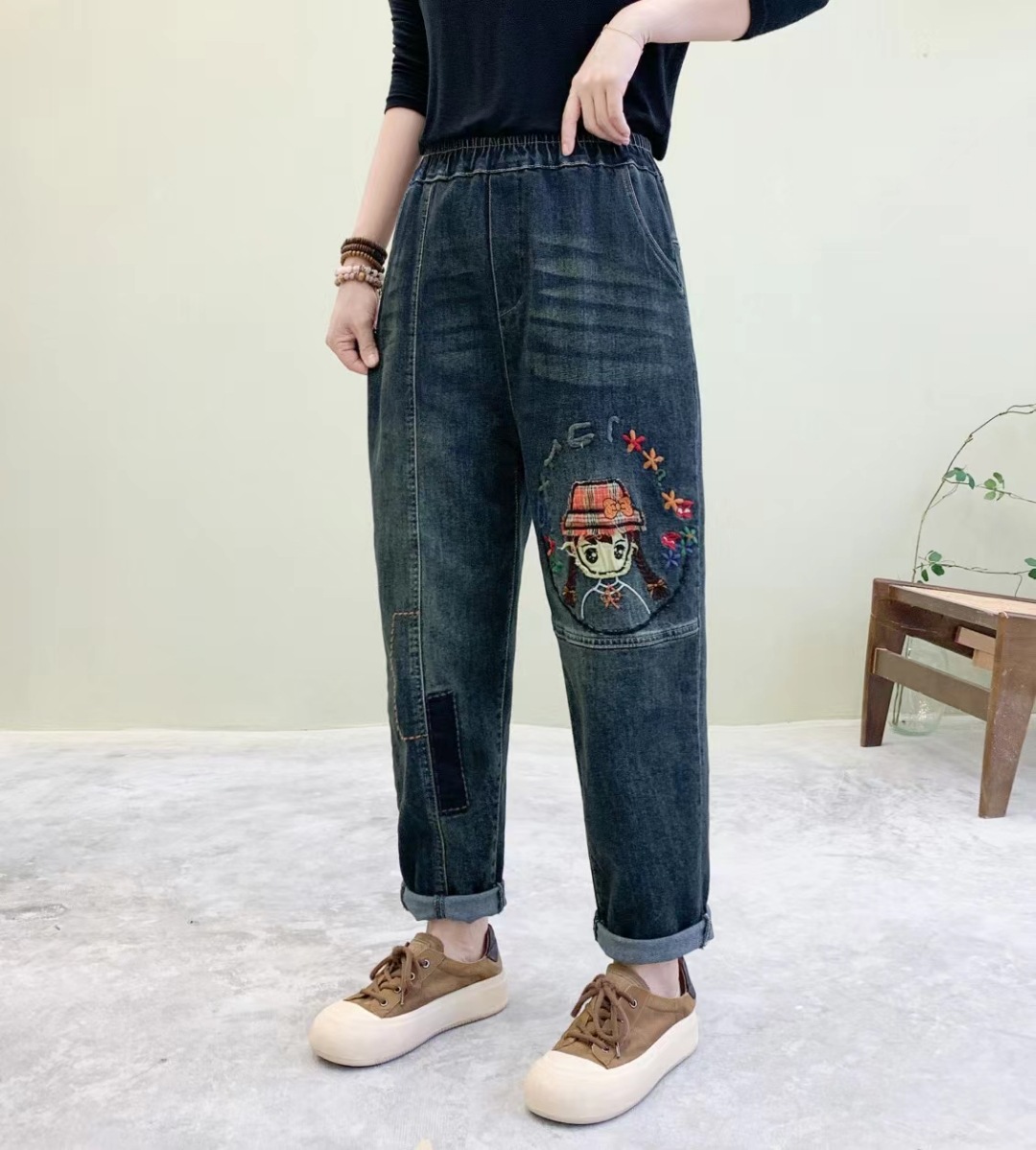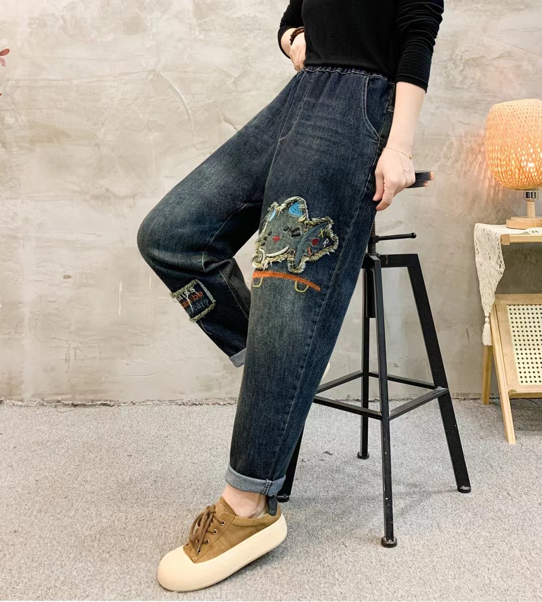 높은 탄성 Harlan 청바지 새로운 자수 Gouhua Applique Braced 느슨한 높은 허리 탄성 바지 여성 도매