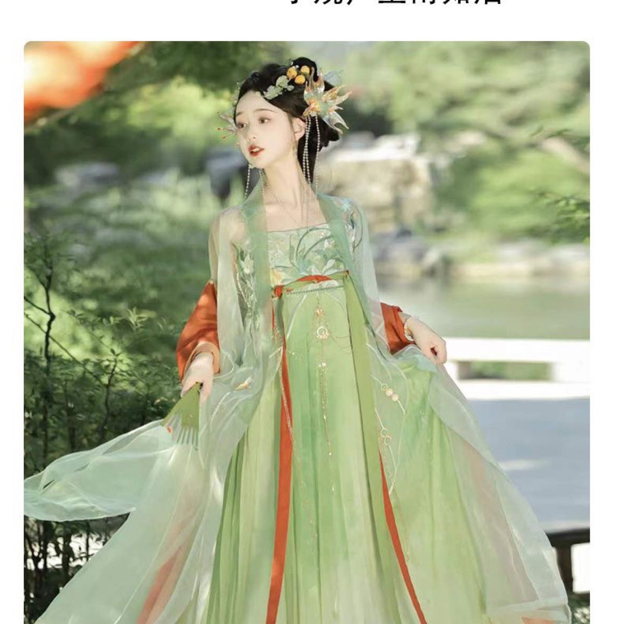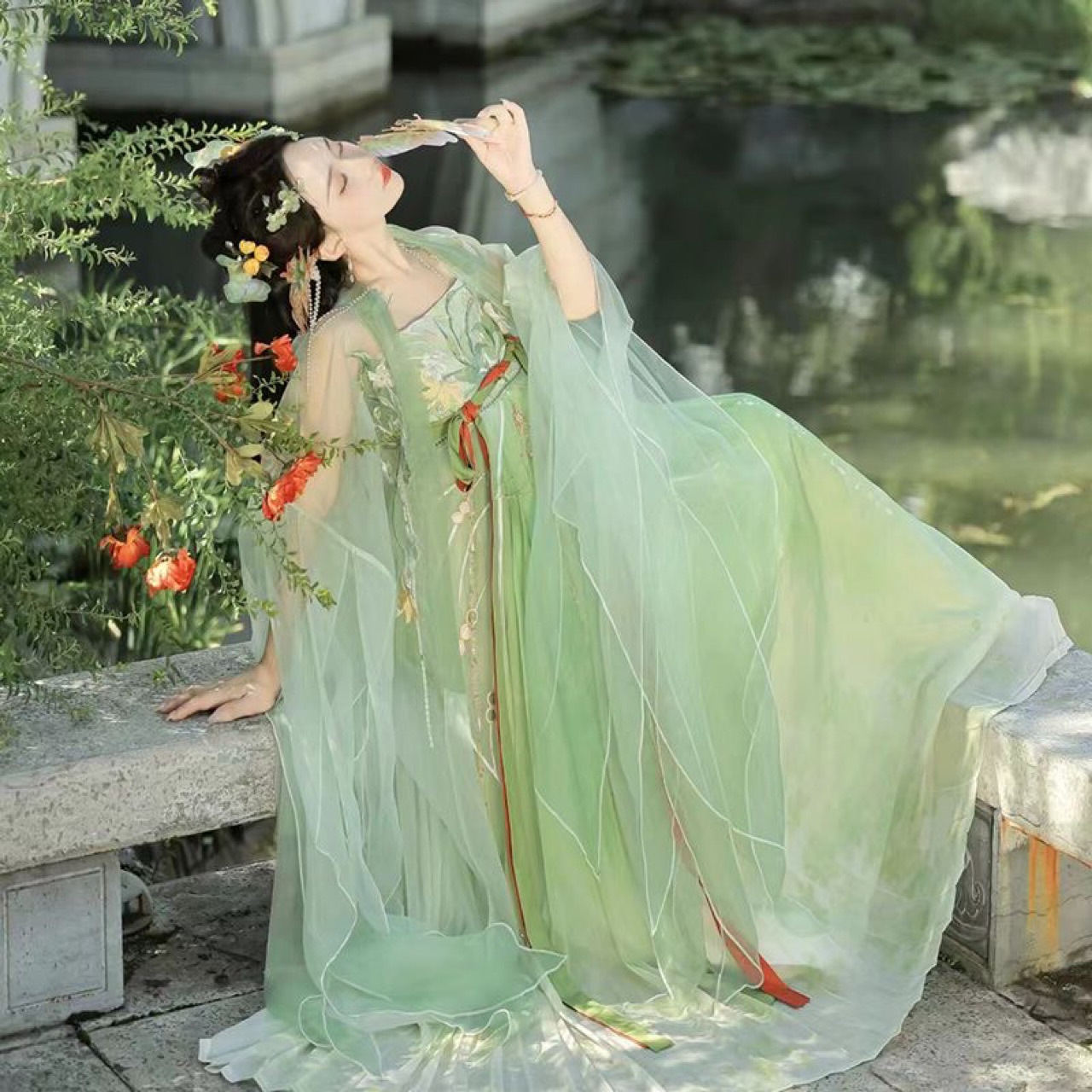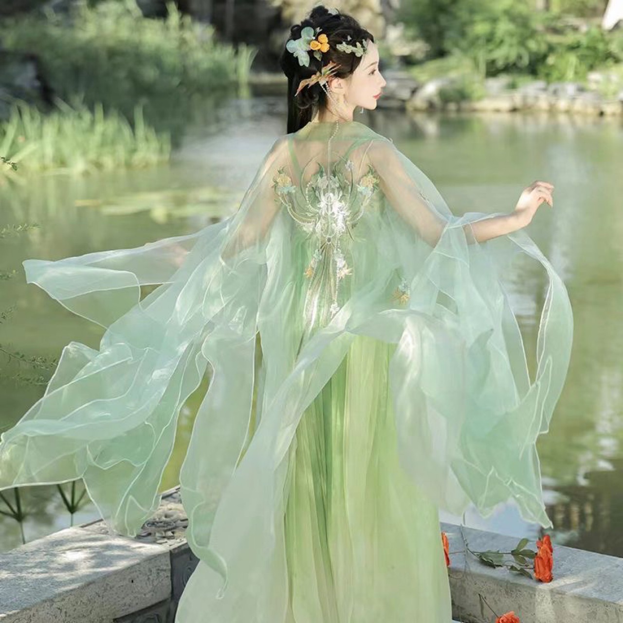 새로운 성인 Hanfu Qingchuan 녹색 중공업 자수 골동품 큰 소매 셔츠 슈퍼 요정 봄과 가을 사진 요정 스타일