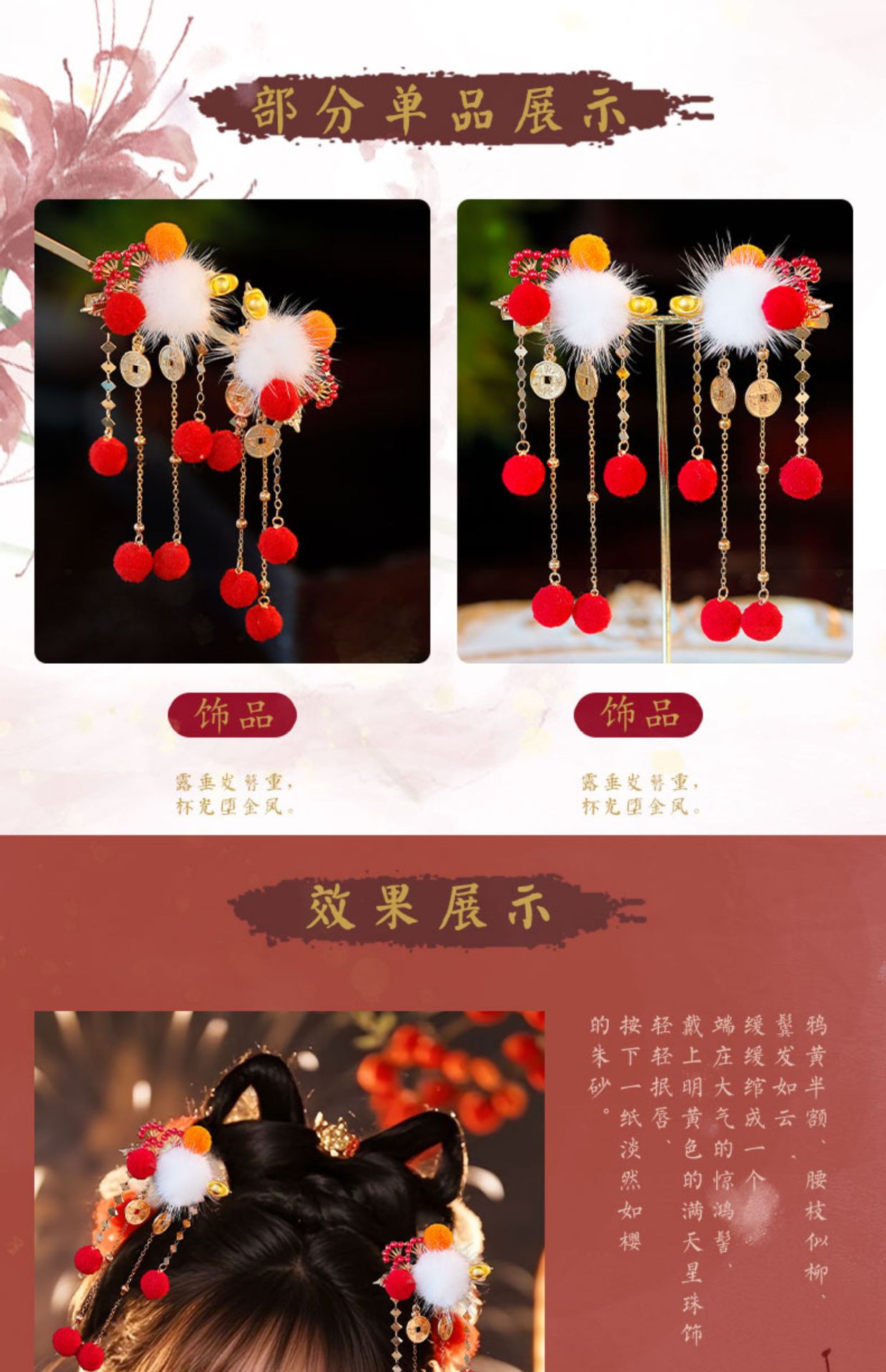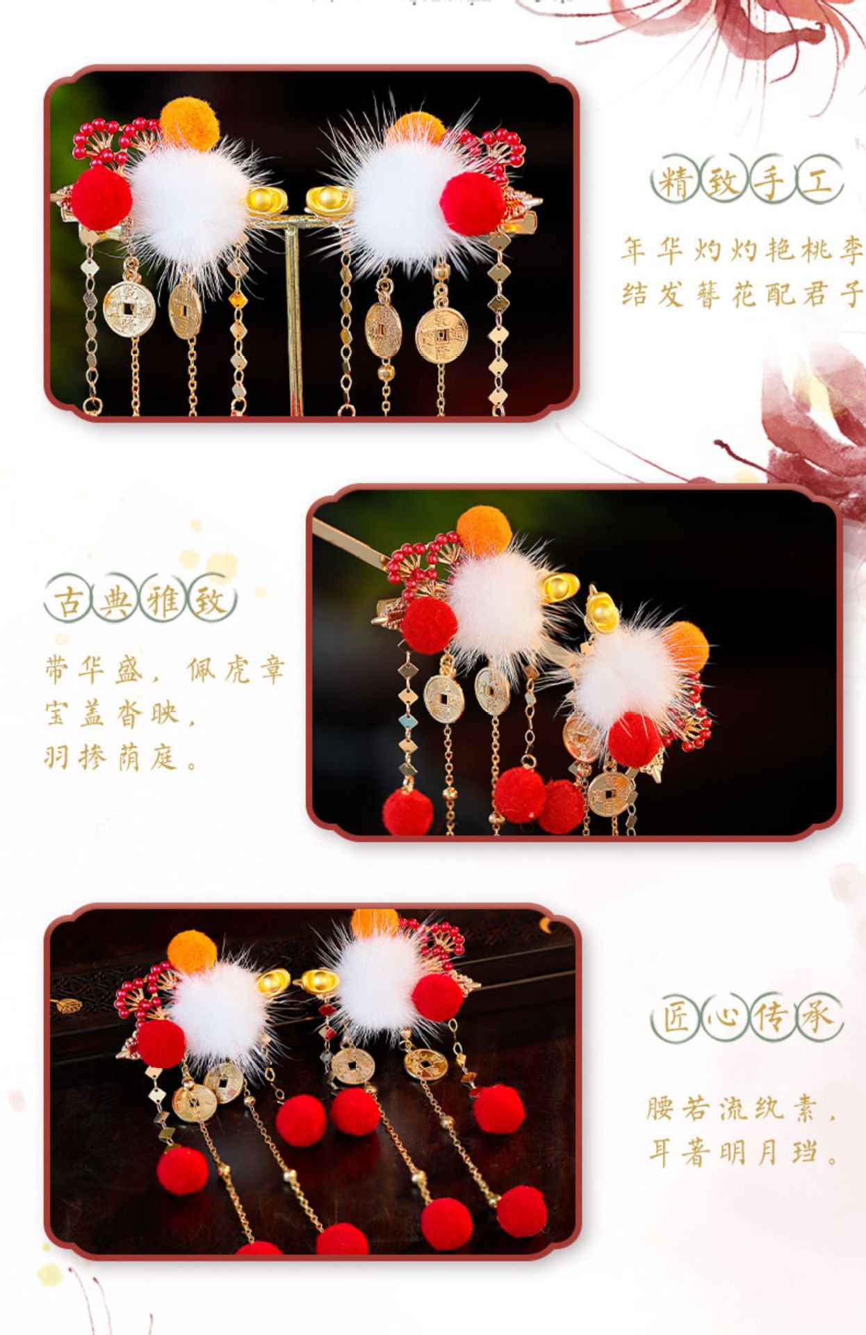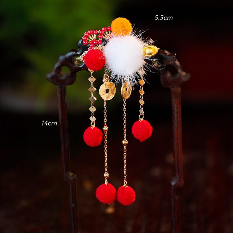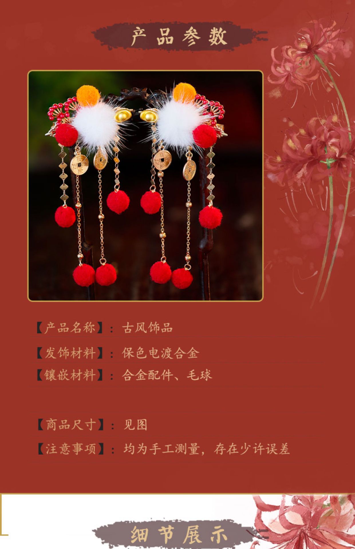 부 신년의 작은 신 빨간 술 머리 공 머리 클립 액세서리 레트로 모피 한푸 워킹 헤드웨어 Yuanbao 사이드 클립