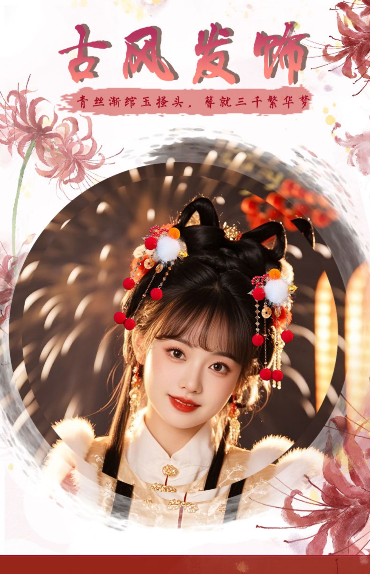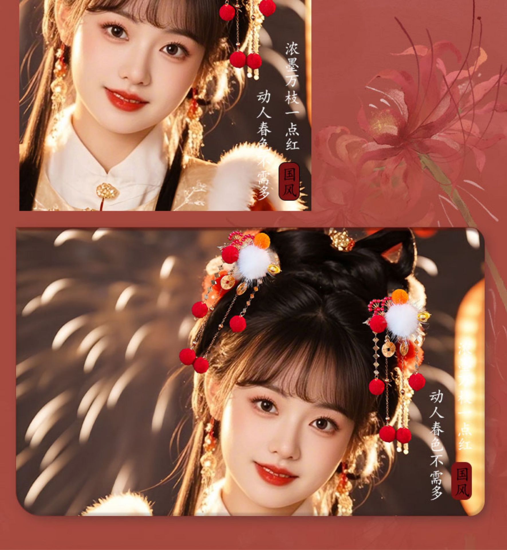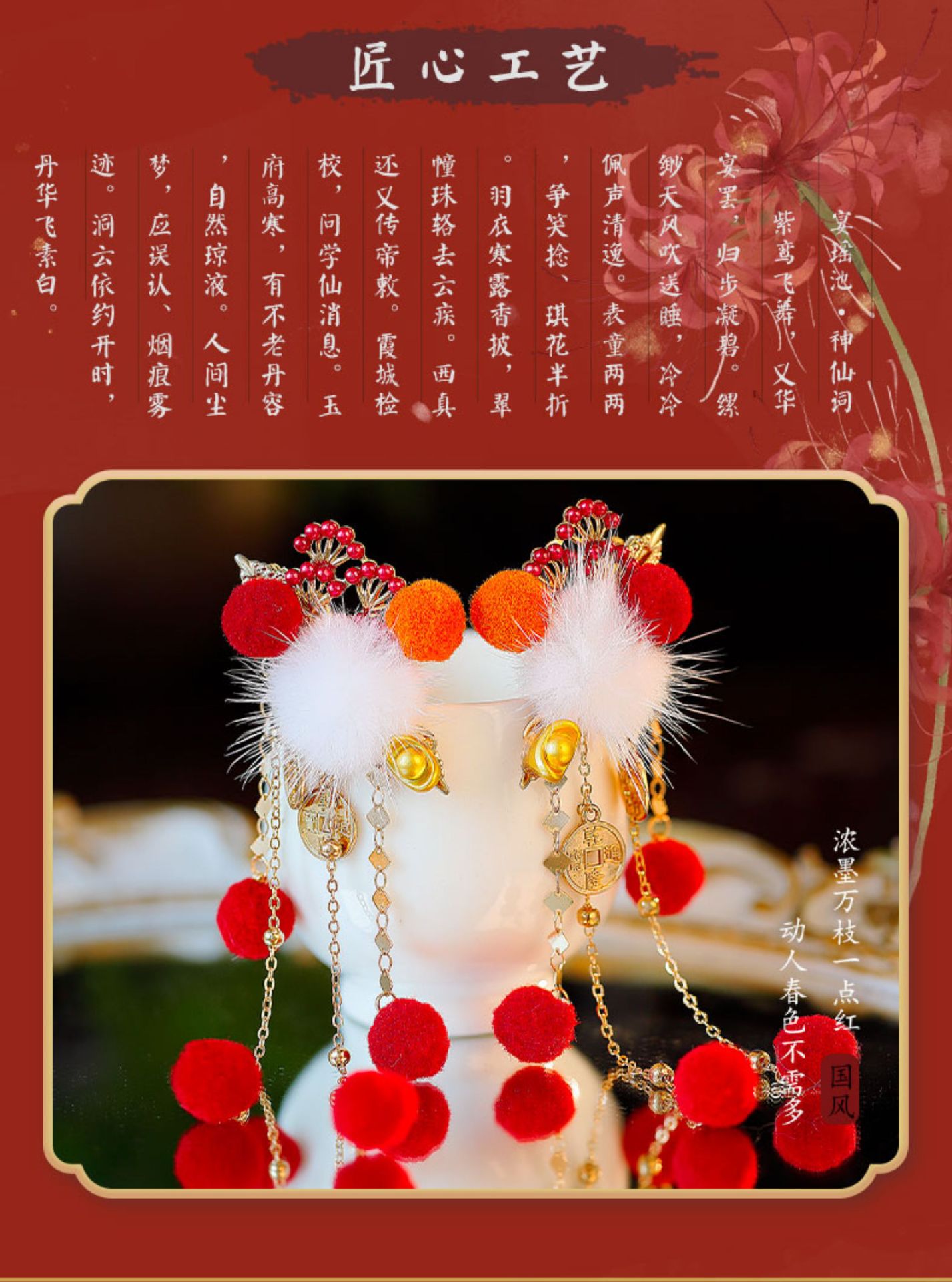 부 신년의 작은 신 빨간 술 머리 공 머리 클립 액세서리 레트로 모피 한푸 워킹 헤드웨어 Yuanbao 사이드 클립