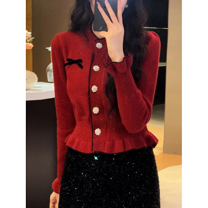크리스마스 레드 샤넬 스타일 짧은 활 스웨터 코트 여성용 새로운 슬림 핏 긴팔 니트 카디건 탑