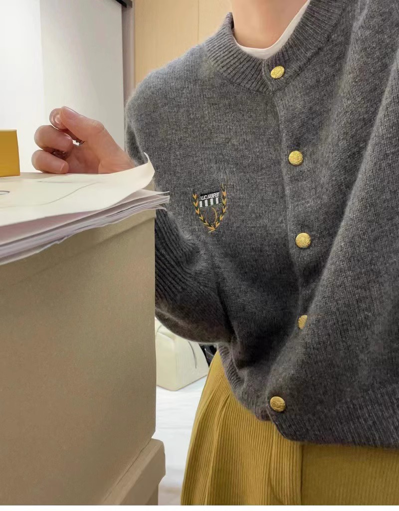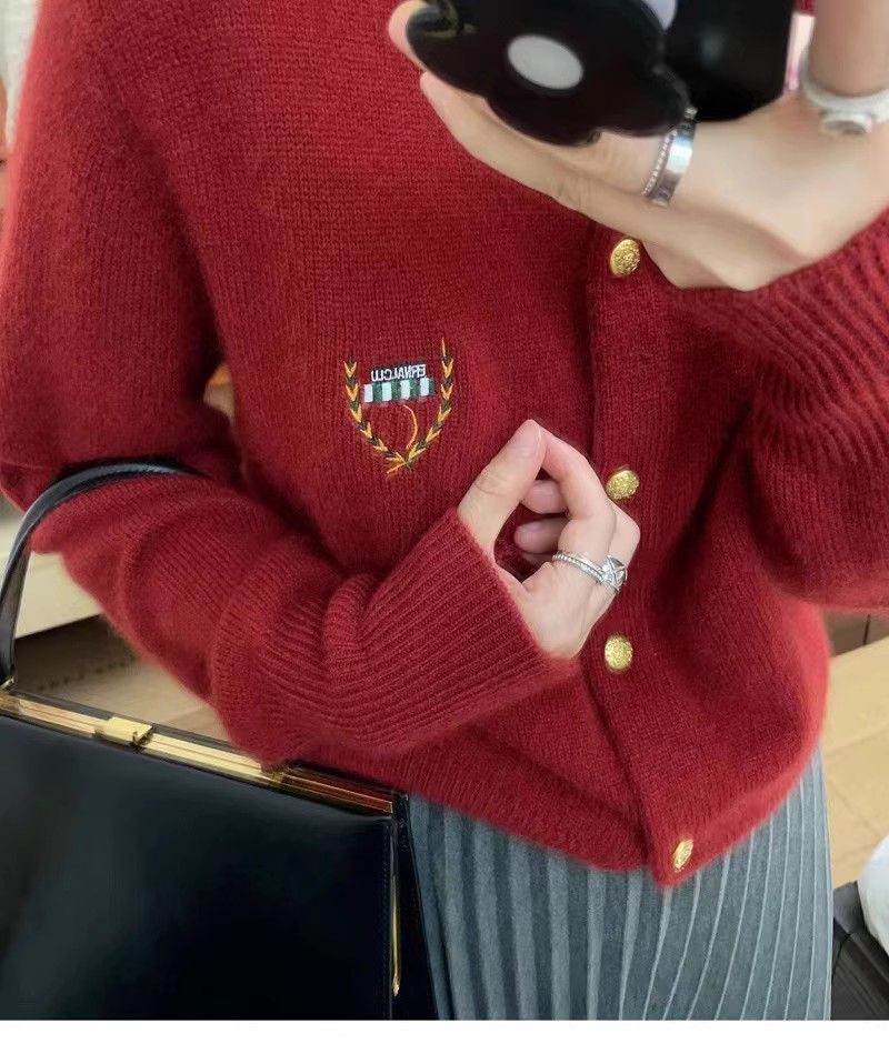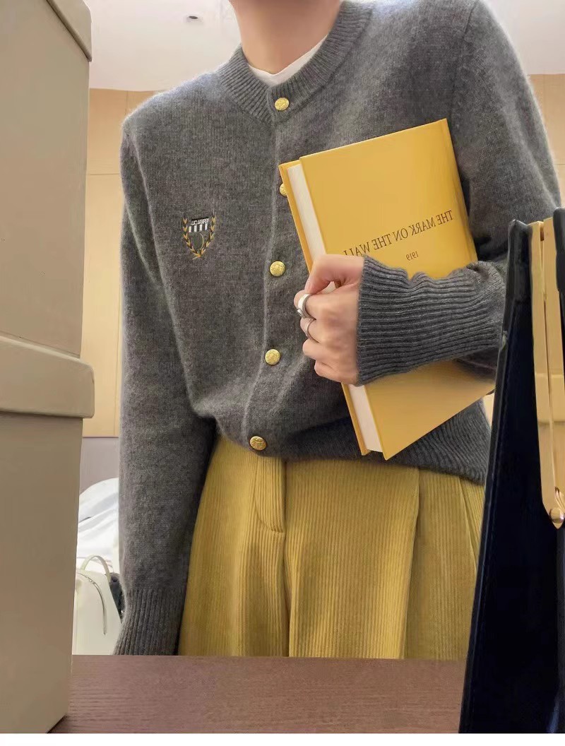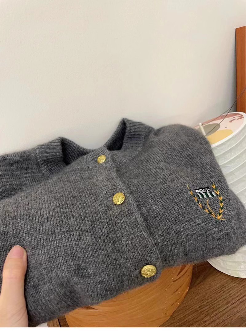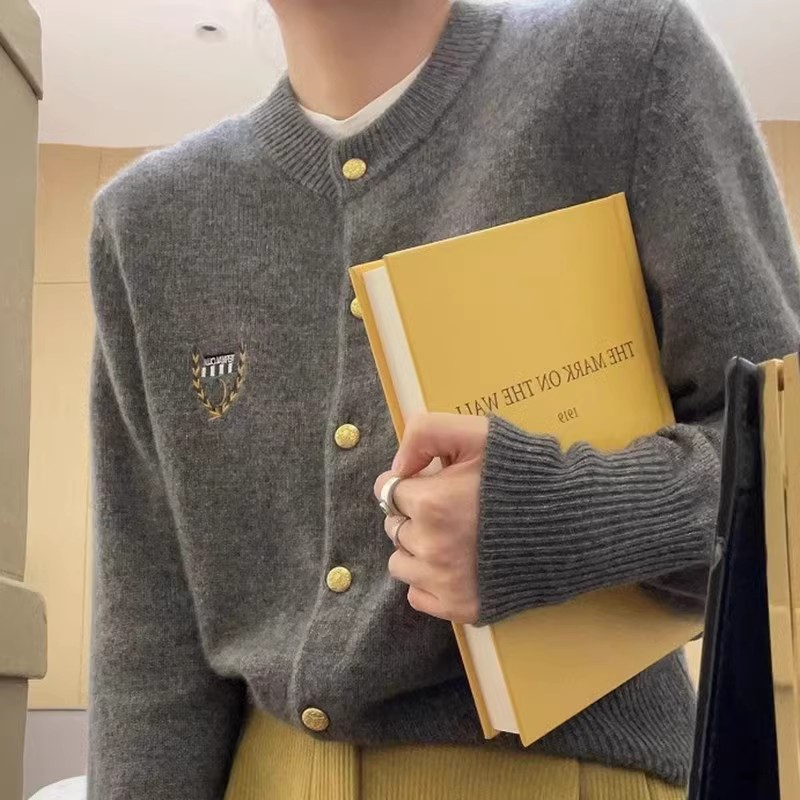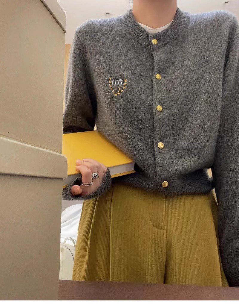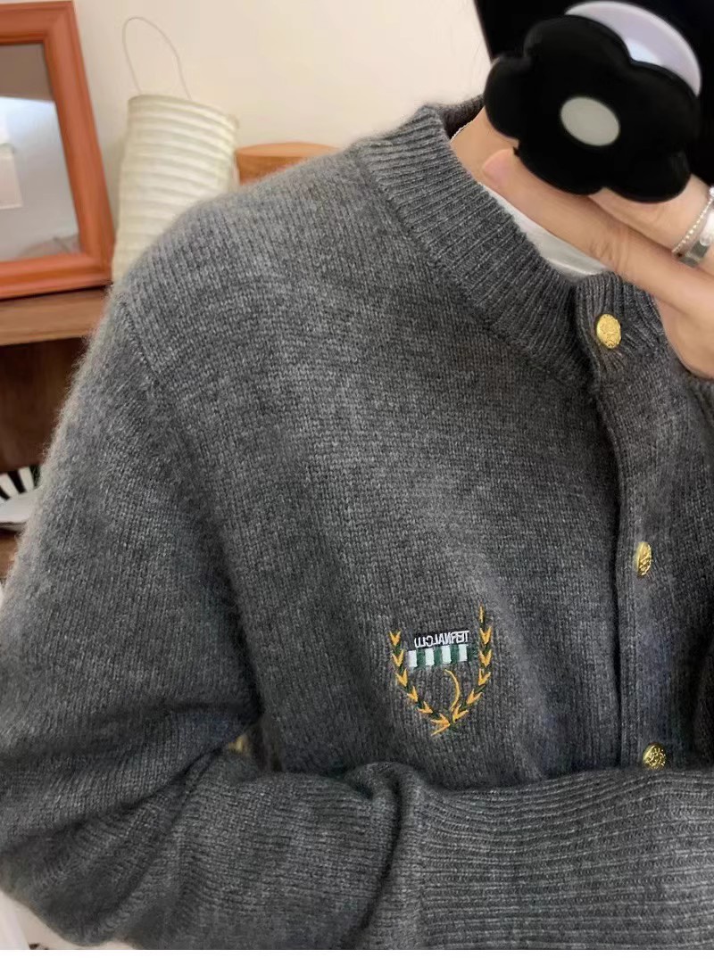 100 순수 양모 카디건 여성 가을과 겨울 새로운 둥근 목 자수 짧은 니트 스웨터 재킷 느슨한 캐주얼 탑