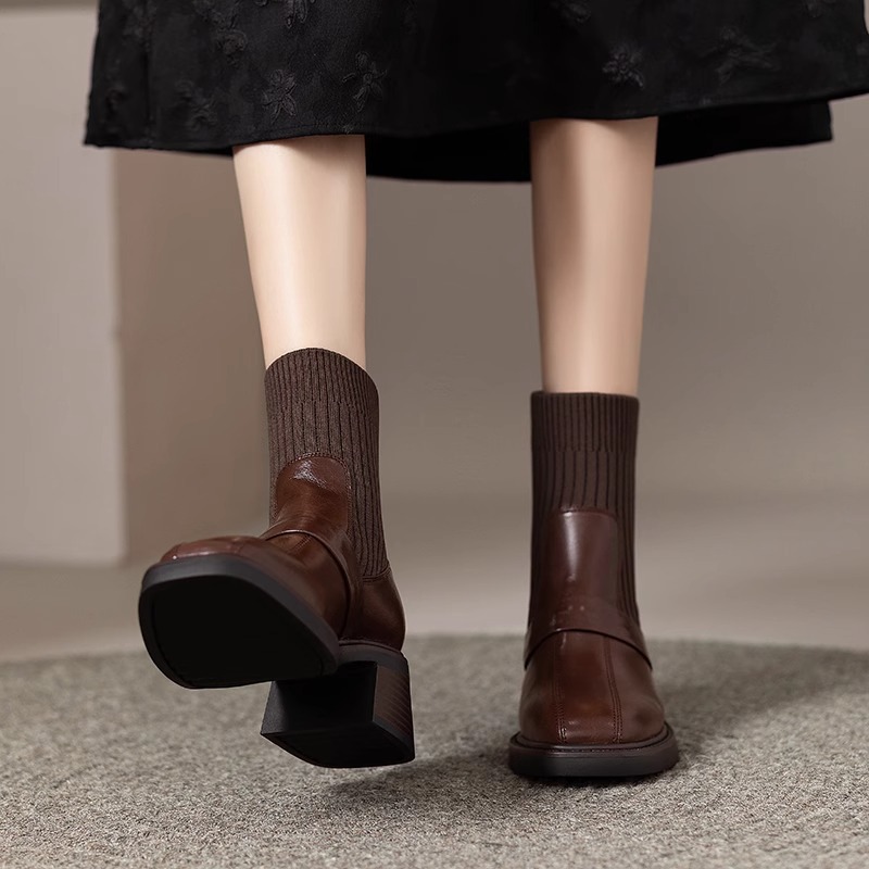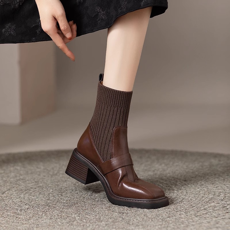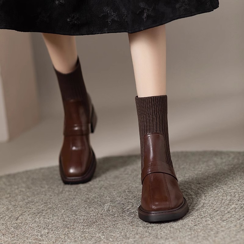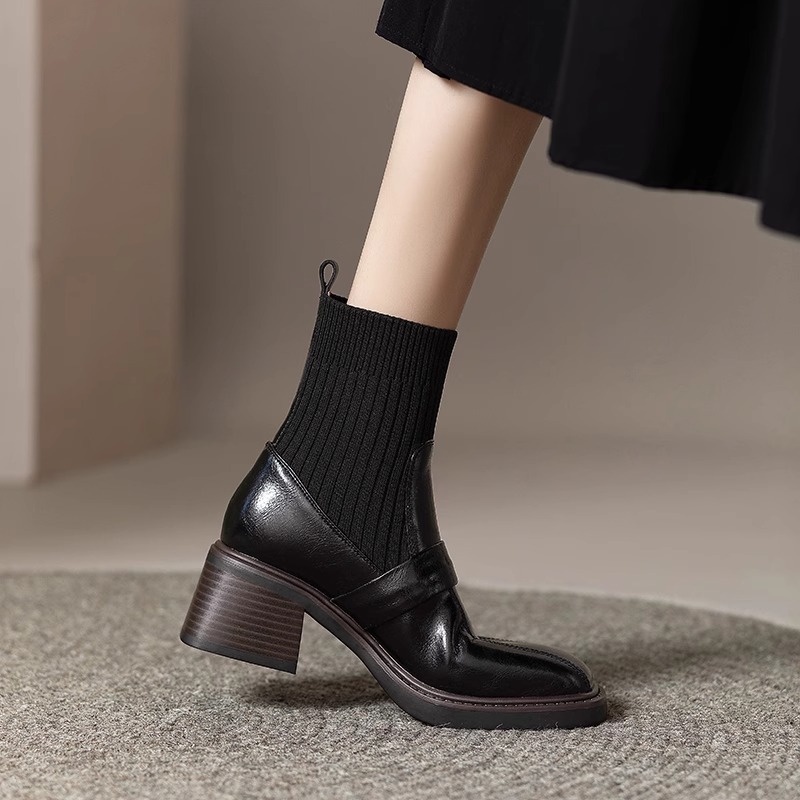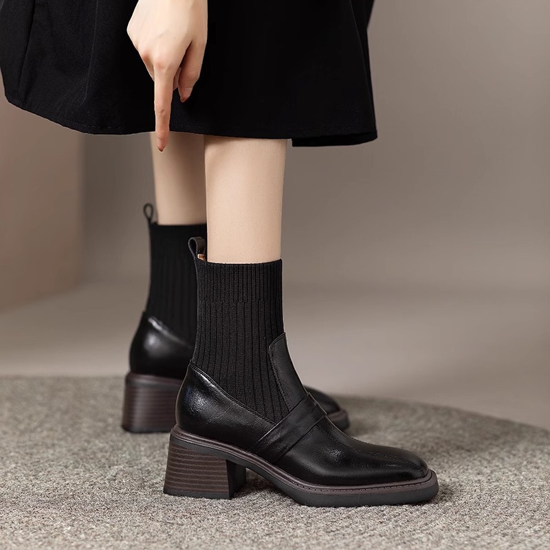 Cowhide 버전 ~ 스퀘어 헤드 하이힐 쇼트 부츠 여성 니트 탄성 양말 부츠 얇은 부츠 두꺼운 힐 작은 마틴 부츠 싱글 부츠