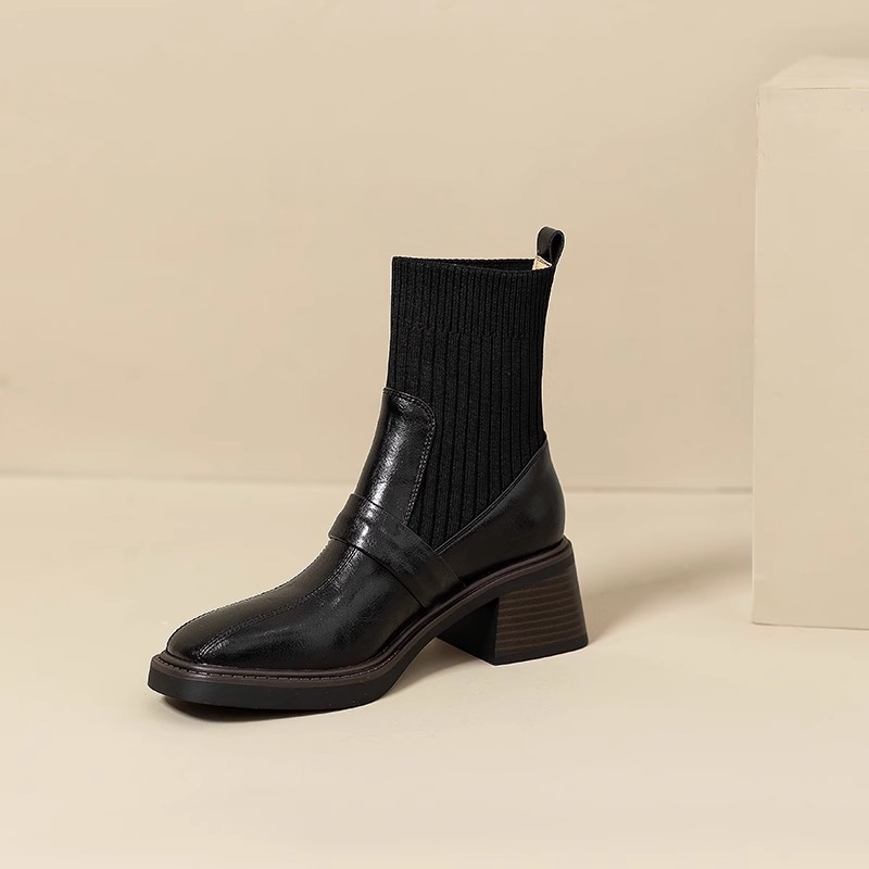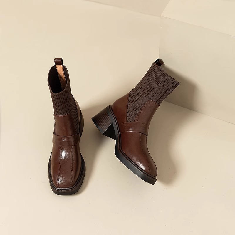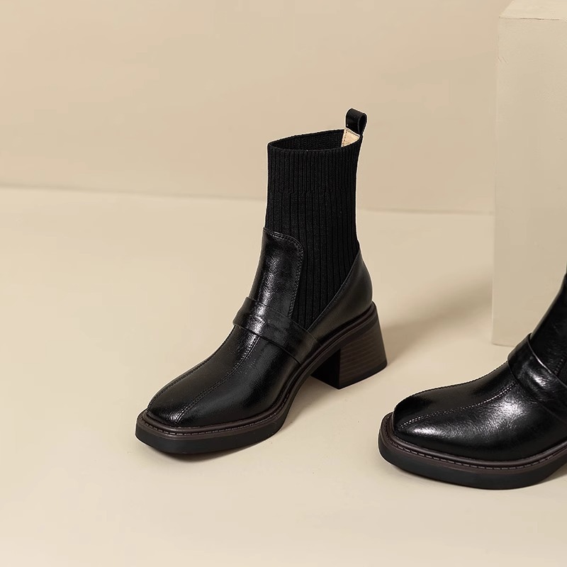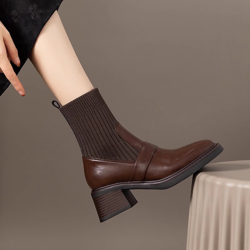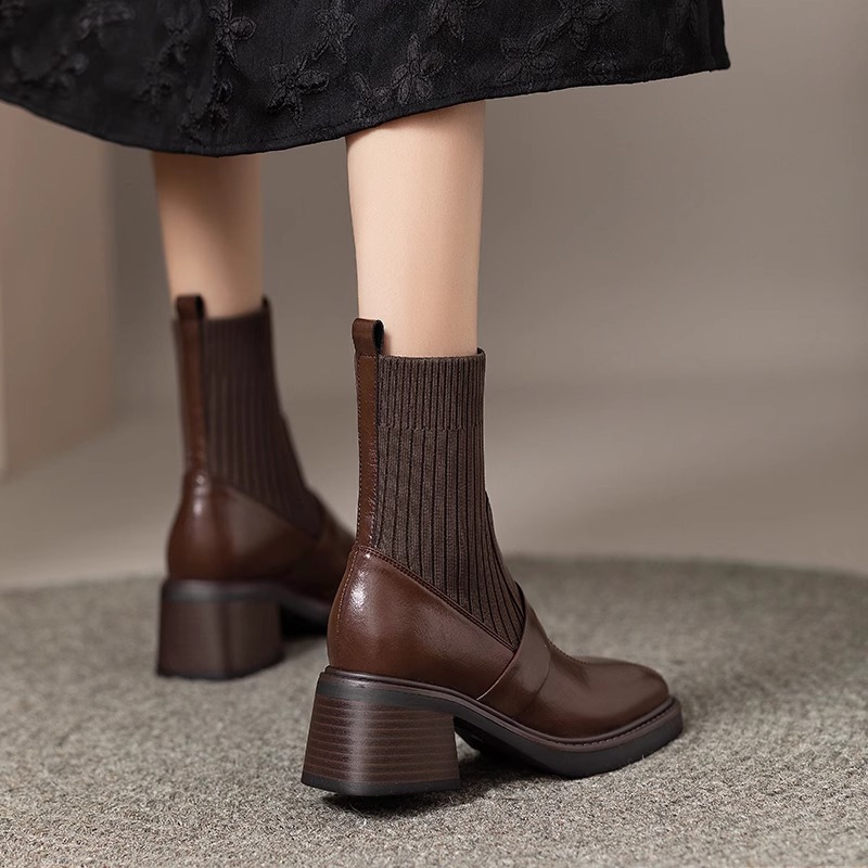Cowhide 버전 ~ 스퀘어 헤드 하이힐 쇼트 부츠 여성 니트 탄성 양말 부츠 얇은 부츠 두꺼운 힐 작은 마틴 부츠 싱글 부츠