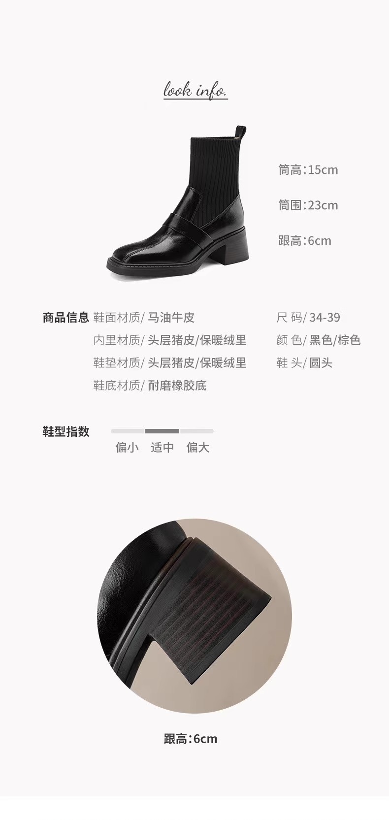 Cowhide 버전 ~ 스퀘어 헤드 하이힐 쇼트 부츠 여성 니트 탄성 양말 부츠 얇은 부츠 두꺼운 힐 작은 마틴 부츠 싱글 부츠스토어 가기
