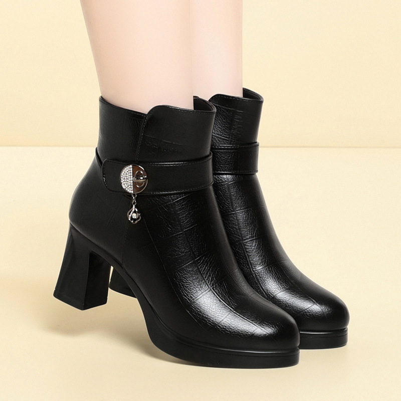 부드러운 가죽 짧은 부츠 여성용 하이힐 두꺼운 겨울 새로운 벨벳 여성 부츠 기모 두꺼운 중년 어머니 패션 여성 부츠