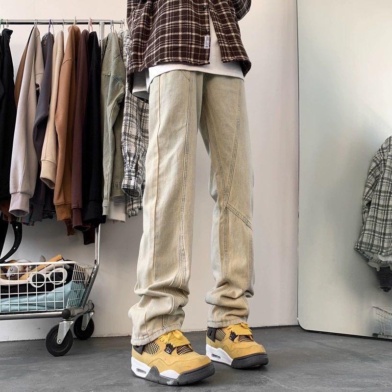 아메리칸 스타일 레트로 옐로우 머드 염색 청바지 남성 봄과 가을 바이브 마이크로 라가오 스트리트 스트레이트 튜브 청소년 스티칭 캐주얼 바지