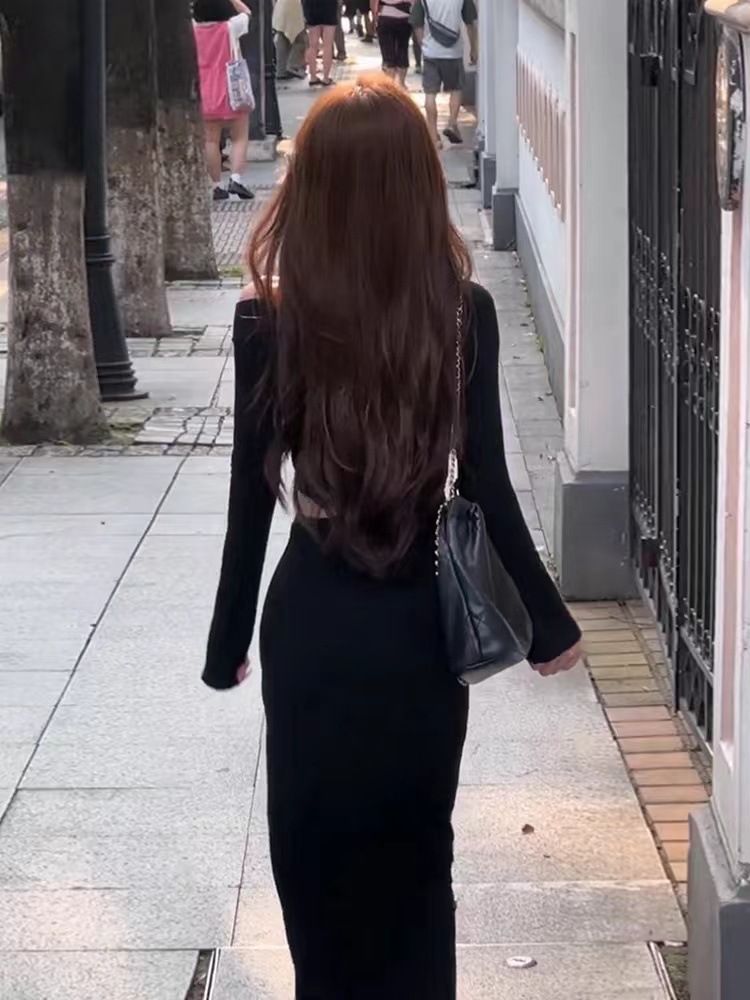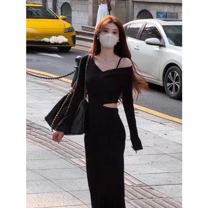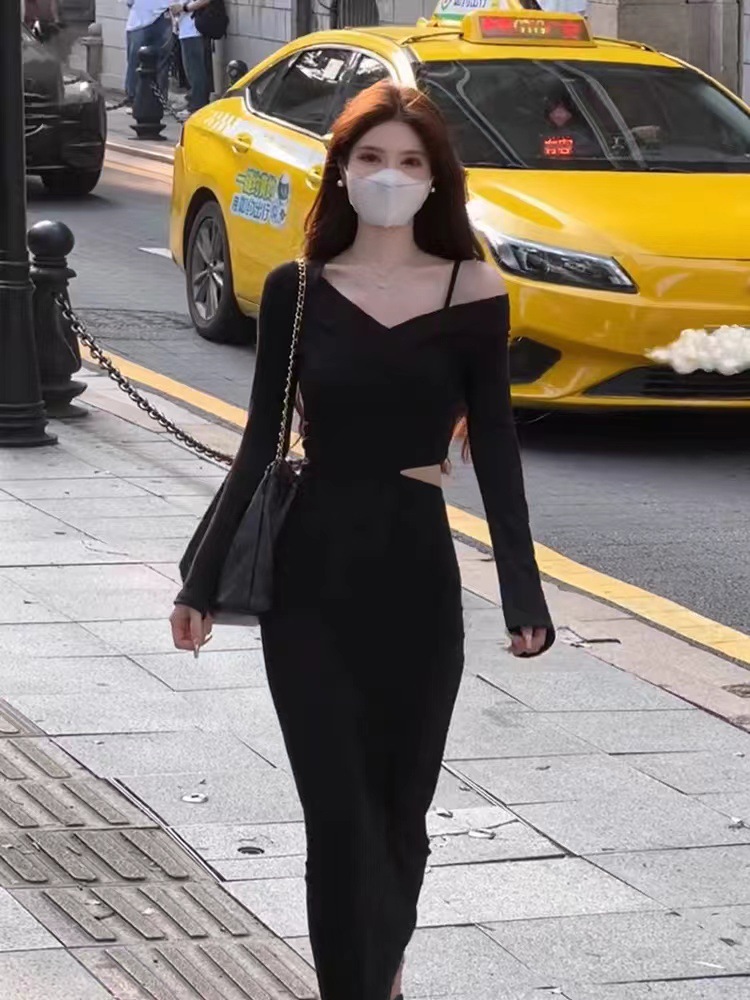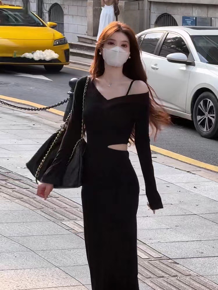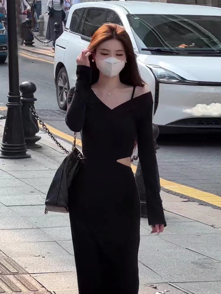 프랑스 스타일 빈티지 할로우 아웃 오픈 허리베이스 원피스 여성 가을과 겨울 인테리어에 오래 원피스 뜨거운 소녀의 슬림 핏 힙합 스커트