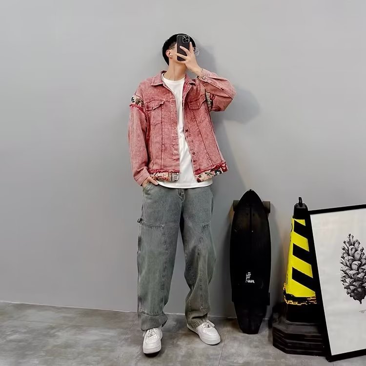 대외 무역 자켓 국경 골동품 스위트 쿨 핑크 스티칭 프록 데님 재킷 남성과 여성의 가을 새로운 미국 빈티지