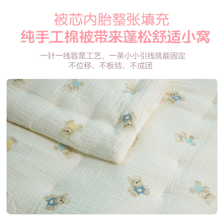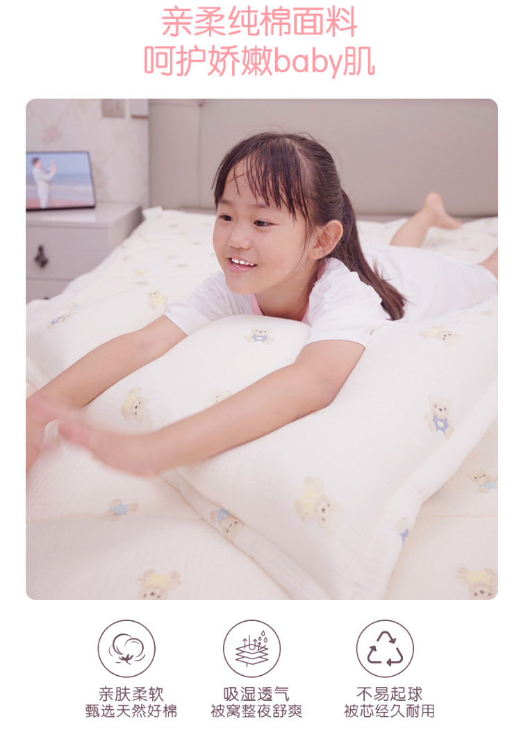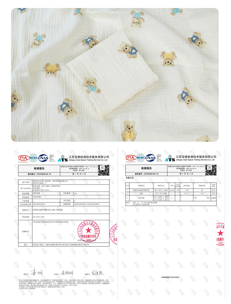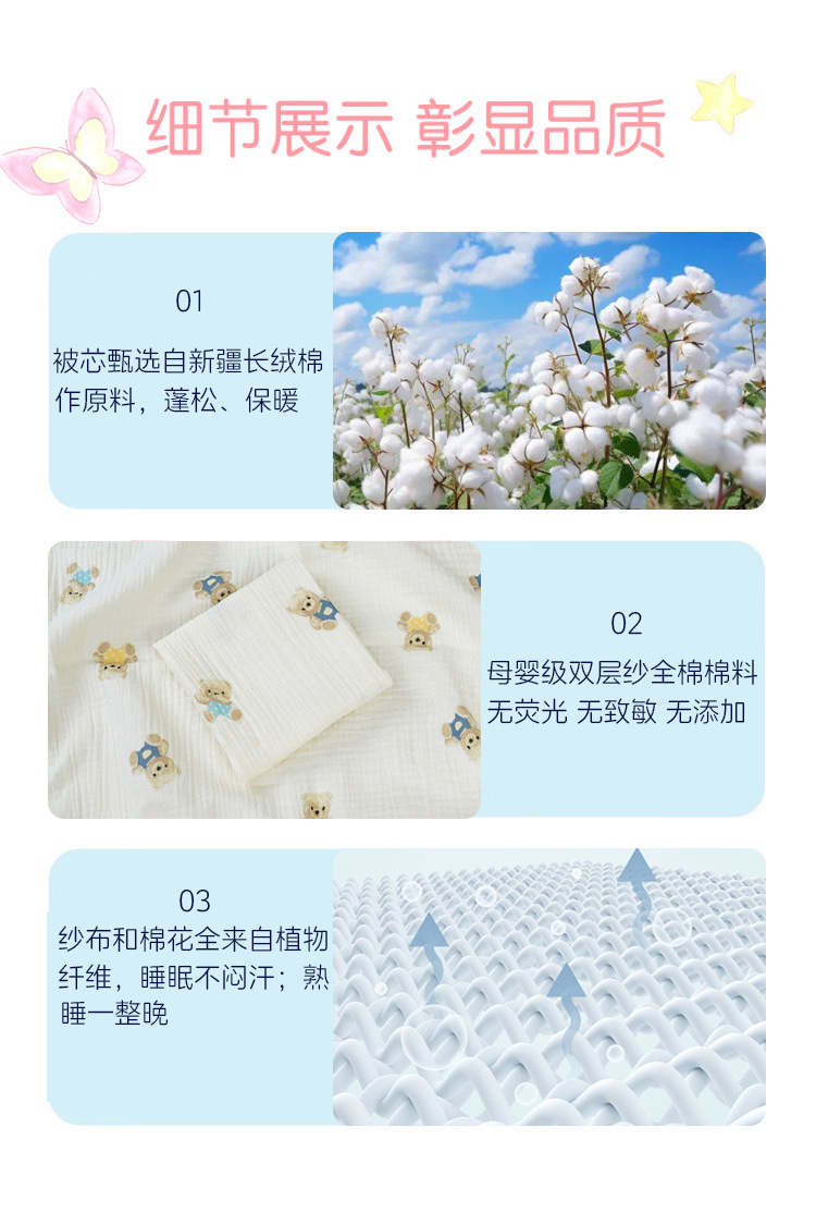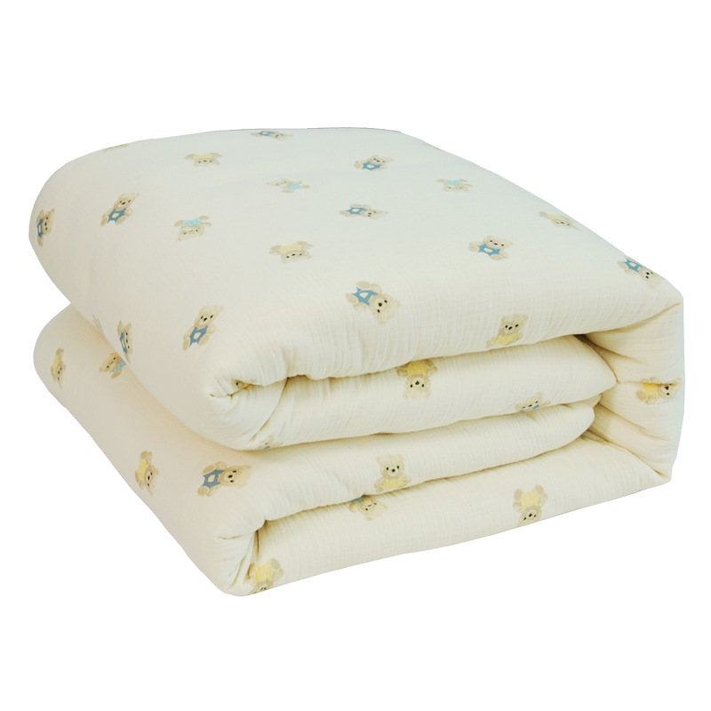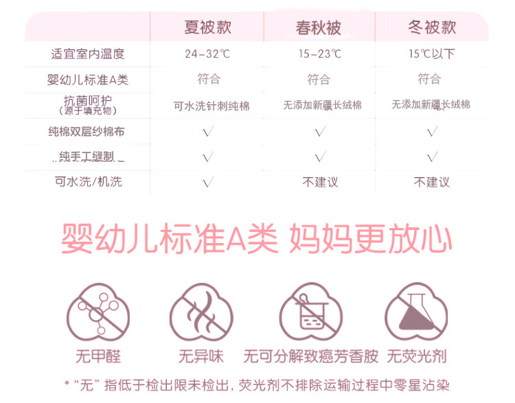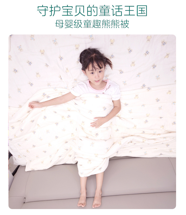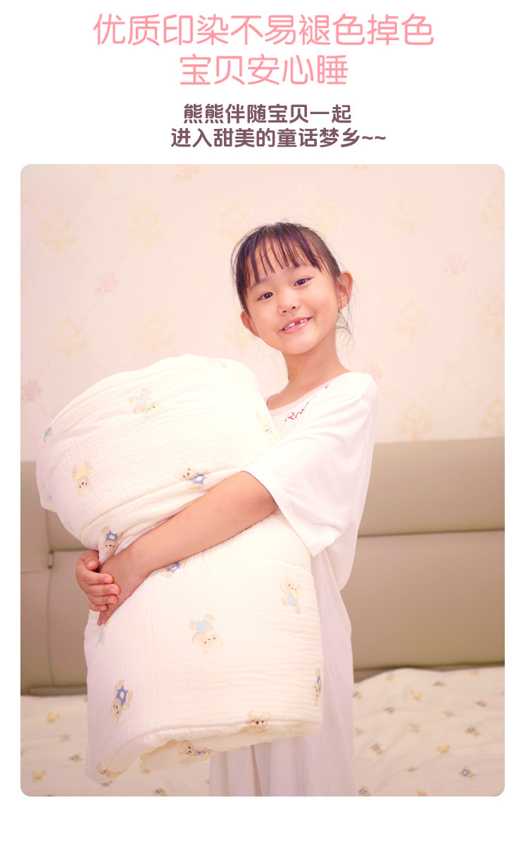 所选棉被面料采用是全棉双层绉布(双层纱),符合国家GB31701-2015标准。面料采用原棉烫染布料,无荧光、无甲醛、无致癌性芳香胺等有害物质,使用中无过敏。