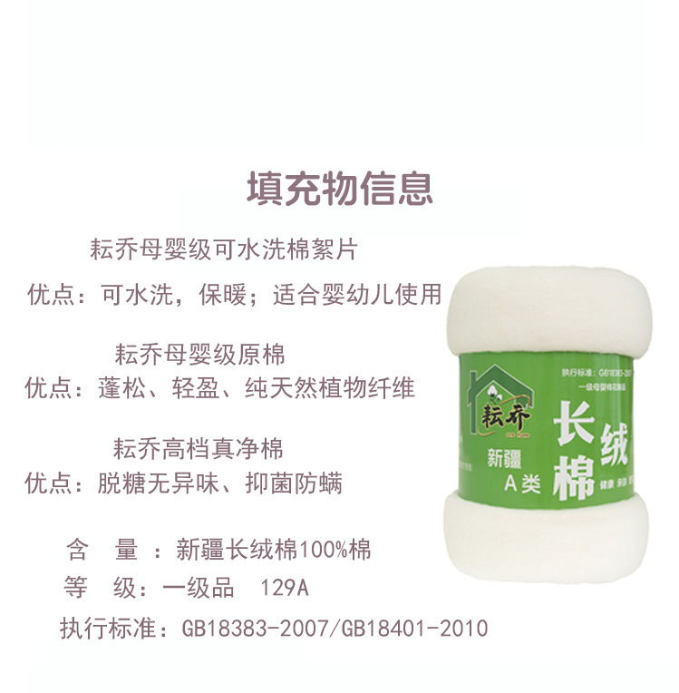 填充物是100%新疆长绒棉129A,符合国家GB18383-2007/GB18401-2010标准。