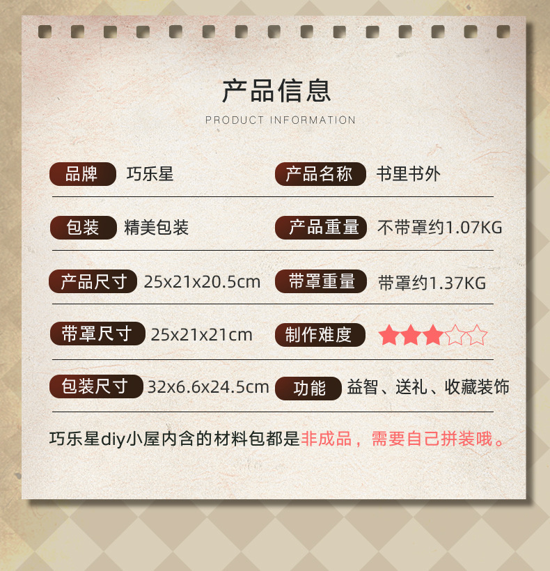 制作说明:制作过程中需要,美工刀、剪刀、镊子、尺子、螺丝刀、酒精胶等工具(工具,酒精胶、音乐机芯需要另外购买)