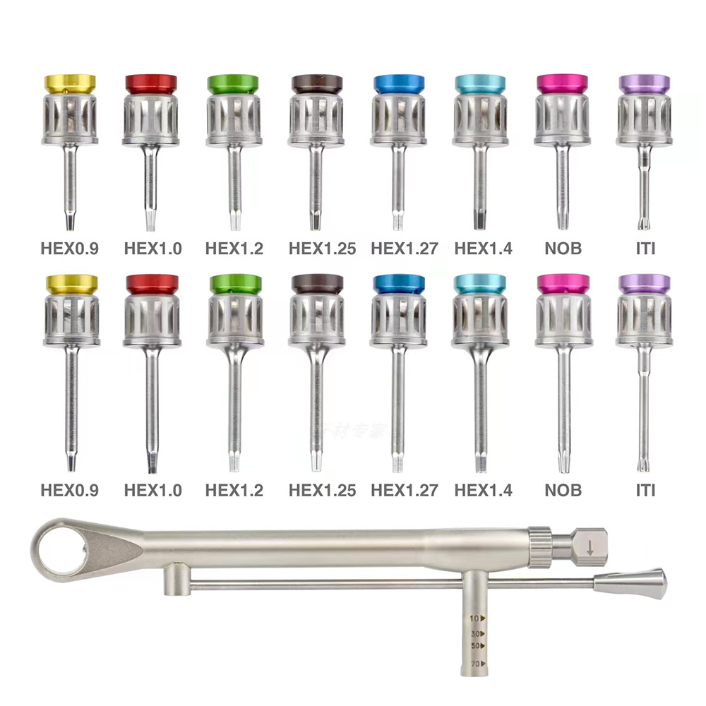 Universal Implant Prosthodontic driver kit 8 short and 8 long shanks. Adjustable torque wrench 10-70Ncm.