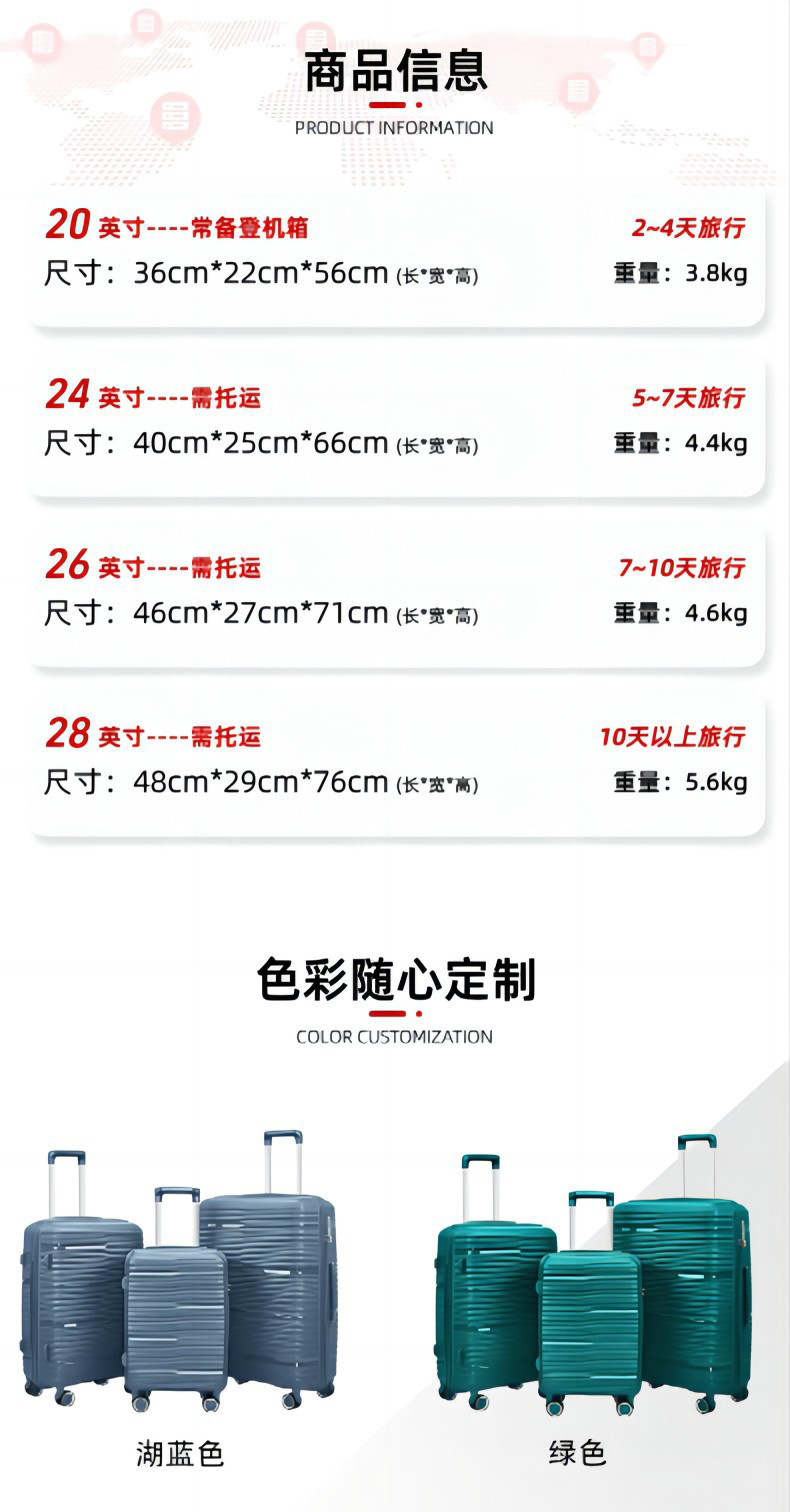 소스 공장 도매 하이 퀄리티 PP 트롤리 케이스 수하물 유니버설 휠 대외 무역 탑승 케이스 TSA 잠금 가방스토어 가기