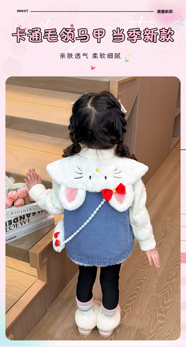 여성의 가을과 겨울 기모 두껍게 데님 조끼 2024 새로운 만화 고양이 토끼 어린이 따뜻한 코트 조수