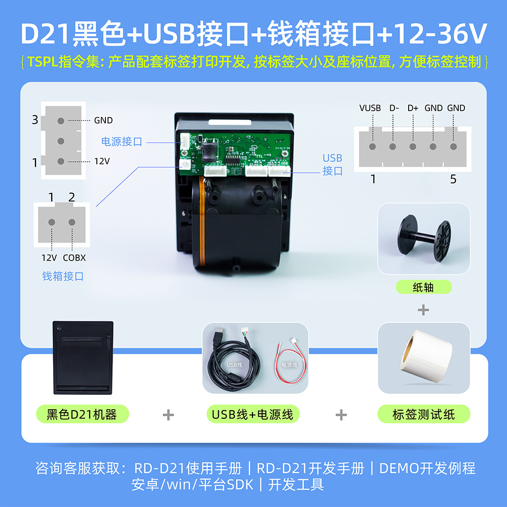 • D21 라벨 기계 + USB 현금 상자 포트 12-36V 특수 라벨 프린트 헤드