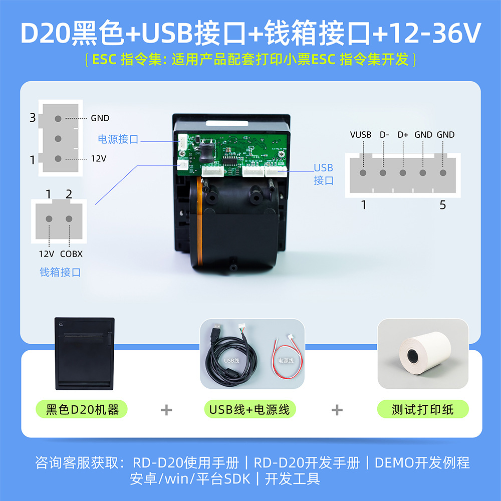 • D20 영수증 기계 + USB 현금 상자 포트 12-36V